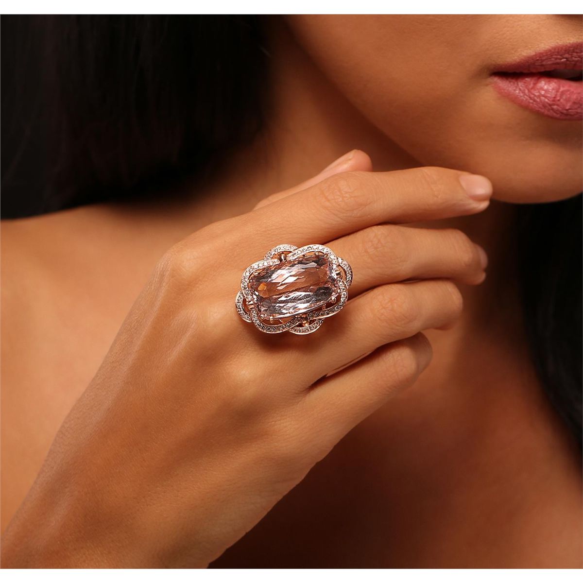 One electronically tested 14KT rose gold Ladies combination cast & assembled ring with a bright polish finish. Condition is new. Identified with markings of "K14". Containing: One prong set rectangular cushion modified mixed cut natural morganite, measuring 22.73 x 13.96 x 9.30mm, approximate weight of 18.86ct., clarity is eye clean, type I, light, brownish, reddish orange color, (GIA rO 3/1), cut is very good. Colored gemstones are presumed to have been subjected to commonly used color/clarity enhancement processes. Seventy-Two prong set round brilliant cut diamonds, measuring 1.30 - 1.30 x 0.78mm (depth est.) approximate. Total Weight of 72 Stones = 0.58ct. Clarity: I-1 to I-2. Color: L - M, Cut is Good. Total Weight of Colored Stones 18.86ct. Total Weight of Diamonds 0.58ct. Total Weight of Ring 13.40 grams. GGL Appraised at $15,325.00.