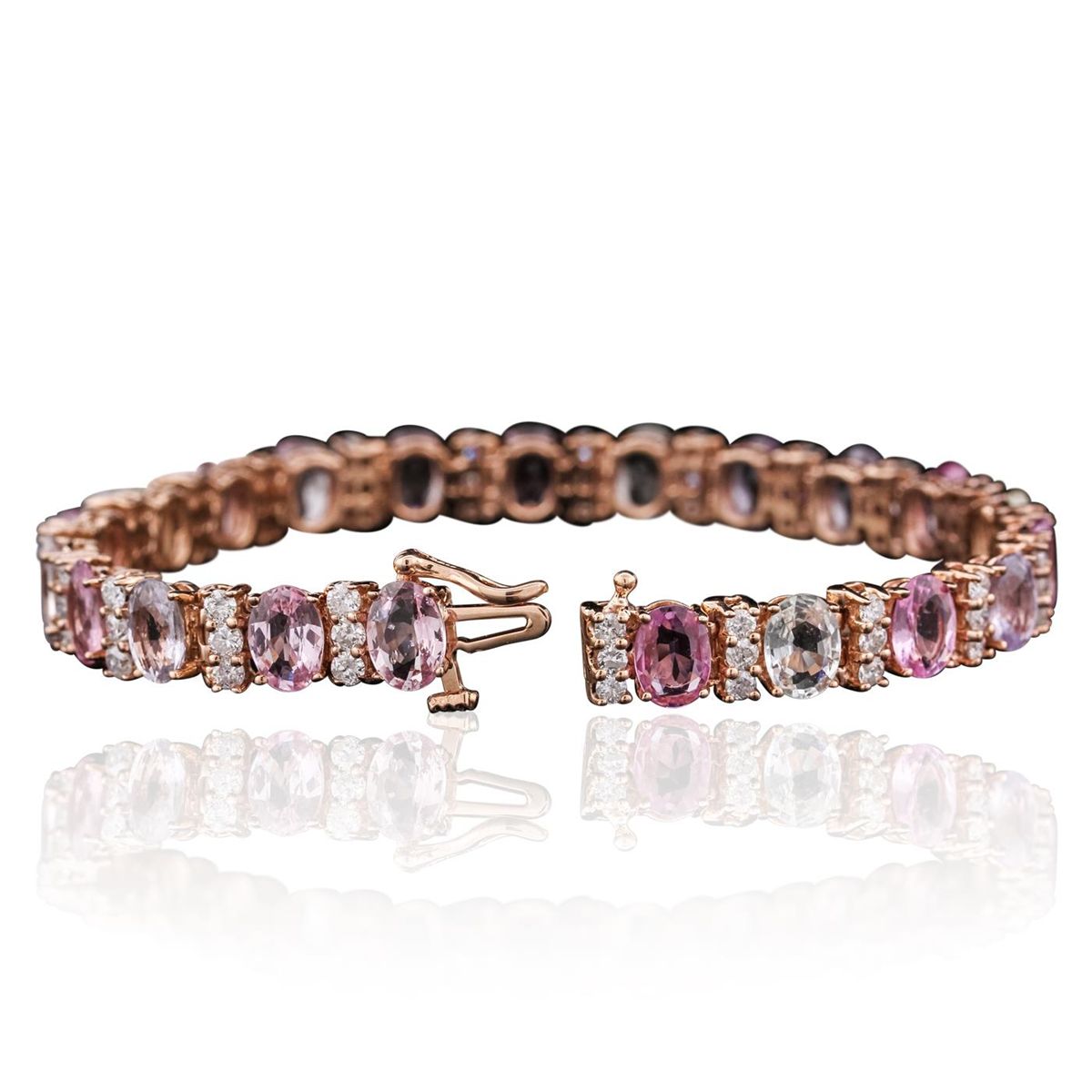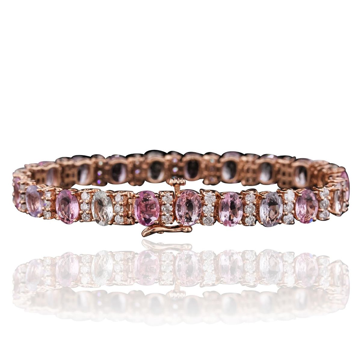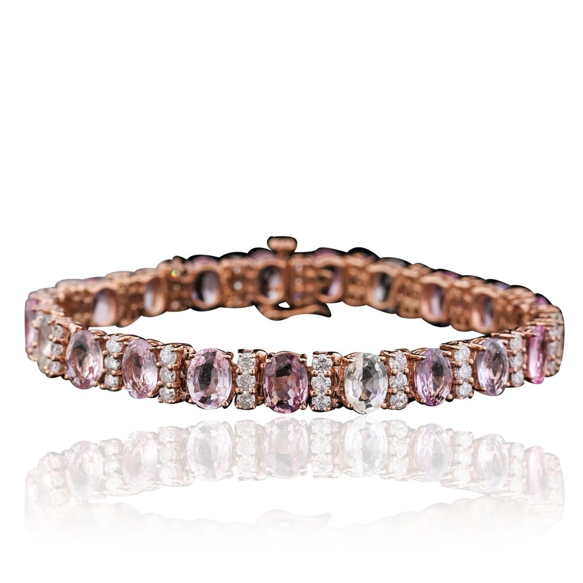 One electronically tested 14KT rose gold ladies combination cast & assembled bracelet with a bright polish finish. Measurements: 6.85" in length. Identified with markings of "14K". Condition is new. Containing: Twenty-one prong set oval modified brilliant cut natural multicolor sapphires, measuring 7.00 x 5.00 x 3.17mm, approximate total weight of 19.11ct., clarity is slightly included, type II, medium light, slightly grayish, purple white and pink color, (GIA PR 4/2), cut is good. Forty-Three prong set round brilliant cut diamonds, measuring 2.20 - 2.20 x 1.32mm (depth est.) approximate total weight of 43 Stones = 2.66ct. Clarity: I-1 to I-2. Color: I - J, Cut is Good. Colored gemstones are presumed to have been subjected to commonly used enhancement processes. All diamonds and colored gemstones are graded in the mounting, unless otherwise stated. Total Weight of Colored Stones 19.11ct. Total Weight of Diamonds 2.66ct. Total Weight of Bracelet 18.20 grams. GGL Appraised at $18,605.00.
