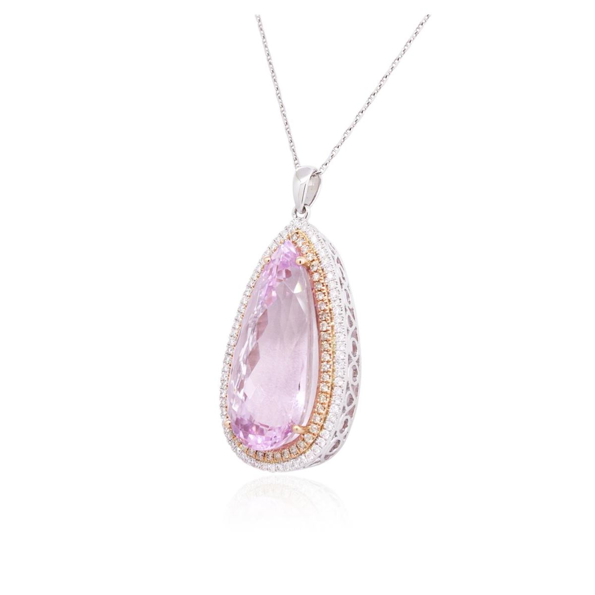 One electronically tested 14KT rose gold ladies combination cast & assembled kunzite and diamond pendant & chain 18.0" long, cable link with a spring ring clasp with a bright polish finish. Identified with markings of "14K". Condition is new. Containing: One prong set pear modified mixed cut natural kunzite, measuring 28.50 x 12.39 x 10.40mm, approximate weight of 19.54ct., clarity is eye clean, type II, light, very slightly grayish, purple color, (GIA P 3/3), cut is good. Sixty-Eight prong set round brilliant cut diamonds, measuring 1.30 - 1.00. x 0.69mm (depth est.) approximate total weight of 68 Stones = 0.37ct. Clarity: SI-2 to I-1. Color: I - J, Cut is Good. Fifty-Two prong set round brilliant cut diamonds, measuring 1.20 - 1.20 x 0.00mm (depth est.) approximate total weight of 52 Stones = 0.00ct. Clarity: SI-2 to I-1, Cut is Good. Colored gemstones are presumed to have been subjected to commonly used enhancement processes. All diamonds and colored gemstones are graded in the mounting, unless otherwise stated. Total Weight of Colored Stones 19.54ct. Total Weight of Diamonds 0.37ct. Total Weight of Pendant & Chain 12.90 grams. GGL Appraised at $7,375.00.