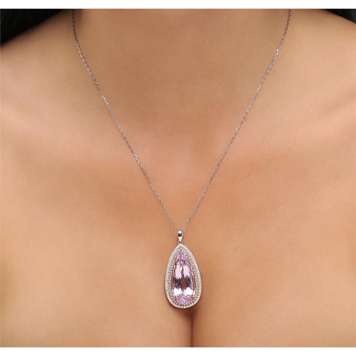 One electronically tested 14KT rose gold ladies combination cast & assembled kunzite and diamond pendant & chain 18.0" long, cable link with a spring ring clasp with a bright polish finish. Identified with markings of "14K". Condition is new. Containing: One prong set pear modified mixed cut natural kunzite, measuring 28.50 x 12.39 x 10.40mm, approximate weight of 19.54ct., clarity is eye clean, type II, light, very slightly grayish, purple color, (GIA P 3/3), cut is good. Sixty-Eight prong set round brilliant cut diamonds, measuring 1.30 - 1.00. x 0.69mm (depth est.) approximate total weight of 68 Stones = 0.37ct. Clarity: SI-2 to I-1. Color: I - J, Cut is Good. Fifty-Two prong set round brilliant cut diamonds, measuring 1.20 - 1.20 x 0.00mm (depth est.) approximate total weight of 52 Stones = 0.00ct. Clarity: SI-2 to I-1, Cut is Good. Colored gemstones are presumed to have been subjected to commonly used enhancement processes. All diamonds and colored gemstones are graded in the mounting, unless otherwise stated. Total Weight of Colored Stones 19.54ct. Total Weight of Diamonds 0.37ct. Total Weight of Pendant & Chain 12.90 grams. GGL Appraised at $7,375.00.