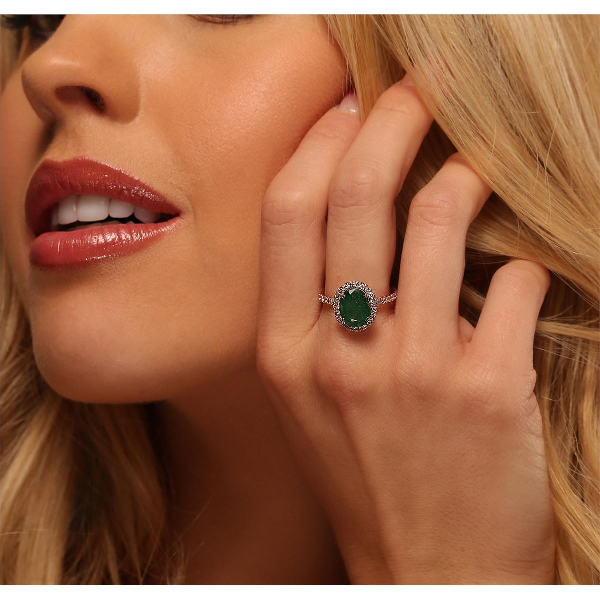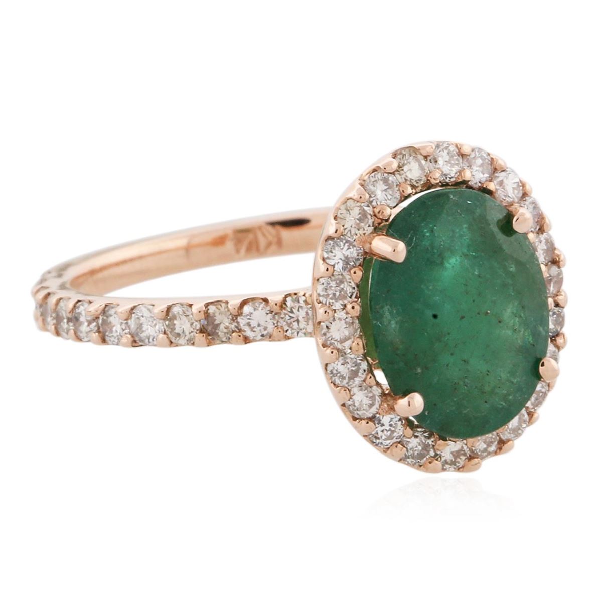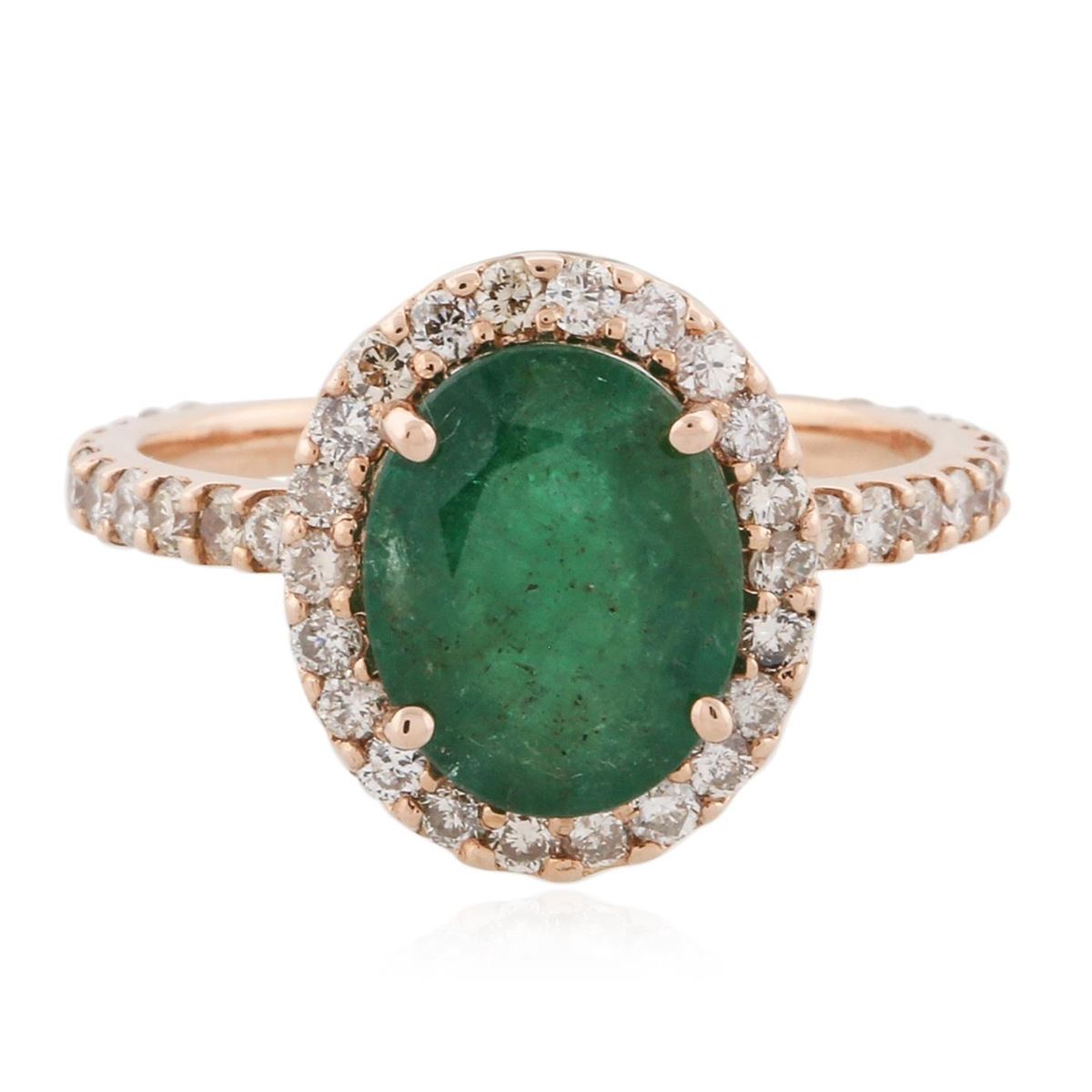 One electronically tested 14KT rose gold Ladies combination cast & assembled fancy ring with a high polish finish. Condition is new. Identified with markings of "14K". Containing: One prong set oval modified brilliant cut natural emerald, measuring 10.00 x 8.00 x 4.60mm, approximate weight of 2.03ct., clarity is heavily included, type III, medium, moderately strong, green color, (GIA G 5/4), cut is good. Colored gemstones are presumed to have been subjected to commonly used and possible undetectable color/clarity enhancement processes. Forty-Six bead set round brilliant cut diamonds, measuring 1.50 - 1.50 x 0.90mm (depth est.) approximate total weight of 46 Stones = 0.57ct. Clarity of SI-2 to I-1, Color of K - M, Cut is Good. Total Weight of Colored Stones 2.03ct. Total Weight of Diamonds 0.57ct. Total Weight of Ring 3.30 grams. GGL Appraised at $6,065.00.