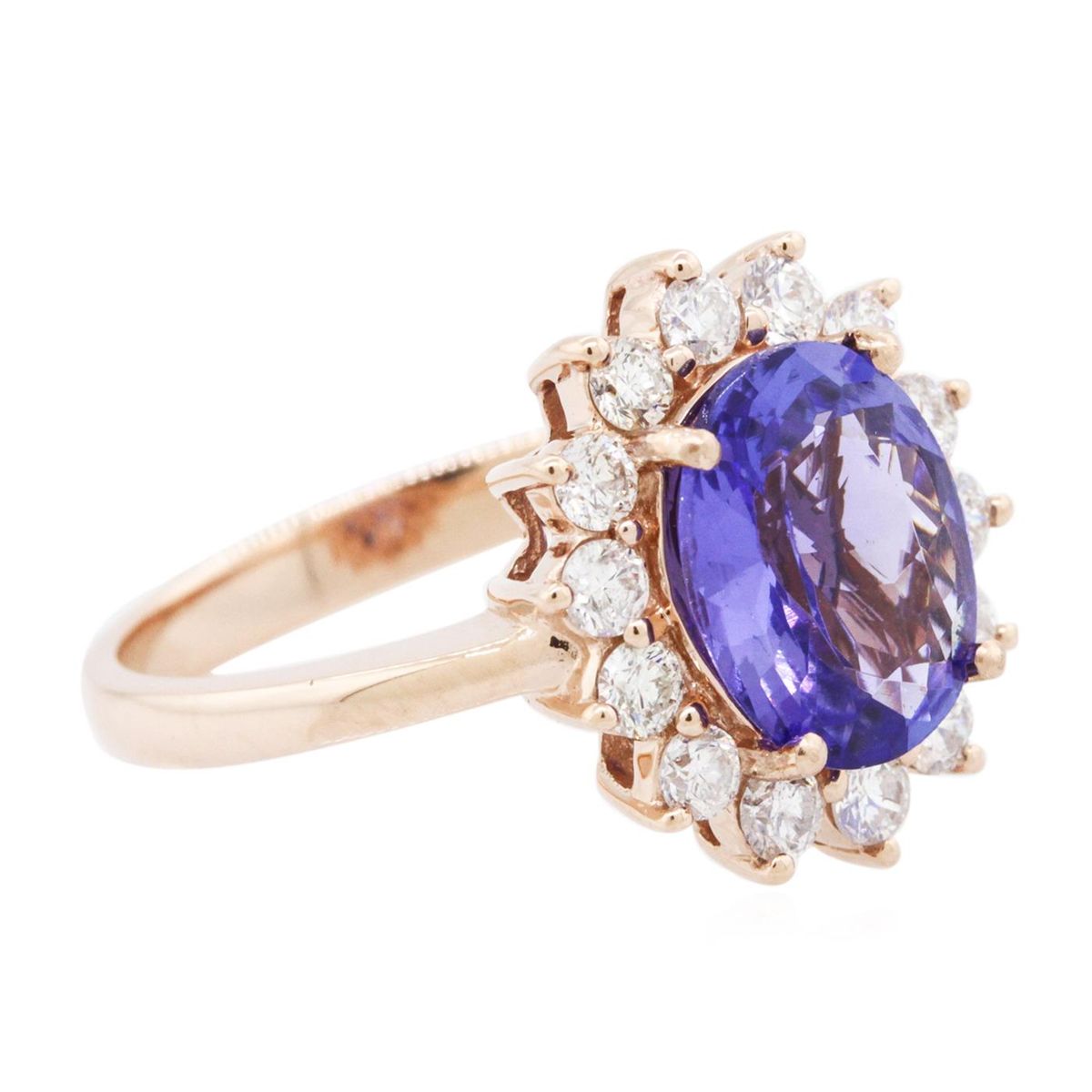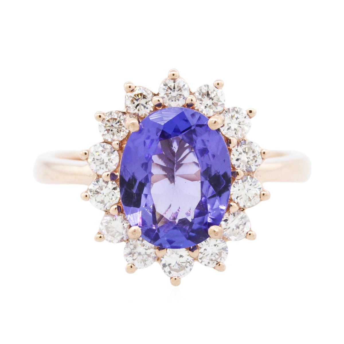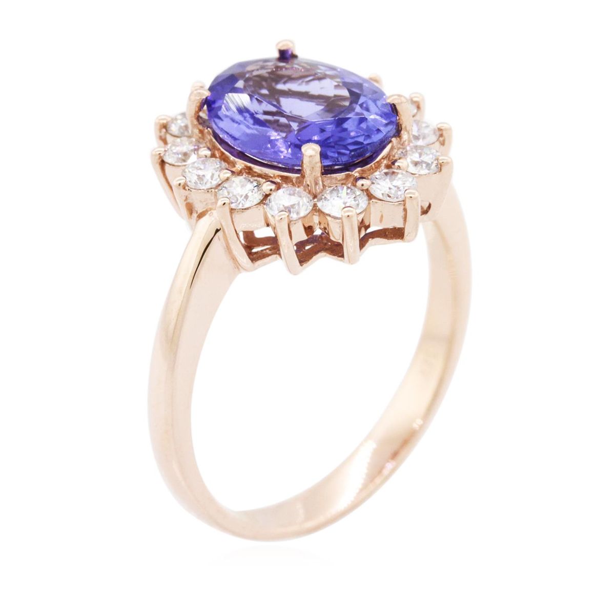 One electronically tested 14KT rose gold ladies combination cast & assembled tanzanite and diamond ring with a flat shank with a bright polish finish. Identified with markings of "14K". Condition is new. Containing: One prong set oval modified brilliant cut natural tanzanite, measuring 10.47 x 7.84 x 3.66mm, approximate weight of 2.06ct., clarity is eye clean, type I, medium, moderately strong, bluish violet color, (GIA bV 5/4), cut is good. Fourteen prong set round brilliant cut diamonds, measuring 2.10 - 2.10 x 1.26mm (depth est.) approximate total weight of 14 Stones = 0.48ct. Clarity: SI-1 to I-1. Color: J - K, Cut is Good. Colored gemstones are presumed to have been subjected to commonly used enhancement processes. All diamonds and colored gemstones are graded in the mounting, unless otherwise stated total weight of Colored Stones 2.06ct. Total Weight of Diamonds 0.48ct. Total Weight of Ring 4.10 grams. GGL Appraised at $5,555.00.
