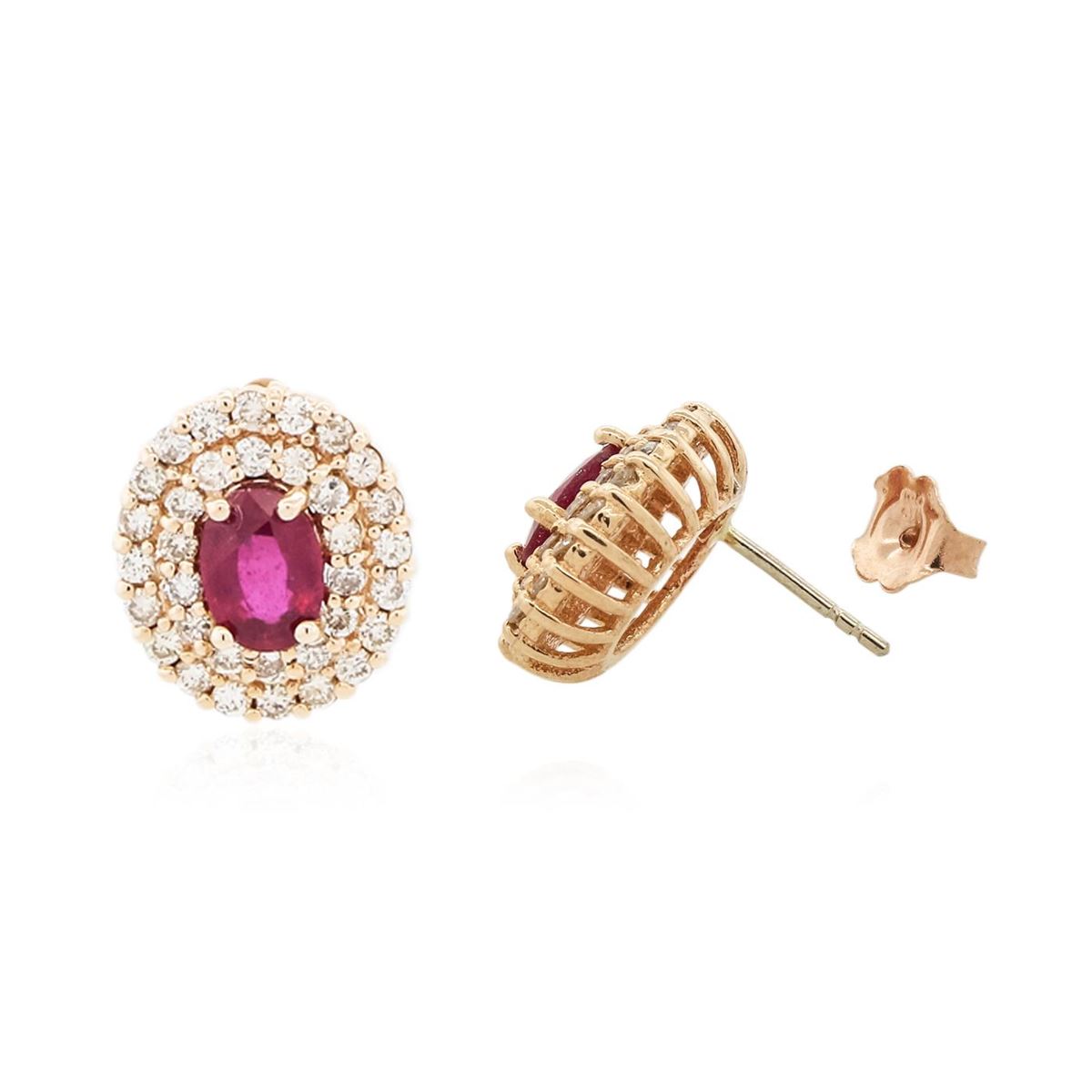 One pair electronically tested 14KT rose gold Ladies combination cast & assembled stud earrings with friction posts with a bright polish finish. Condition is new. Identified with markings of "14K". Containing: Two prong set oval modified brilliant cut natural rubies, measuring 7.11 x 5.20 x 3.00mm, approximate. Total Weight of 2.07ct., clarity is moderately included, type II, medium, moderately strong, strongly purplish red color, (GIA stpR 5/4), cut is good. Colored gemstones are presumed to have been subjected to commonly used color/clarity enhancement processes. Seventy-Two prong set round brilliant cut diamonds, measuring 1.50 - 1.50 x 0.90mm (depth est.) approximate. Total Weight of 72 Stones = 1.41ct. Clarity: I-1 to I-2. Color: K - M, Cut is Good. Total Weight of Colored Stones 2.07ct. Total Weight of Diamonds 1.41ct. Total Weight of Earrings 5.00 grams. GGL Appraised at $4,715.00.