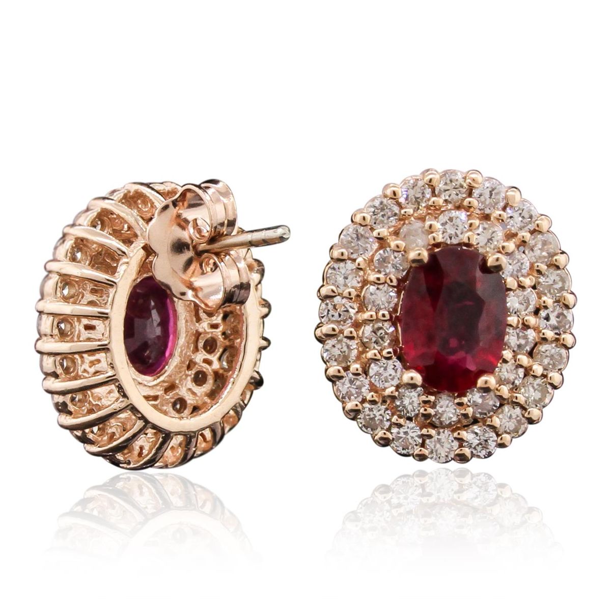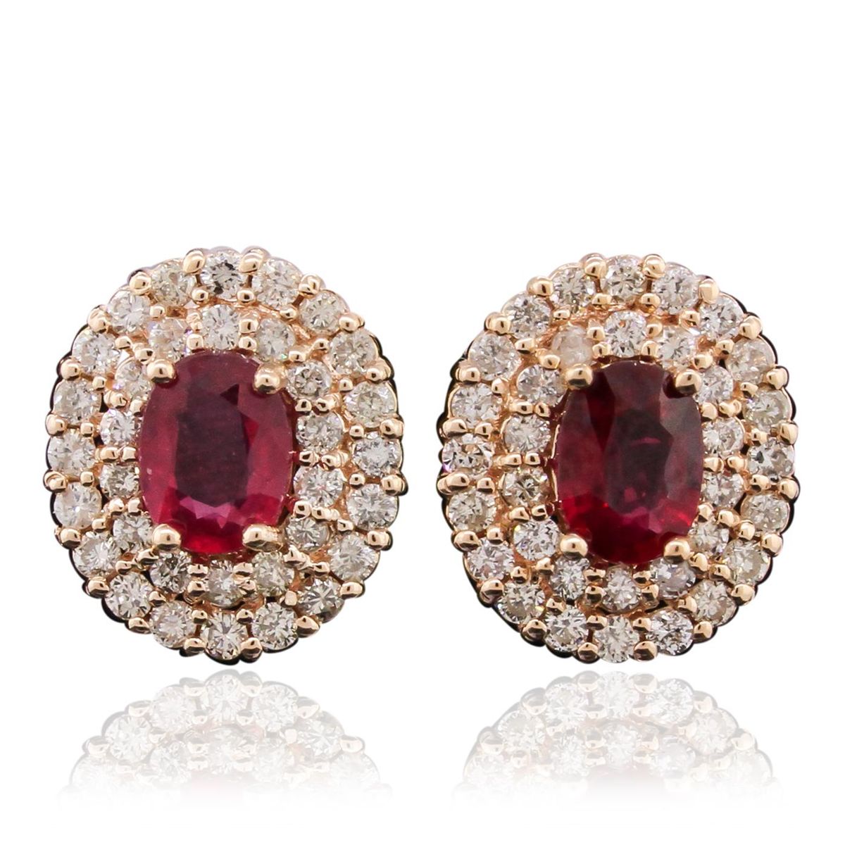One pair electronically tested 14KT rose gold Ladies combination cast & assembled stud earrings with friction posts with a bright polish finish. Condition is new. Identified with markings of "14K". Containing: Two prong set oval modified brilliant cut natural rubies, measuring 7.11 x 5.20 x 3.10mm, approximate. Total Weight of 2.07ct., clarity is moderately included, type II, medium, moderately strong, strongly purplish red color, (GIA stpR 5/4), cut is good. Colored gemstones are presumed to have been subjected to commonly used color/clarity enhancement processes. Seventy-Two prong set round brilliant cut diamonds, measuring 1.50 - 1.50 x 0.90mm (depth est.) approximate. Total Weight of 72 Stones = 1.41ct. Clarity: I-1 to I-2. Color: K - M, Cut is Good. Total Weight of Colored Stones 2.07ct. Total Weight of Diamonds 1.41ct. Total Weight of Earrings 5.00 grams. GGL Appraised at $4,715.00.