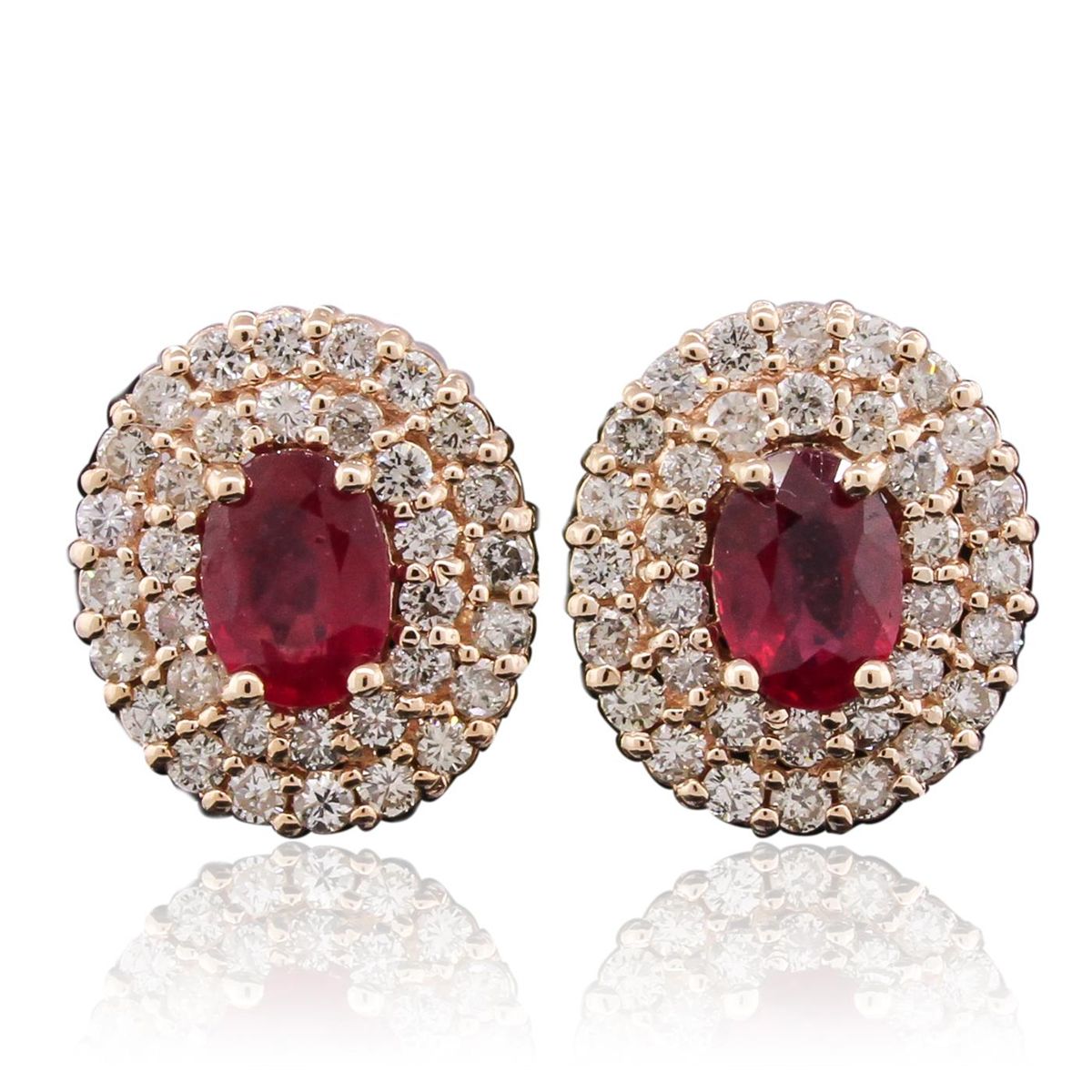 One pair electronically tested 14KT rose gold Ladies combination cast & assembled stud earrings with friction posts with a bright polish finish. Condition is new. Identified with markings of "14K". Containing: Two prong set oval modified brilliant cut natural rubies, measuring 7.11 x 5.20 x 3.00mm, approximate. Total Weight of 2.07ct., clarity is moderately included, type II, medium, moderately strong, strongly purplish red color, (GIA stpR 5/4), cut is good. Colored gemstones are presumed to have been subjected to commonly used color/clarity enhancement processes. Seventy-Two prong set round brilliant cut diamonds, measuring 1.50 - 1.50 x 0.90mm (depth est.) approximate. Total Weight of 72 Stones = 1.41ct. Clarity: I-1 to I-2. Color: K - M, Cut is Good. Total Weight of Colored Stones 2.07ct. Total Weight of Diamonds 1.41ct. Total Weight of Earrings 5.00 grams. GGL Appraised at $4,715.00.