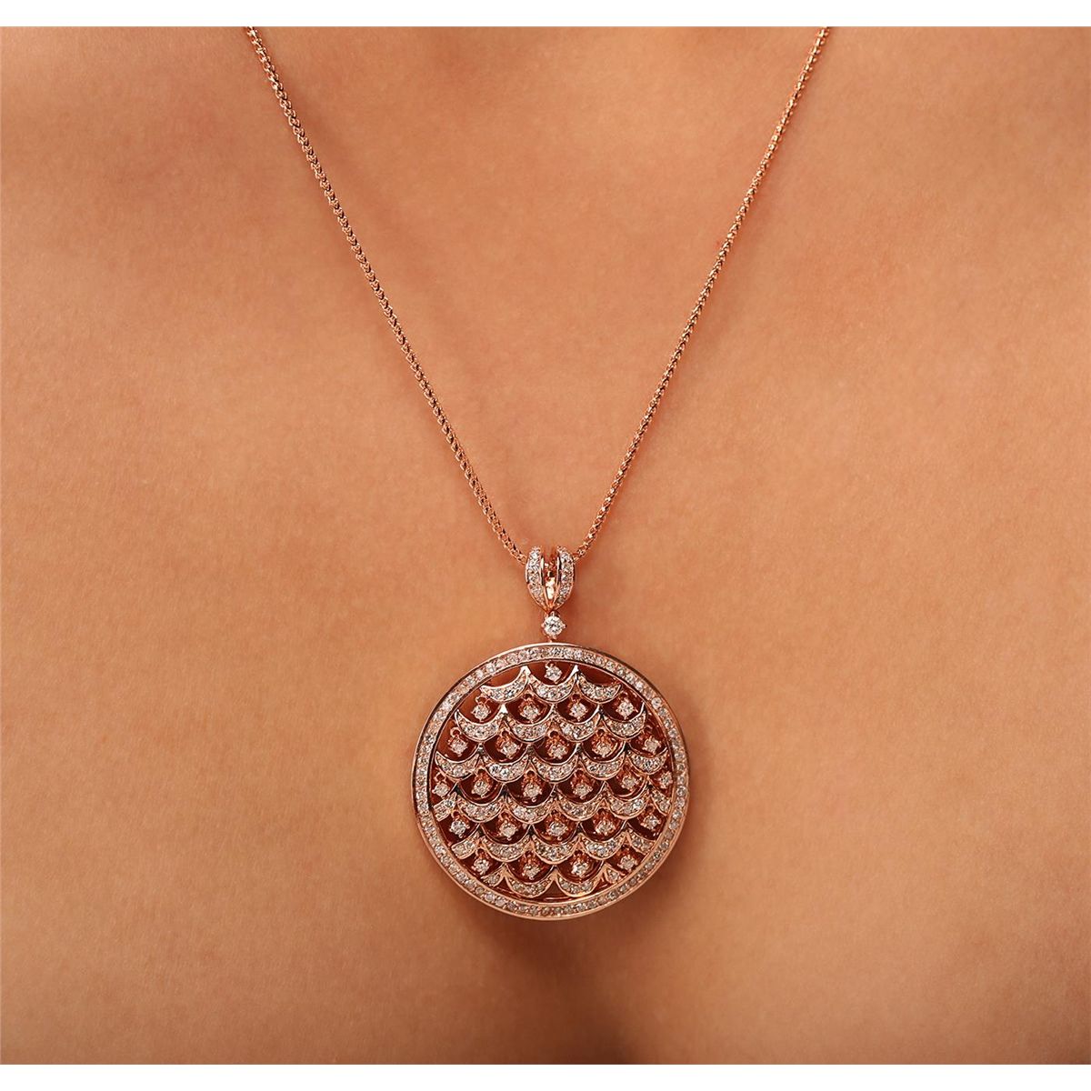 One electronically tested 14KT rose gold ladies cast & assembled diamond pendant with chain. Condition is new, good workmanship. The pendant features a diamond set lattice disc and completed by a diamond set bail. The pendant is supported by an eighteen inch length 14KT rose gold designer style chain terminating in a lobster claw clasp. Bright polish finish. Identified with markings of "14K". Containing: One Hundred Eighty-One prong & bead set round brilliant cut diamonds, measuring 2.30 - 1.10 x 1.02mm (depth est.) approximate. Total Weight of 181 Stones = 2.14ct. Graded in the setting. Clarity: SI-2 to I-2 . Color: G - I. Total Weight of Diamonds 2.14ct.. Total Weight of Pendant With Chain 22.90gm. AIG Appraised at $10,235.00.