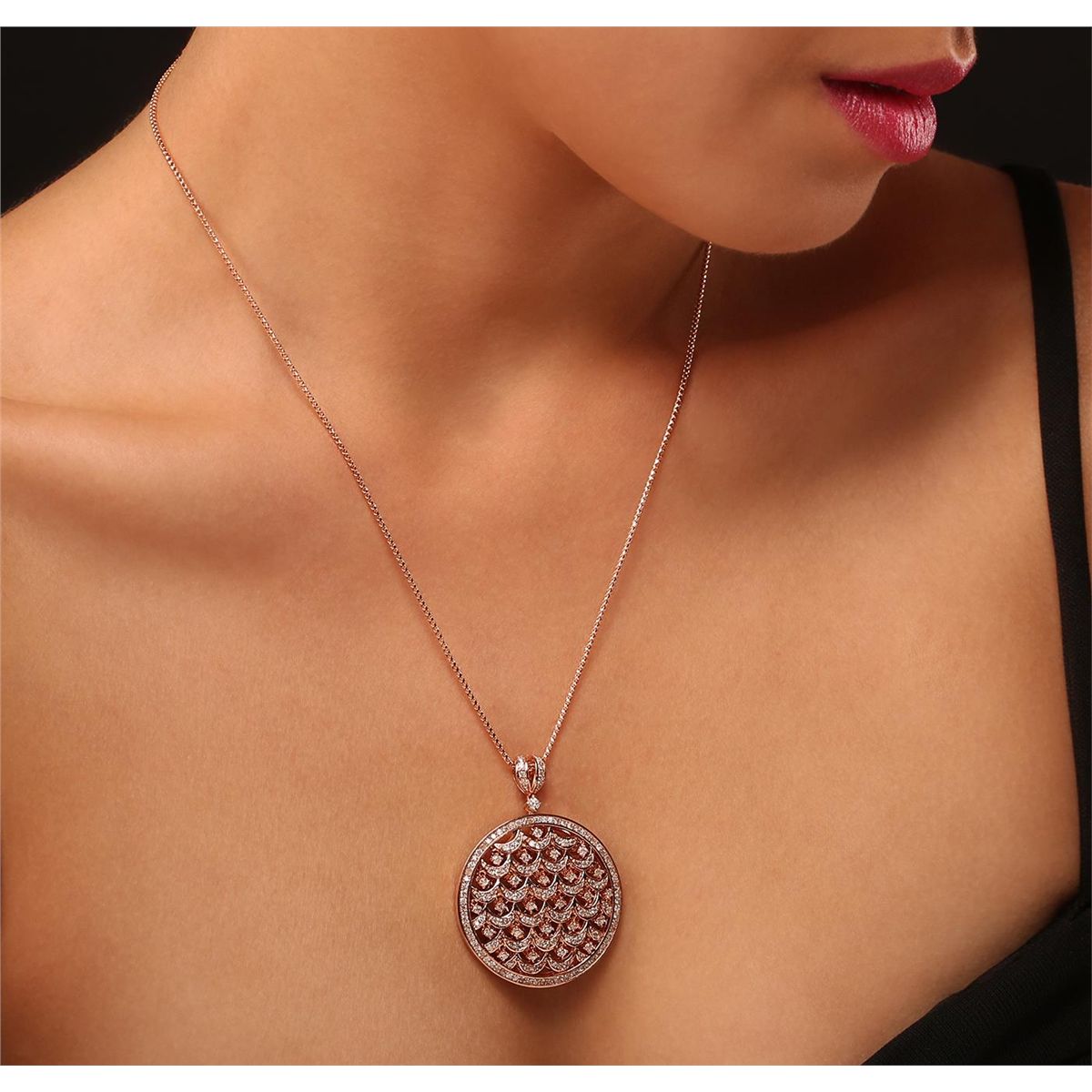 One electronically tested 14KT rose gold ladies cast & assembled diamond pendant with chain. Condition is new, good workmanship. The pendant features a diamond set lattice disc and completed by a diamond set bail. The pendant is supported by an eighteen inch length 14KT rose gold designer style chain terminating in a lobster claw clasp. Bright polish finish. Identified with markings of "14K". Containing: One Hundred Eighty-One prong & bead set round brilliant cut diamonds, measuring 2.30 - 1.10 x 1.02mm (depth est.) approximate. Total Weight of 181 Stones = 2.14ct. Graded in the setting. Clarity: SI-2 to I-2 . Color: G - I. Total Weight of Diamonds 2.14ct.. Total Weight of Pendant With Chain 22.90gm. AIG Appraised at $10,235.00.