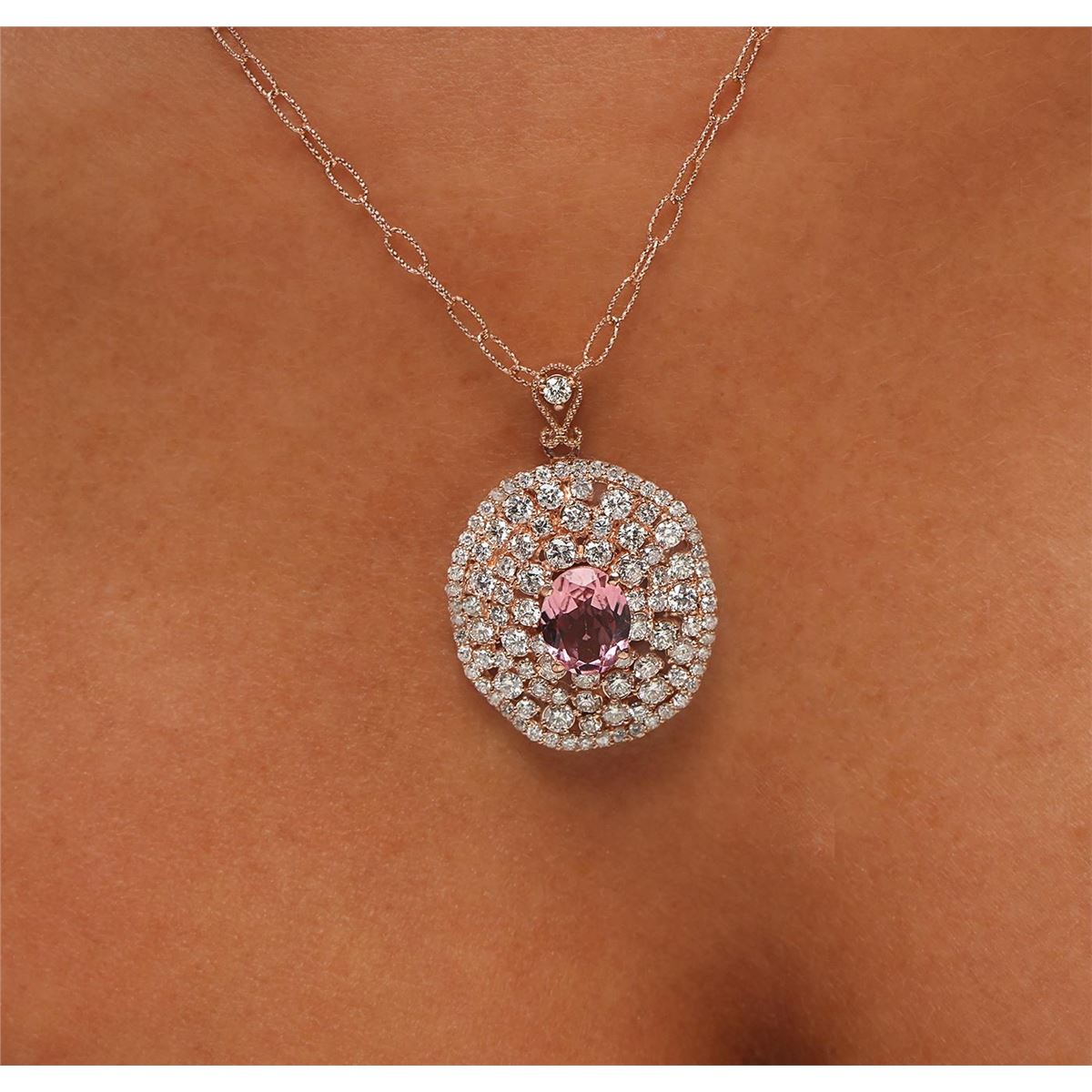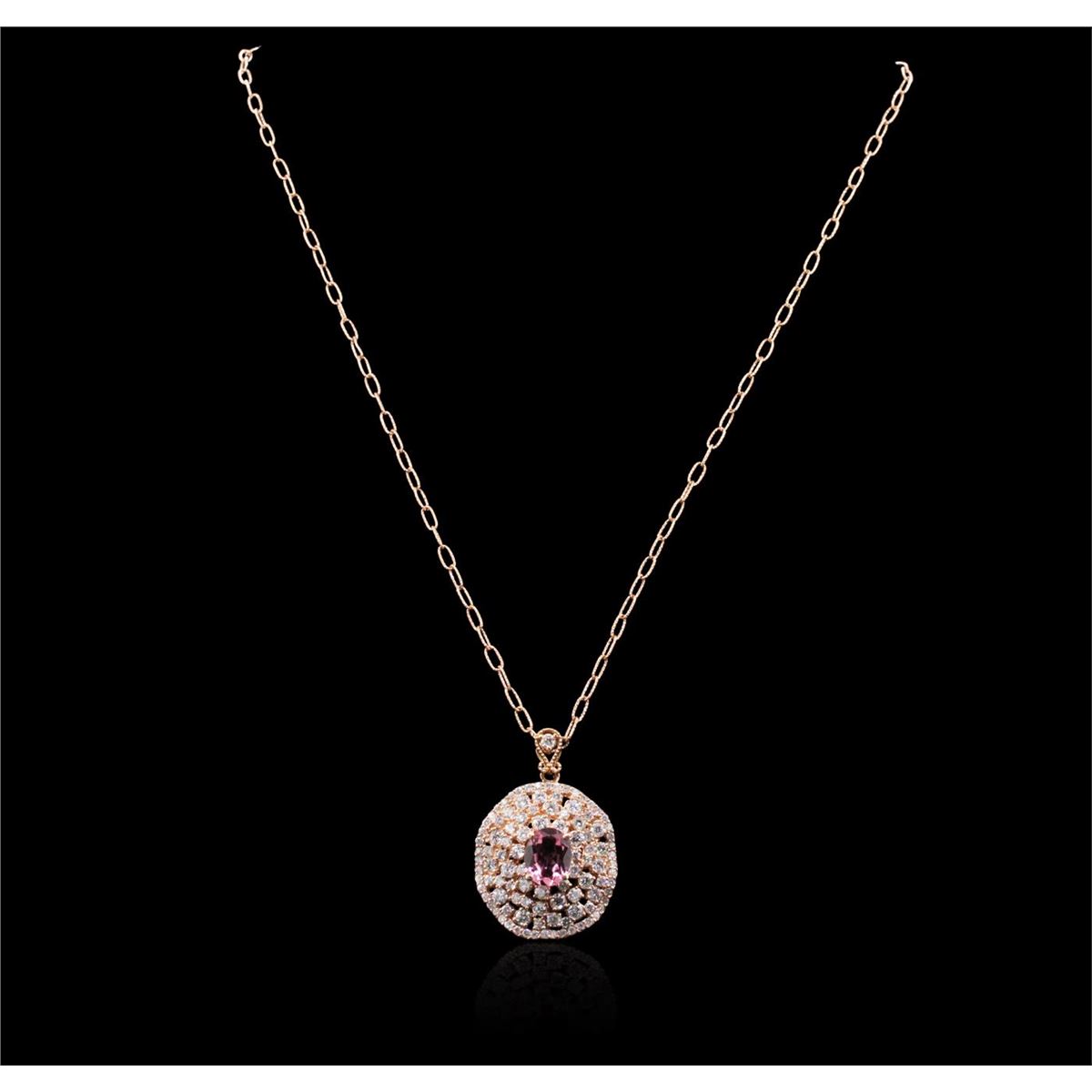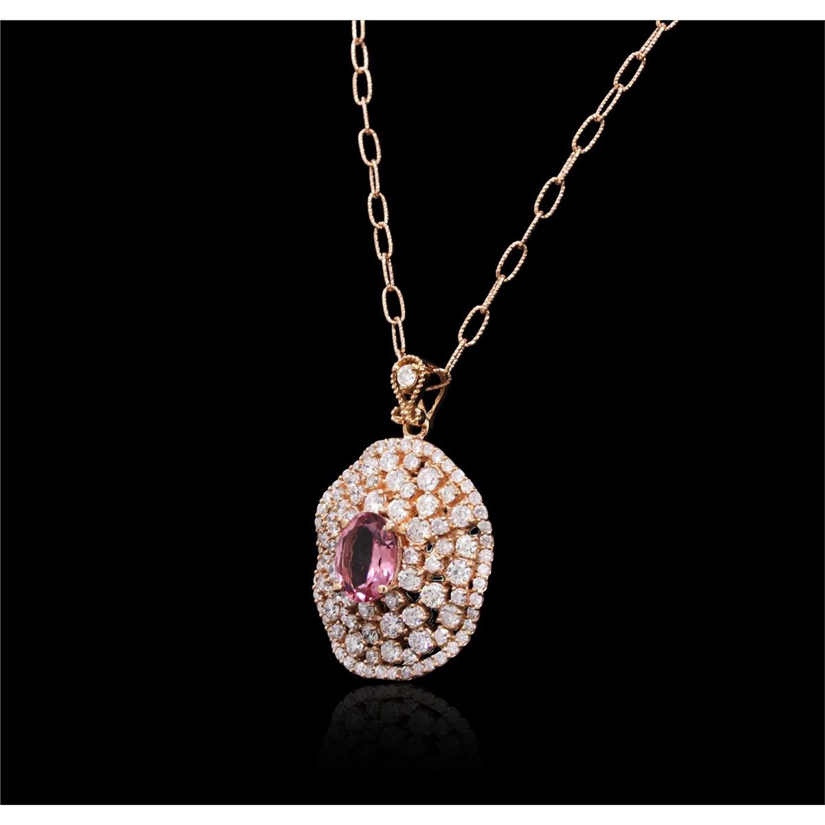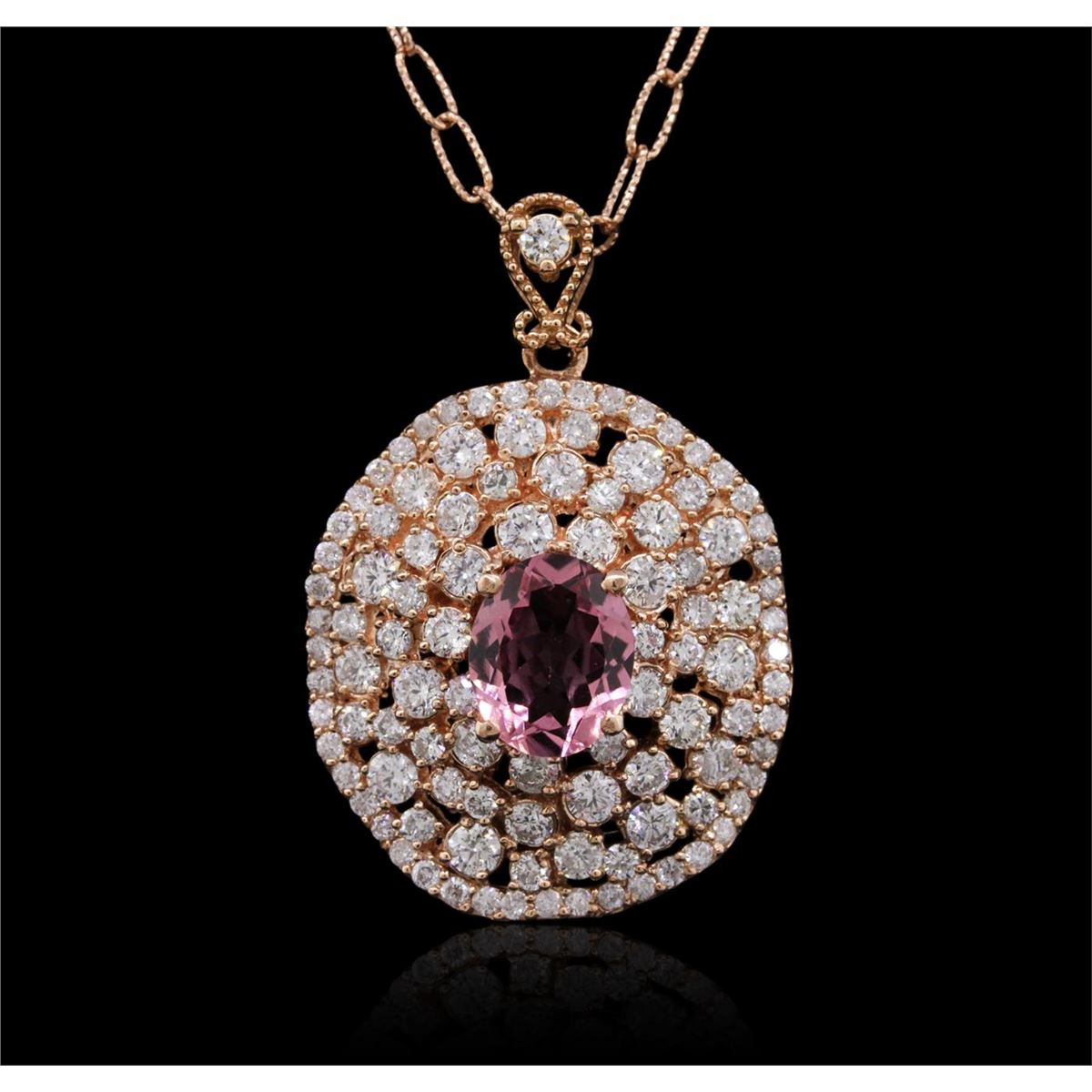 One electronically tested 14KT rose gold ladies cast & assembled pink tourmaline and diamond pendant with chain. The pendant features a pink tourmaline set within elaborate diamond bezels, completed by a diamond set bail. The pendant is supported by an eighteen inch length 14KT rose gold link chain with milgrain detailing, terminating in a lobster claw clasp. Bright polish finish with milgrain detailing. Identified with markings of "K14". Condition is new, good workmanship. Containing: One prong set oval mixed cut natural pink tourmaline, measuring 9.90 x 8.00 x 4.15mm, 6% bulge factor, approximate weight of 2.16ct., clarity is eye clean, medium dark, moderately strong, pink color, (GIA Pk 6/4), cut is good. Transmitting light with no distortion, transparent. Graded in the setting. Forty-One prong set round brilliant cut diamonds, measuring 2.70 - 2.20 x 1.47mm (depth est.) approximate total weight of 41 Stones = 2.32ct. Graded in the setting. Clarity: SI-1 to I-1. Color: G - I Seventeen prong set round brilliant cut diamonds, measuring 1.90 - 1.70 x 1.08mm (depth est.) approximate total weight of 17 Stones = 0.45ct. Graded in the setting. Clarity: SI-1 to I-1. Color: G - I Forty-Eight prong set round brilliant cut diamonds, measuring 1.50 - 1.40 x 0.87mm (depth est.) approximate total weight of 48 Stones = 0.64ct. Graded in the setting. Clarity: SI-1 to I-1. Color: G - I. Total Weight of Colored Stones 2.16ct. Total Weight of Diamonds 3.41ct. Total Weight of Pendant With Chain 12.92 grams. AIG Appraised at $12,795.00.
