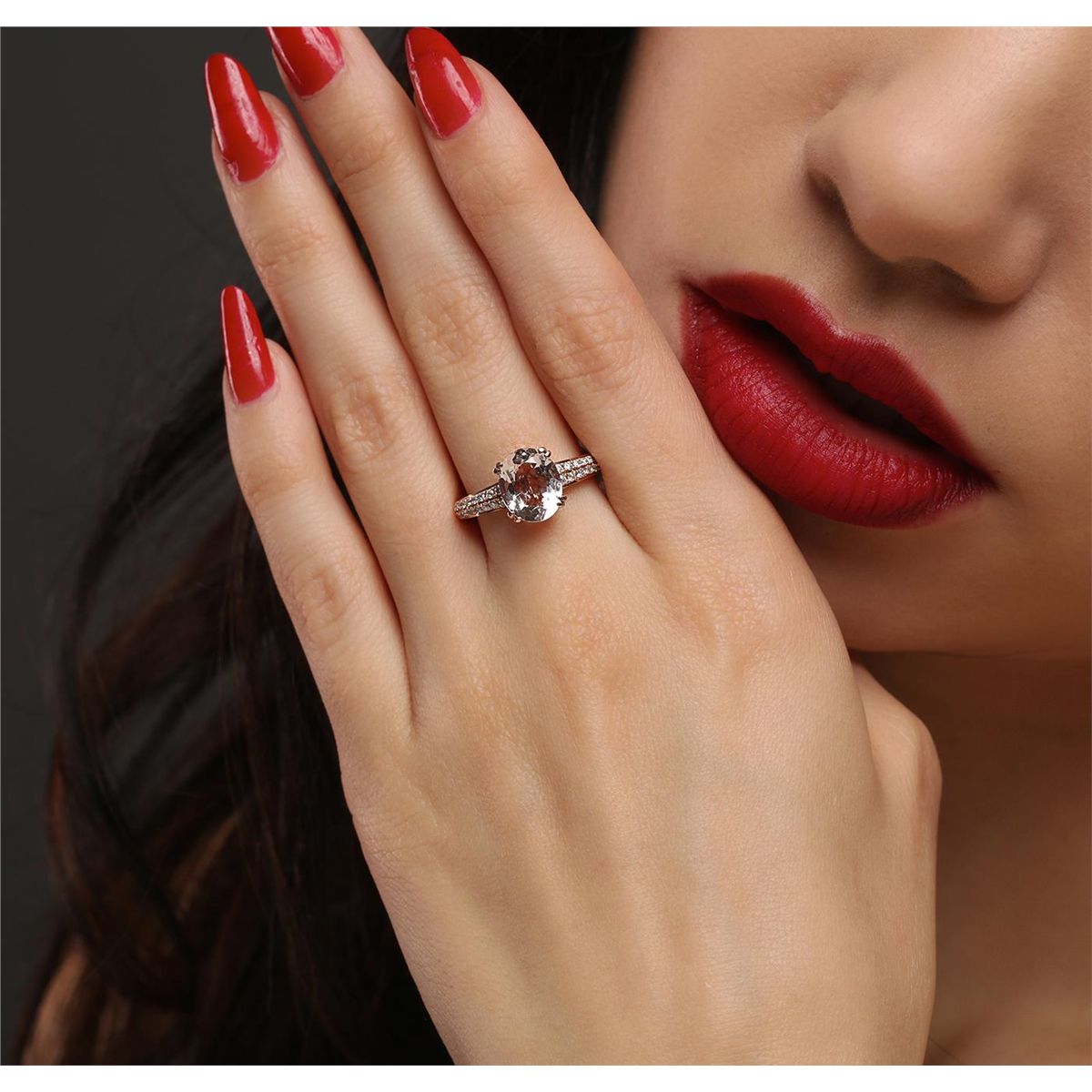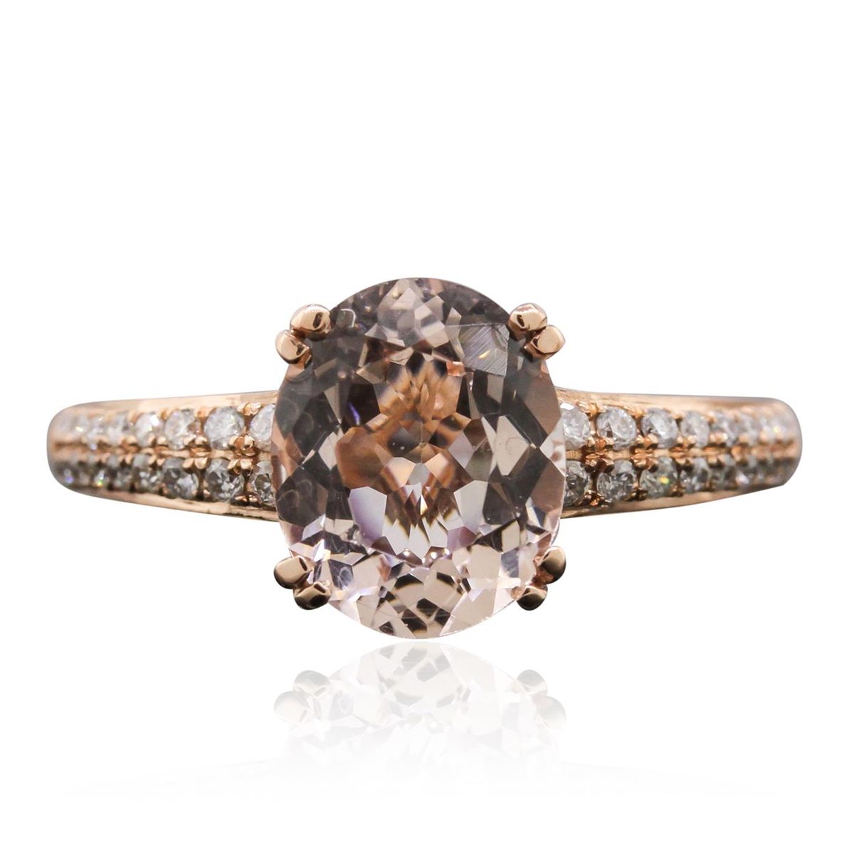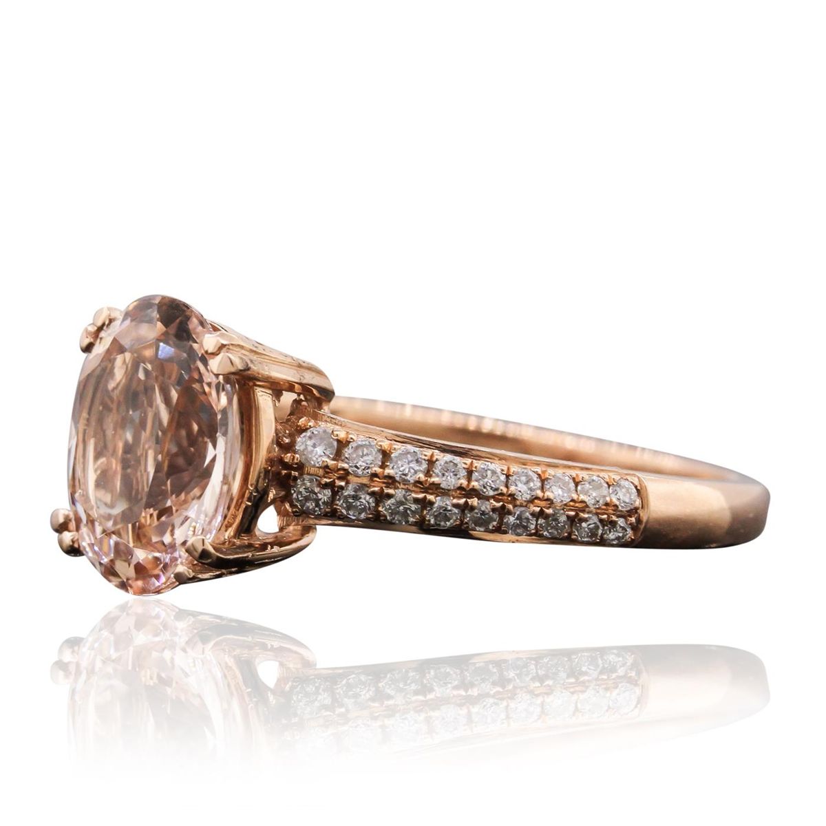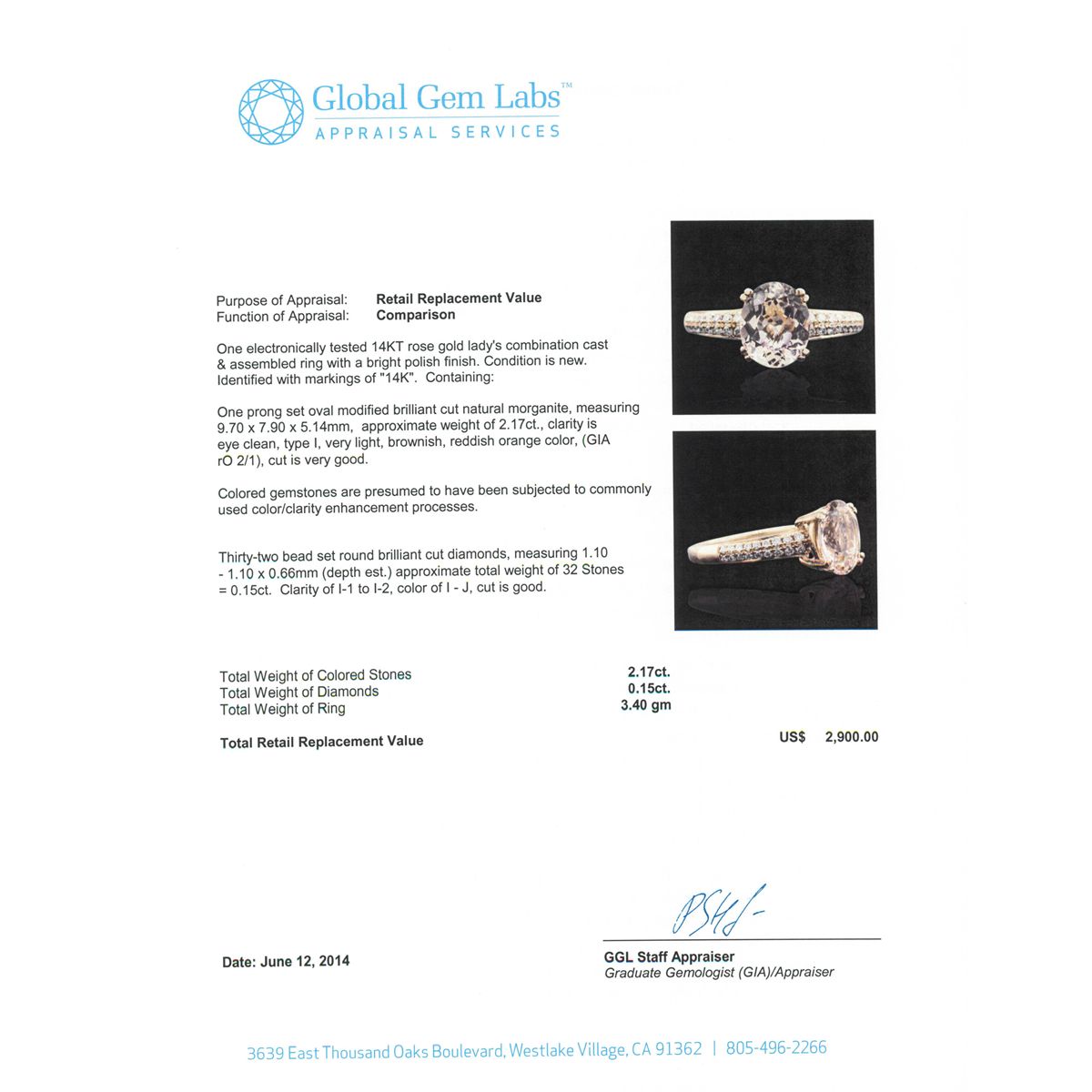 One electronically tested 14KT rose gold Ladies combination cast & assembled ring with a bright polish finish. Condition is new. Identified with markings of "14K". Containing: One prong set oval modified brilliant cut natural morganite, measuring 9.70 x 7.90 x 5.14mm, approximate weight of 2.17ct., clarity is eye clean, type I, very light, brownish, reddish orange color, (GIA rO 2/1), cut is very good. Colored gemstones are presumed to have been subjected to commonly used color/clarity enhancement processes. Thirty-Two bead set round brilliant cut diamonds, measuring 1.10 - 1.10 x 0.66mm (depth est.) approximate. Total Weight of 32 Stones = 0.15ct. Clarity: I-1 to I-2. Color: I - J, Cut is Good. Total Weight of Colored Stones 2.17ct. Total Weight of Diamonds 0.15ct. Total Weight of Ring 3.40 grams. GGL Appraised at $2,900.00.