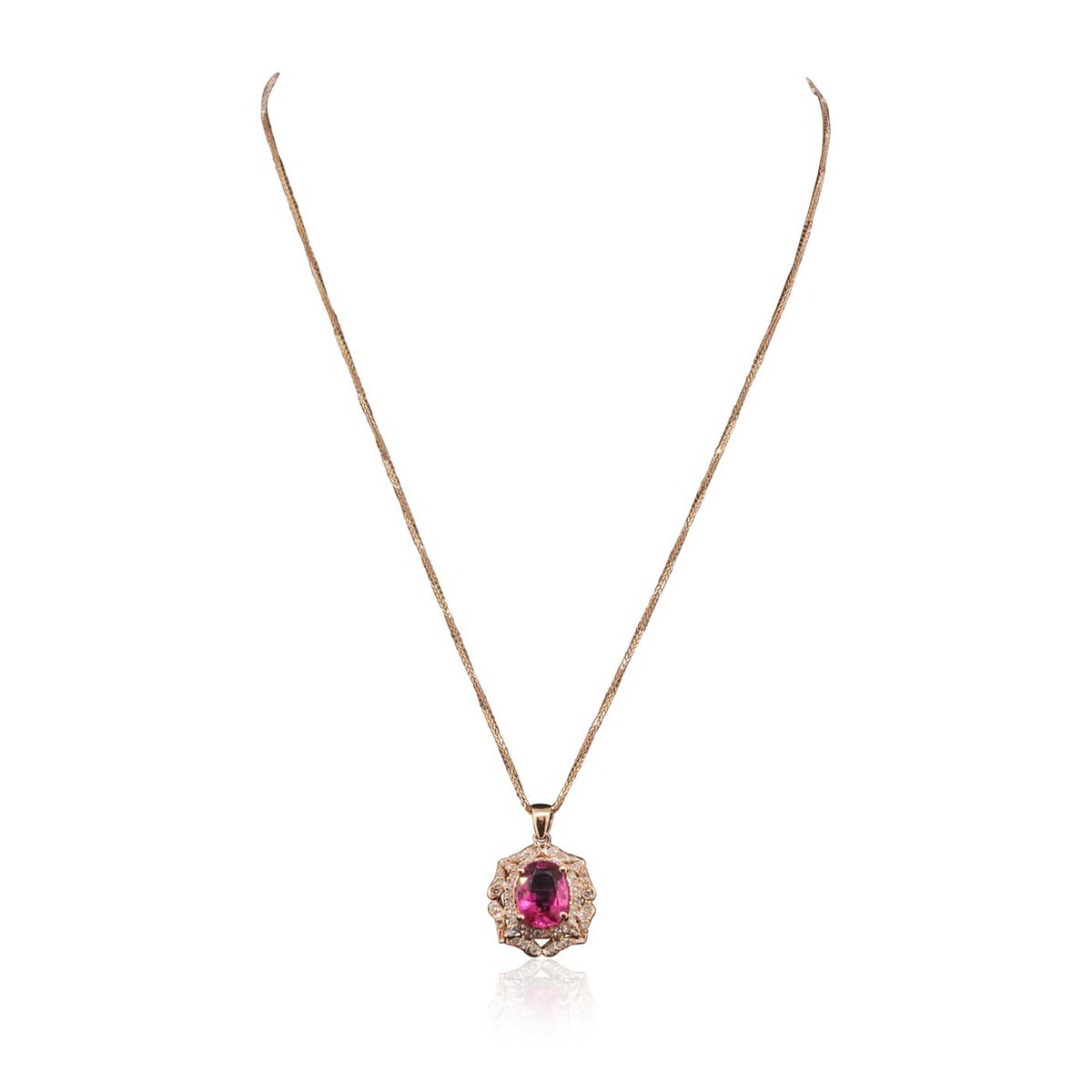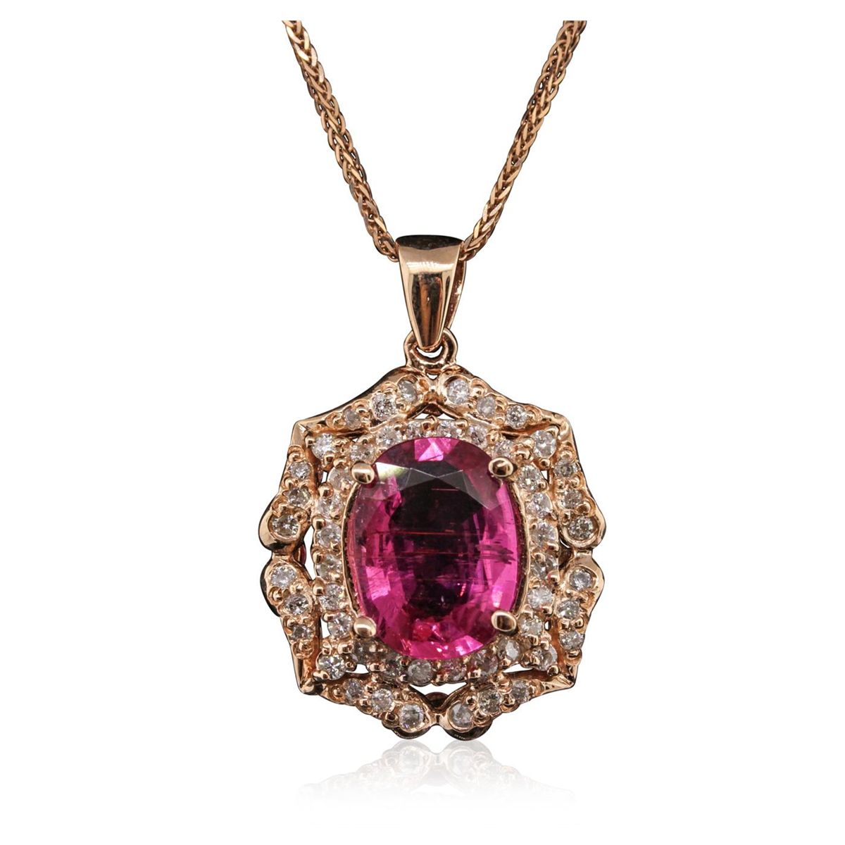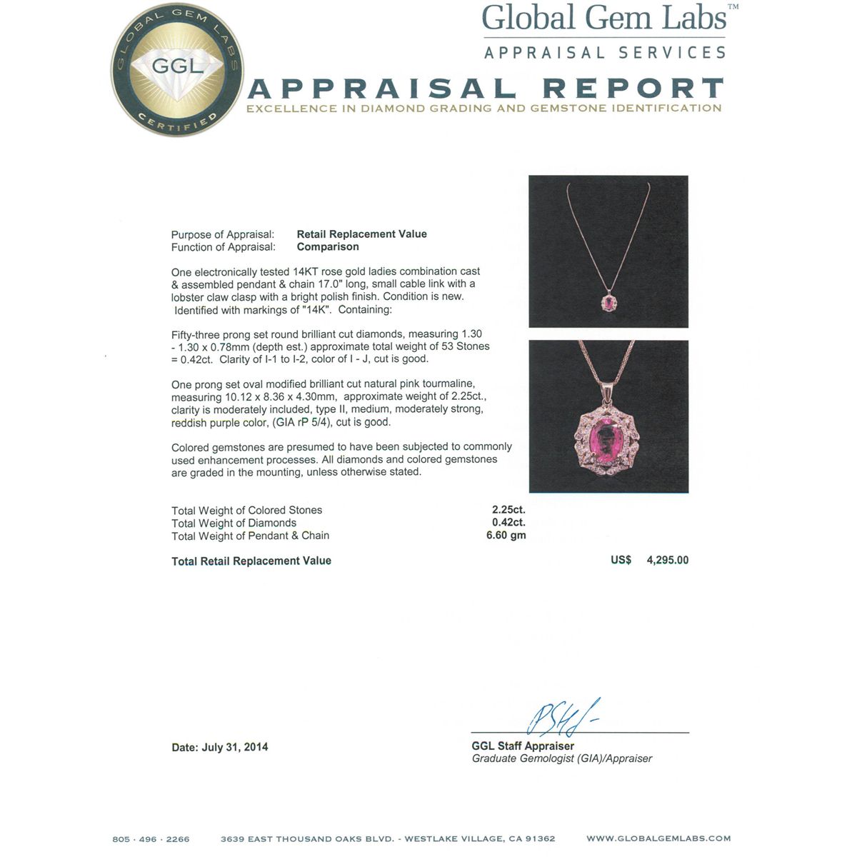 One electronically tested 14KT rose gold ladies combination cast & assembled pendant & chain 17.0" long, small cable link with a lobster claw clasp with a bright polish finish. Condition is new. Identified with markings of "14K". Containing: Fifty-Three prong set round brilliant cut diamonds, measuring 1.30 - 1.30 x 0.78mm (depth est.) approximate. Total Weight of 53 Stones = 0.42ct. Clarity: I-1 to I-2. Color: I - J, Cut is Good. One prong set oval modified brilliant cut natural pink tourmaline, measuring 10.12 x 8.36 x 4.30mm, approximate weight of 2.25ct., clarity is moderately included, type II, medium, moderately strong, reddish purple color, (GIA rP 5/4), cut is good. Colored gemstones are presumed to have been subjected to commonly used enhancement processes. All diamonds and colored gemstones are graded in the mounting, unless otherwise stated. Total Weight of Colored Stones 2.25ct. Total Weight of Diamonds 0.42ct. Total Weight of Pendant & Chain 6.60 grams. GGL Appraised at $4,295.00.
