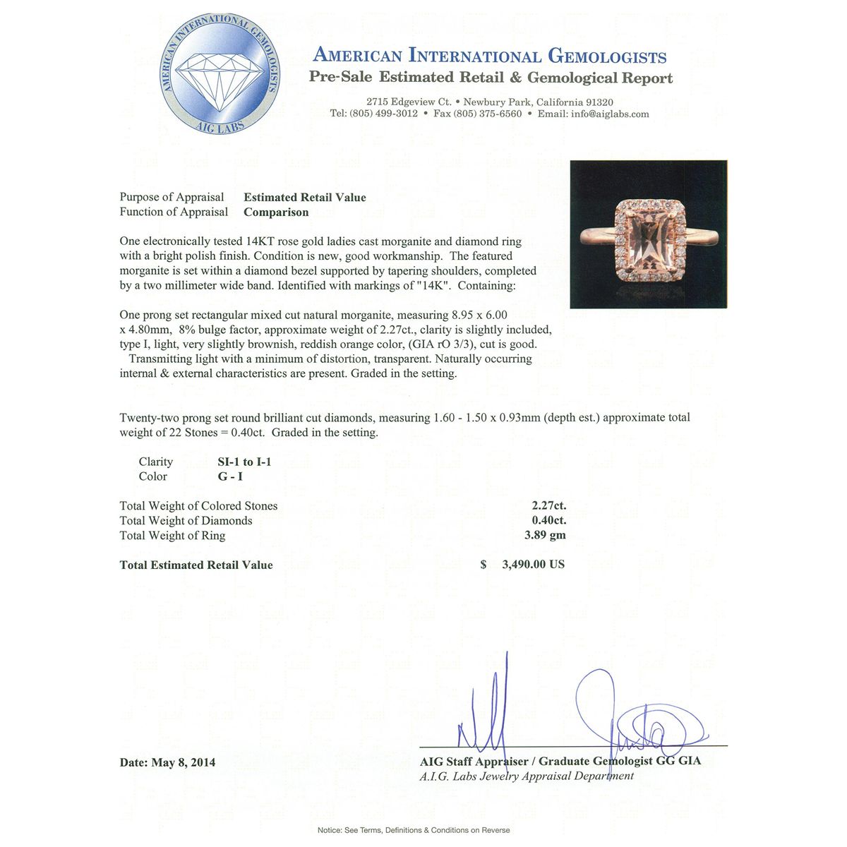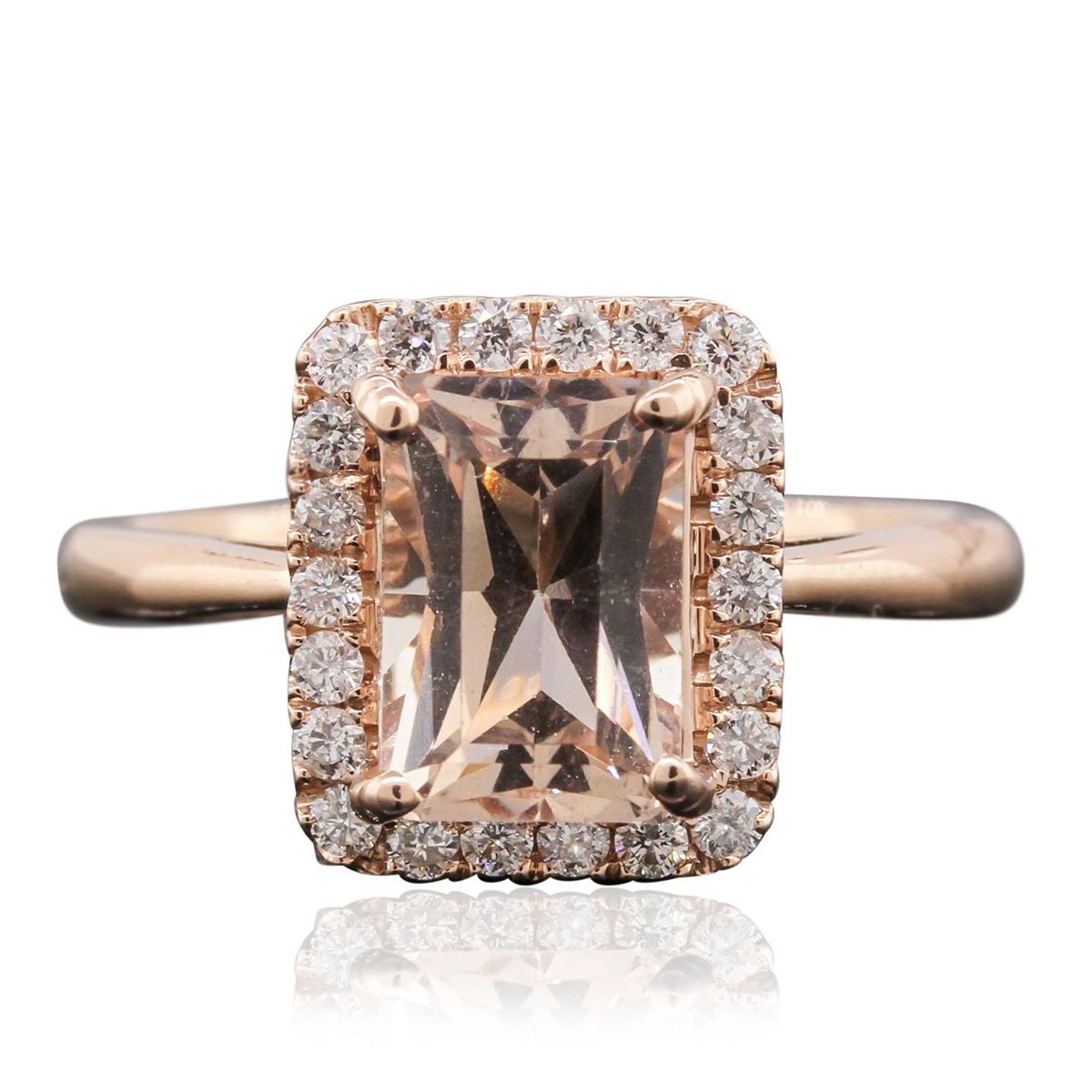 One electronically tested 14KT rose gold ladies cast morganite and diamond ring with a bright polish finish. Condition is new, good workmanship. The featured morganite is set within a diamond bezel supported by tapering shoulders, completed by a two millimeter wide band. Identified with markings of "14K". Containing: One prong set rectangular mixed cut natural morganite, measuring 8.95 x 6.00 x 4.80mm, 8%. bulge factor, approximate weight of 2.27ct., clarity is slightly included, type I, light, very slightly brownish, reddish orange color, (GIA rO 3/3), cut is good. Transmitting light with a minimum of distortion, transparent. Naturally occurring internal & external characteristics are present. Graded in the setting. Twenty-Two prong set round brilliant cut diamonds, measuring 1.60 - 1.50 x 0.93mm (depth est.) approximate. Total Weight of 22 Stones = 0.40ct. Graded in the setting. Clarity: SI-1 to I-1. Color: G - I. Total Weight of Colored Stones 2.27ct. Total Weight of Diamonds 0.40ct. Total Weight of Ring 3.89gm. AIG Appraised at $3,490.00.
