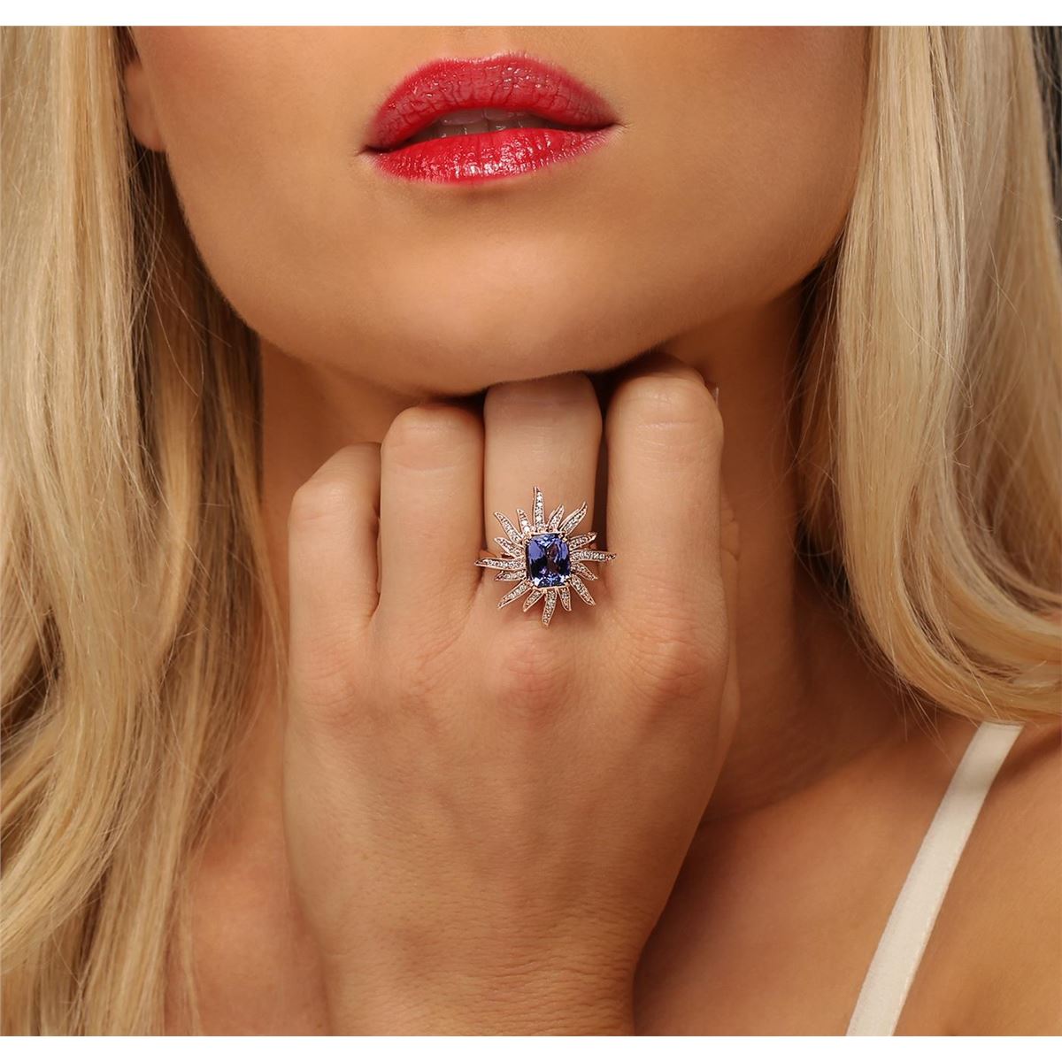 One electronically tested 14KT rose gold Ladies cast ring with a bright polish finish. Condition is new. Identified with markings of "14K". Containing: One prong set rectangular cushion modified brilliant cut natural tanzanite, measuring 9.68 x 6.79 x 4.41mm, approximate weight of 2.28ct., clarity is eye clean, type I, medium, very slightly grayish, bluish violet color, (GIA bV 5/3), cut is very good. Fifty-One prong set round brilliant cut diamonds, measuring 1.20 - 1.20 x 0.72mm (depth est.) approximate. Total Weight of 51 Stones = 0.32ct. Clarity: I-1 to I-2. Color: I - J, Cut is Good. Colored gemstones are presumed to have been subjected to commonly used enhancement processes. All diamonds and colored gemstones are graded in the mounting, unless otherwise stated. Total Weight of Colored Stones 2.28ct. Total Weight of Diamonds 0.32ct. Total Weight of Ring 5.10 grams. GGL Appraised at $5,635.00.