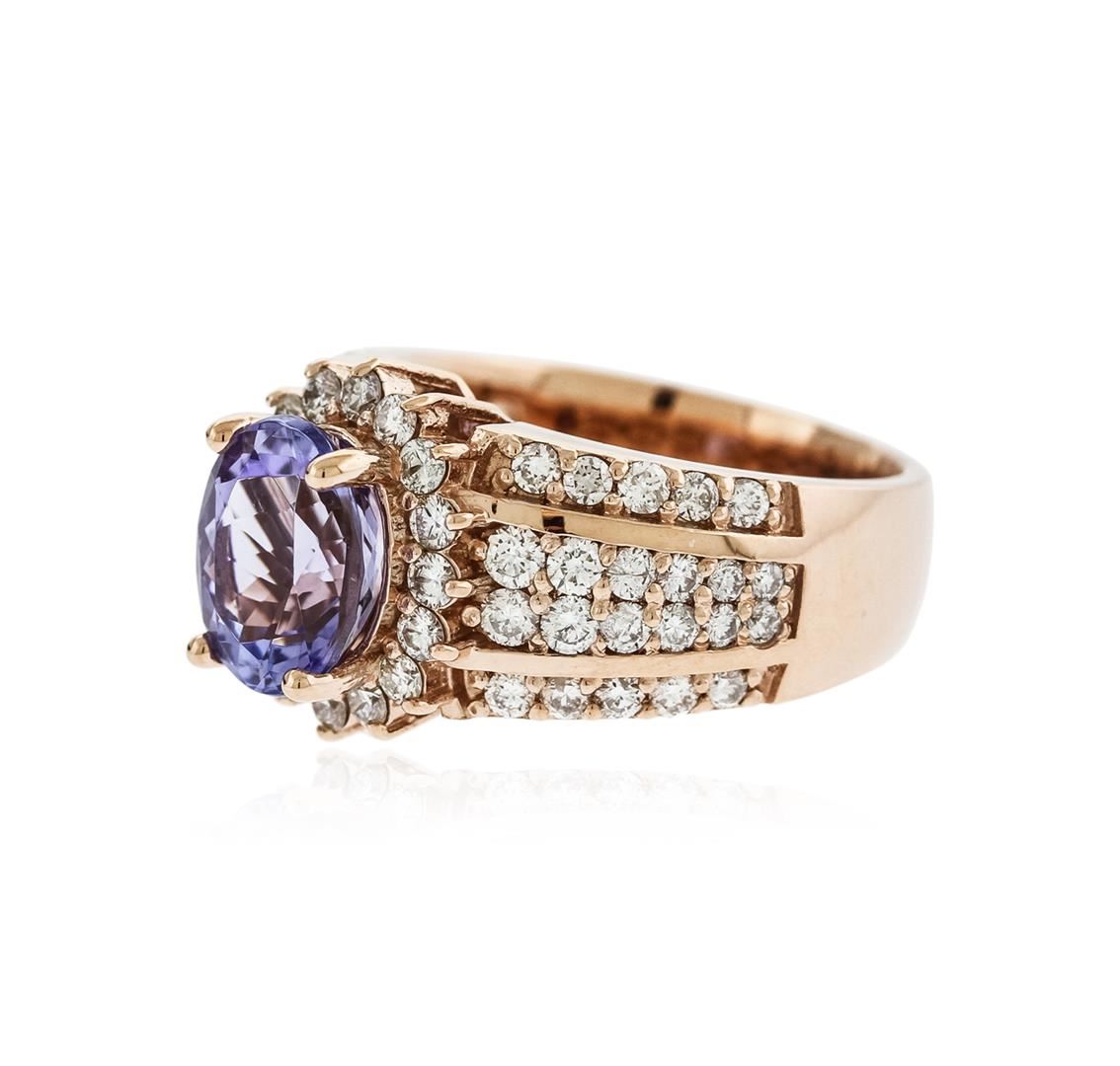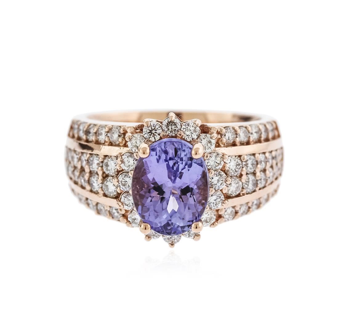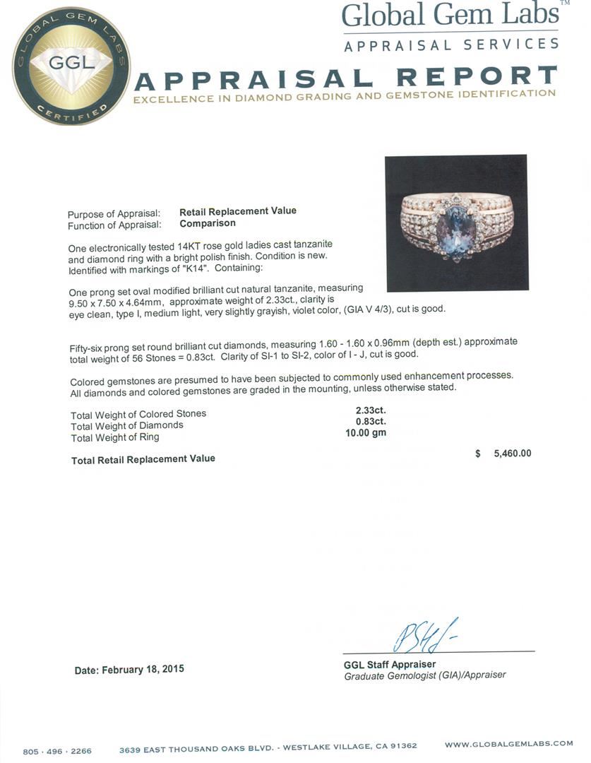 One electronically tested 14KT rose gold ladies cast tanzanite and diamond ring with a bright polish finish. Identified with markings of "K14". Condition is new. Containing: One prong set oval modified brilliant cut natural tanzanite, measuring 9.50 x 7.50 x 4.64mm, approximate weight of 2.33ct., clarity is eye clean, type I, medium light, very slightly grayish, violet color, (GIA V 4/3), cut is good. Fifty-Six prong set round brilliant cut diamonds, measuring 1.60 - 1.60 x 0.96mm (depth est.) approximate total weight of 56 Stones = 0.83ct. Clarity: SI-1 to SI-2. Color: I - J, Cut is Good. Colored gemstones are presumed to have been subjected to commonly used enhancement processes. All diamonds and colored gemstones are graded in the mounting, unless otherwise stated. Total Weight of Colored Stones 2.33ct. Total Weight of Diamonds 0.83ct. Total Weight of Ring 10.00 grams. GGL Appraised at $5,460.00.