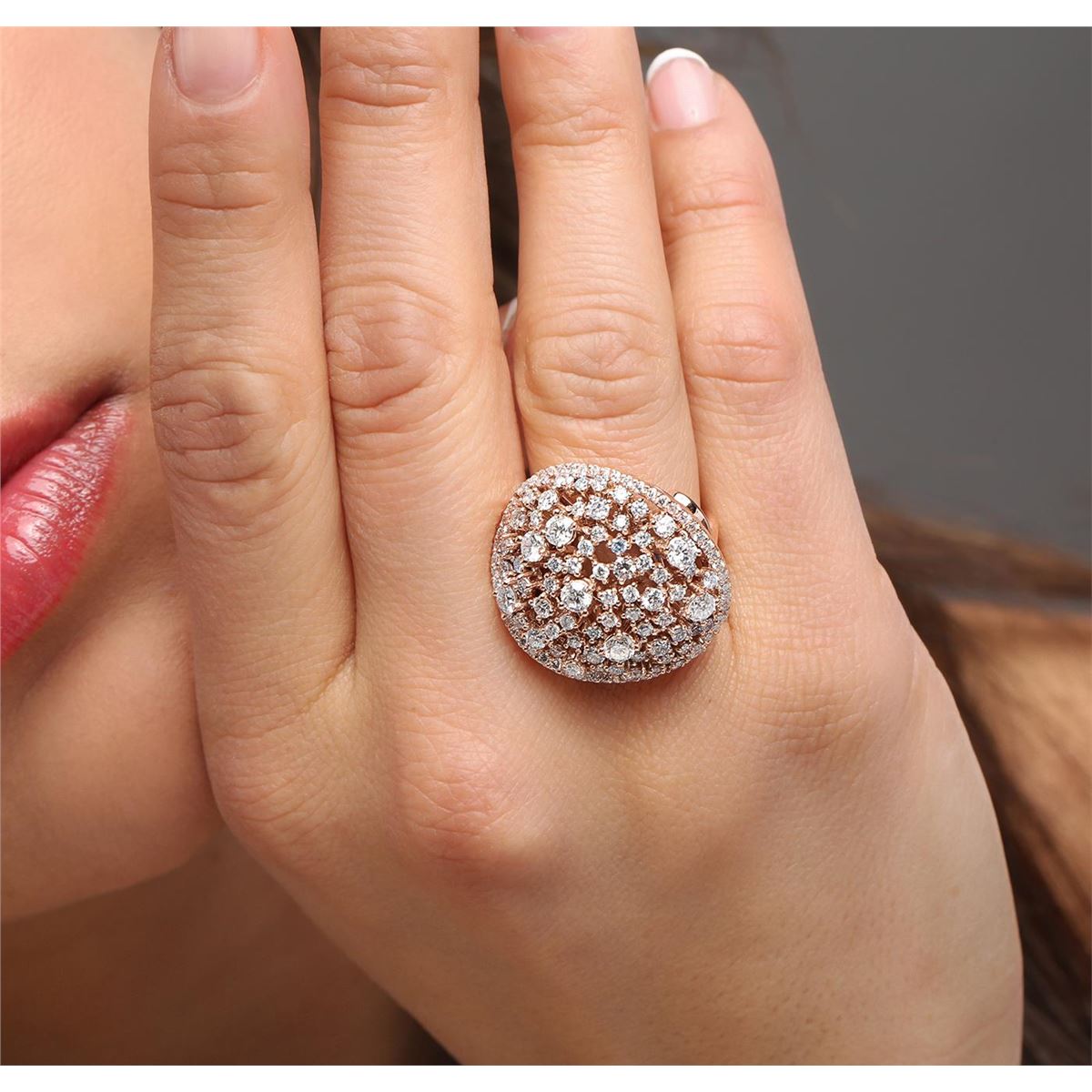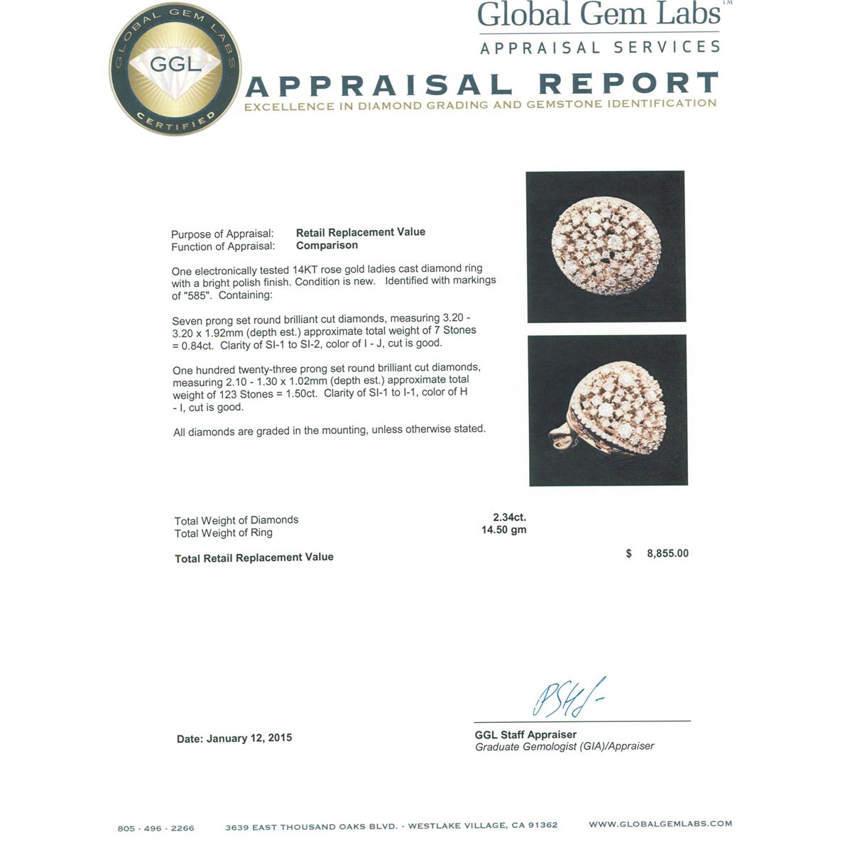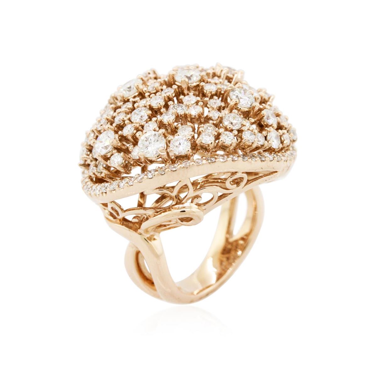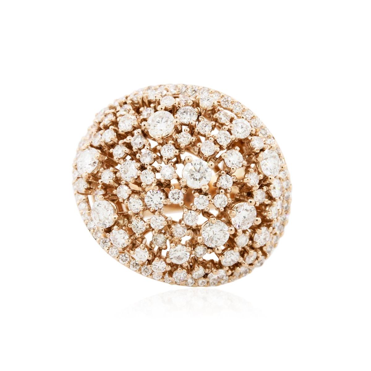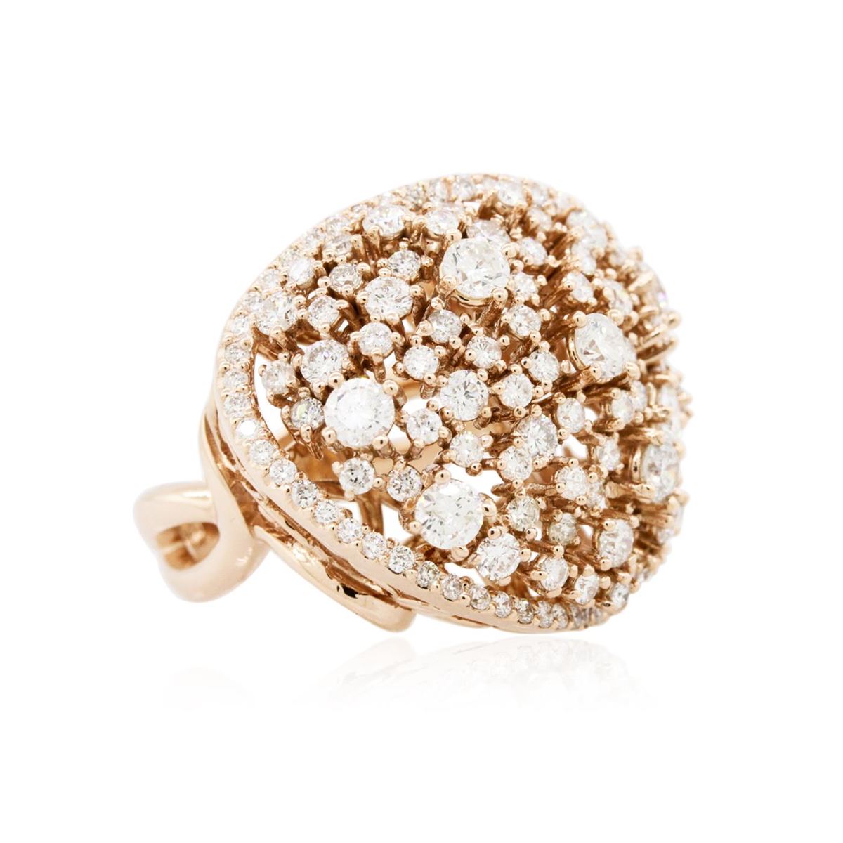 One electronically tested 14KT rose gold ladies cast diamond ring with a bright polish finish. Identified with markings of "585". Condition is new. Containing: Seven prong set round brilliant cut diamonds, measuring 3.20 - 3.20 x 1.92mm (depth est.) approximate total weight of 7 Stones = 0.84ct. Clarity: SI-1 to SI-2. Color: I - J, Cut is Good. One Hundred Twenty-Three prong set round brilliant cut diamonds, measuring 2.10 - 1.30 x 1.02mm (depth est.) approximate total weight of 123 Stones = 1.50ct. Clarity: SI-1 to I-1. Color: H - I, Cut is Good. All diamonds are graded in the mounting, unless otherwise stated. Total Weight of Diamonds 2.34ct. Total Weight of Ring 14.50 grams. GGL Appraised at $8,855.00.