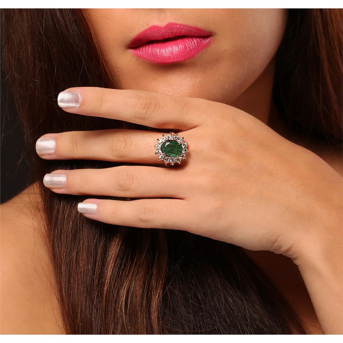 One electronically tested 14KT rose gold Ladies combination cast & assembled fancy ring with a high polish finish. Condition is new. Identified with markings of "14K". Containing: One prong set oval modified mixed cut natural emerald, measuring 10.70 x 8.20 x 4.82mm, approximate weight of 2.34ct., clarity is heavily included, type III, medium dark, very slightly grayish, very slightly bluish green color, (GIA vslbG 6/3), cut is good. Colored gemstones are presumed to have been subjected to commonly used and possible undetectable color/clarity enhancement processes. Fourteen prong set round brilliant cut diamonds, measuring 2.60 - 2.60 x 1.56mm (depth est.) approximate total weight of 14 Stones = 0.90ct. Clarity of SI-1 to SI-2, Color of K - L, Cut is Good. Total Weight of Colored Stones 2.34ct. Total Weight of Diamonds 0.90ct. Total Weight of Ring 7.30 grams. GGL Appraised at $8,650.00.