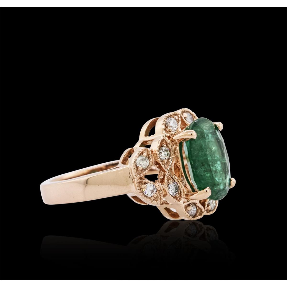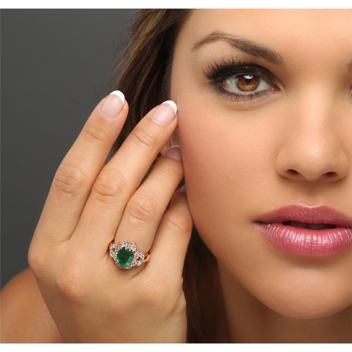 One ring featuring: 14KT rose gold weighing 6.10 grams containing one prong set oval cut emerald with a total weight of 2.36ct and pave set round cut diamonds with a total weight of 0.28cts.