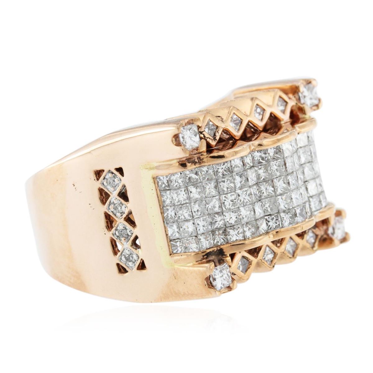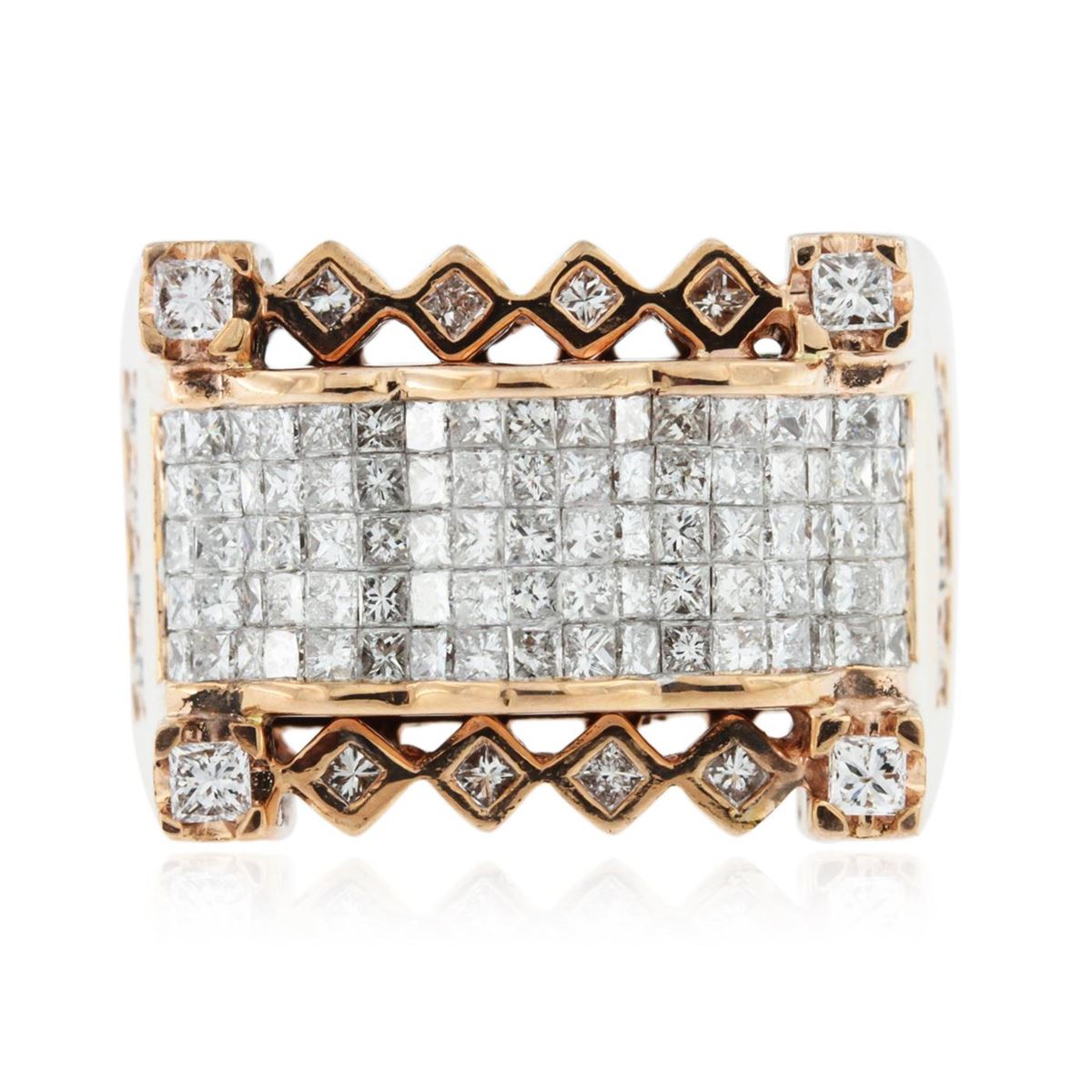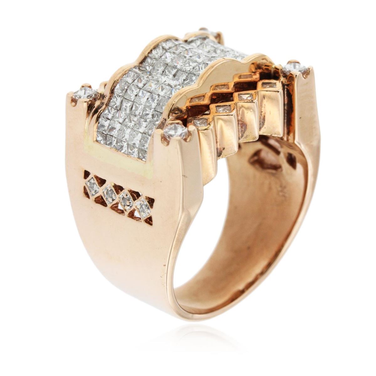 One electronically tested 14KT rose gold man's combination cast & assembled ring with a bright polish finish. Condition is new. Identified with markings of "14K". Containing: One Hundred Three pave' set princess cut diamonds, measuring 1.50 x 1.50 x 1.13mm (depth est.) approximate. Total Weight of 103 Stones = 2.14ct. Clarity: I-1 to I-2. Color: G - H, Cut is Good. Eight prong set round brilliant cut diamonds, measuring 1.00 - 1.00 x 0.60mm (depth est.) approximate. Total Weight of 8 Stones = 0.03ct. Clarity: I-1 to I-2. Color: G - H, Cut is Good. Four prong set princess cut diamonds, measuring 2.00 x 2.00 x 1.50mm (depth est.) approximate. Total Weight of 4 Stones = 0.20ct. Clarity: SI-1 to SI-2. Color: G - H, Cut is Good. Total Weight of Diamonds 2.37ct. Total Weight of Ring 20.70gm. GGL Appraised at $10,905.00.