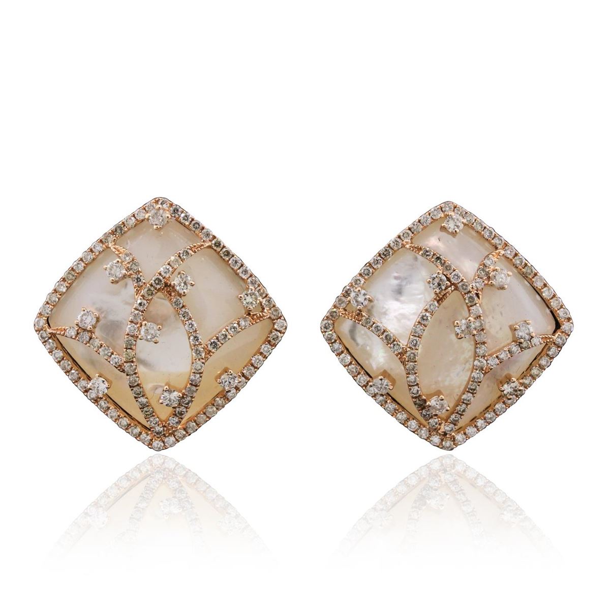 One electronically tested 14KT rose gold ladies cast & assembled mother-of-pearl and diamond earrings with omega backs. Condition is new, good workmanship. Each earring features a 20mm x 20mm square cushion mother-of-pearl cabachon set within a diamond bezel supported by a diamond set lattice design. Bright polish finish. Trademark is CJ. Identified with markings of "14K". Containing: Eighteen prong set round brilliant cut diamonds, measuring 2.10 - 2.00 x 1.23mm (depth est.) approximate total weight of 18 Stones = 0.66ct. Clarity SI-2 to I-2. Color H - J. One Hundred Eighty-Four prong set round brilliant cut diamonds, measuring 1.40 - 1.30 x 0.81mm (depth est.) approximate total weight of 184 Stones = 1.75ct. The color grade reflects the entire range of color for this group. Faint brown secondary color throughout. Graded in the setting. Clarity SI-2 to I-2. Color H - K. Total Weight of Diamonds 2.41 ct. Total Weight of Earrings 17.56 grams. AIG Appraised at $7,500.00.