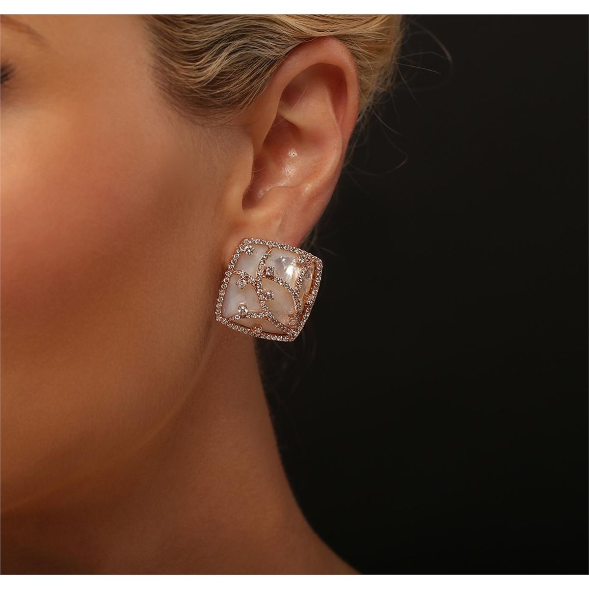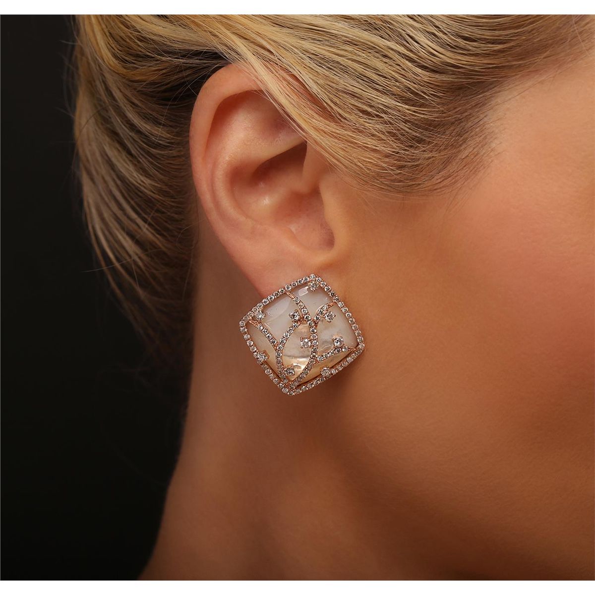 One electronically tested 14KT rose gold ladies cast & assembled mother-of-pearl and diamond earrings with omega backs. Condition is new, good workmanship. Each earring features a 20mm x 20mm square cushion mother-of-pearl cabachon set within a diamond bezel supported by a diamond set lattice design. Bright polish finish. Trademark is CJ. Identified with markings of "14K". Containing: Eighteen prong set round brilliant cut diamonds, measuring 2.10 - 2.00 x 1.23mm (depth est.) approximate total weight of 18 Stones = 0.66ct. Clarity SI-2 to I-2. Color H - J. One Hundred Eighty-Four prong set round brilliant cut diamonds, measuring 1.40 - 1.30 x 0.81mm (depth est.) approximate total weight of 184 Stones = 1.75ct. The color grade reflects the entire range of color for this group. Faint brown secondary color throughout. Graded in the setting. Clarity SI-2 to I-2. Color H - K. Total Weight of Diamonds 2.41 ct. Total Weight of Earrings 17.56 grams. AIG Appraised at $7,500.00.