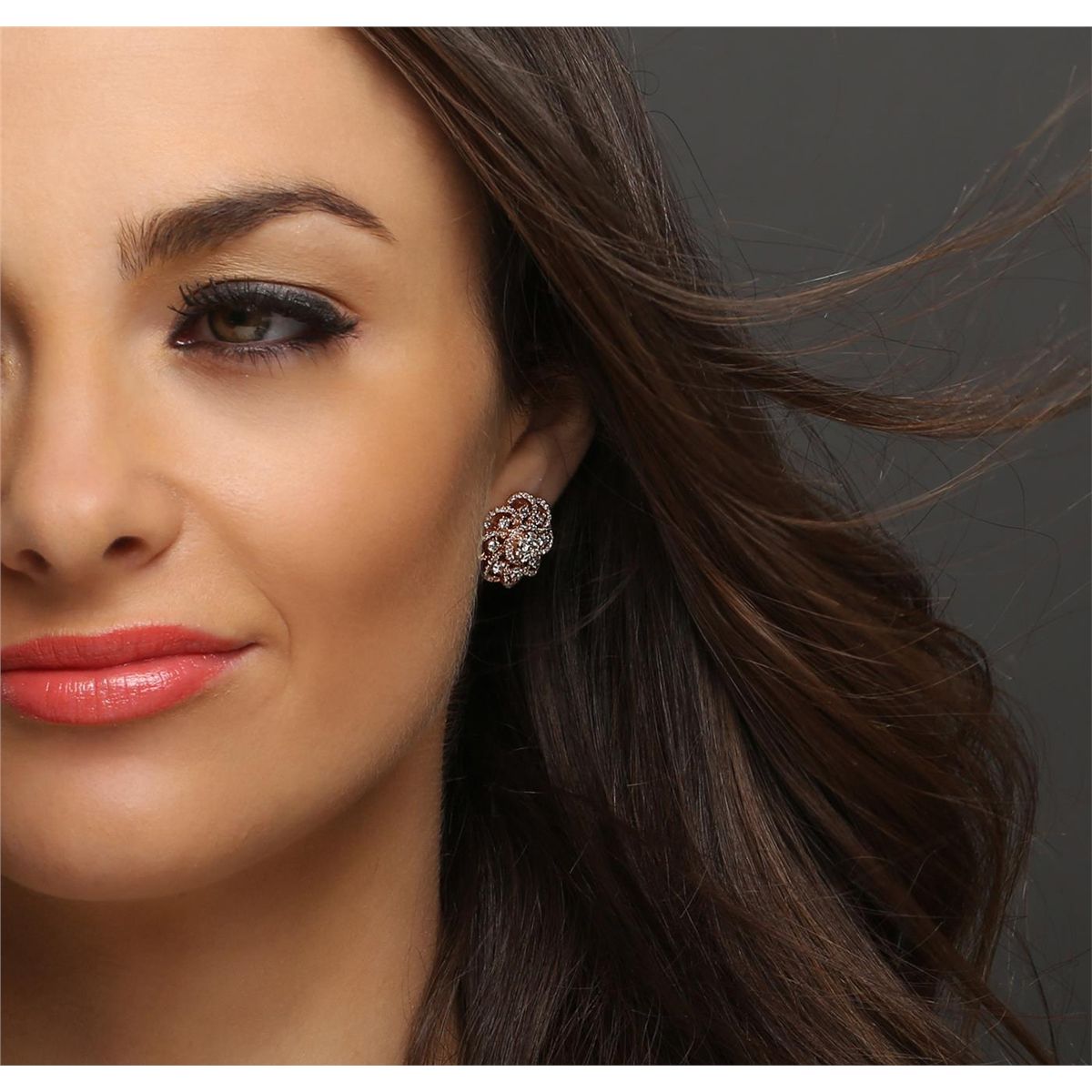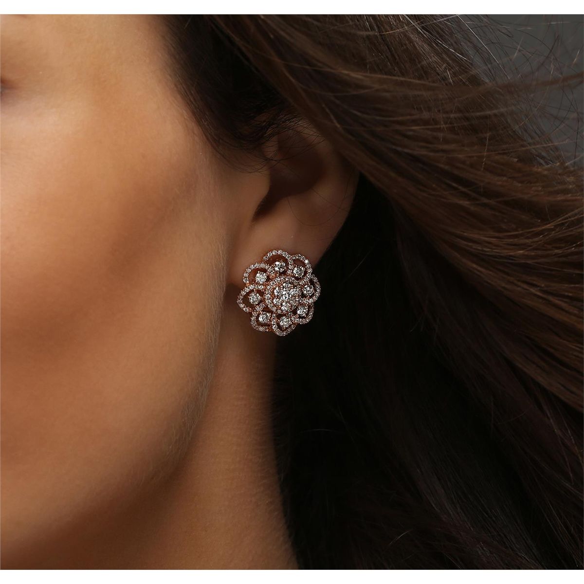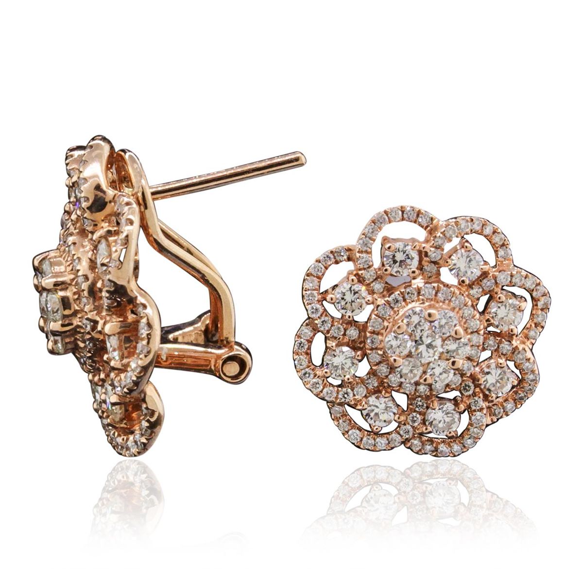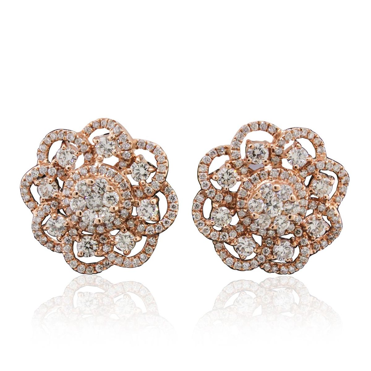 One pair electronically tested 14KT rose gold ladies combination cast & assembled diamond earrings with Omega clip backs with posts with a bright polish finish. Condition is new. Containing: Eighteen prong set round brilliant cut diamonds, measuring 2.10 - 2.10 x 1.26mm (depth est.) approximate total weight of 18 Stones = 0.61ct. . Clarity: SI-1. Color: J - K, Cut is Good. Twelve prong set round brilliant cut diamonds, measuring 1.80 - 1.80 x 1.08mm (depth est.) approximate total weight of 12 Stones = 0.26ct. . Clarity: SI-1. Color: H - I, Cut is Good. One Hundred Eighty-Two prong set round brilliant cut diamonds, measuring 1.10 - 1.10 x 0.66mm (depth est.) approximate total weight of 182 Stones = 1.61ct. . Clarity: I-1 to I-2. Color: I - J, Cut is Good. All diamonds are graded in the mounting, unless otherwise stated.. Total Weight of Diamonds 2.48ct.. Total Weight of Earrings 7.80 grams. GGL Appraised at $8,405.00