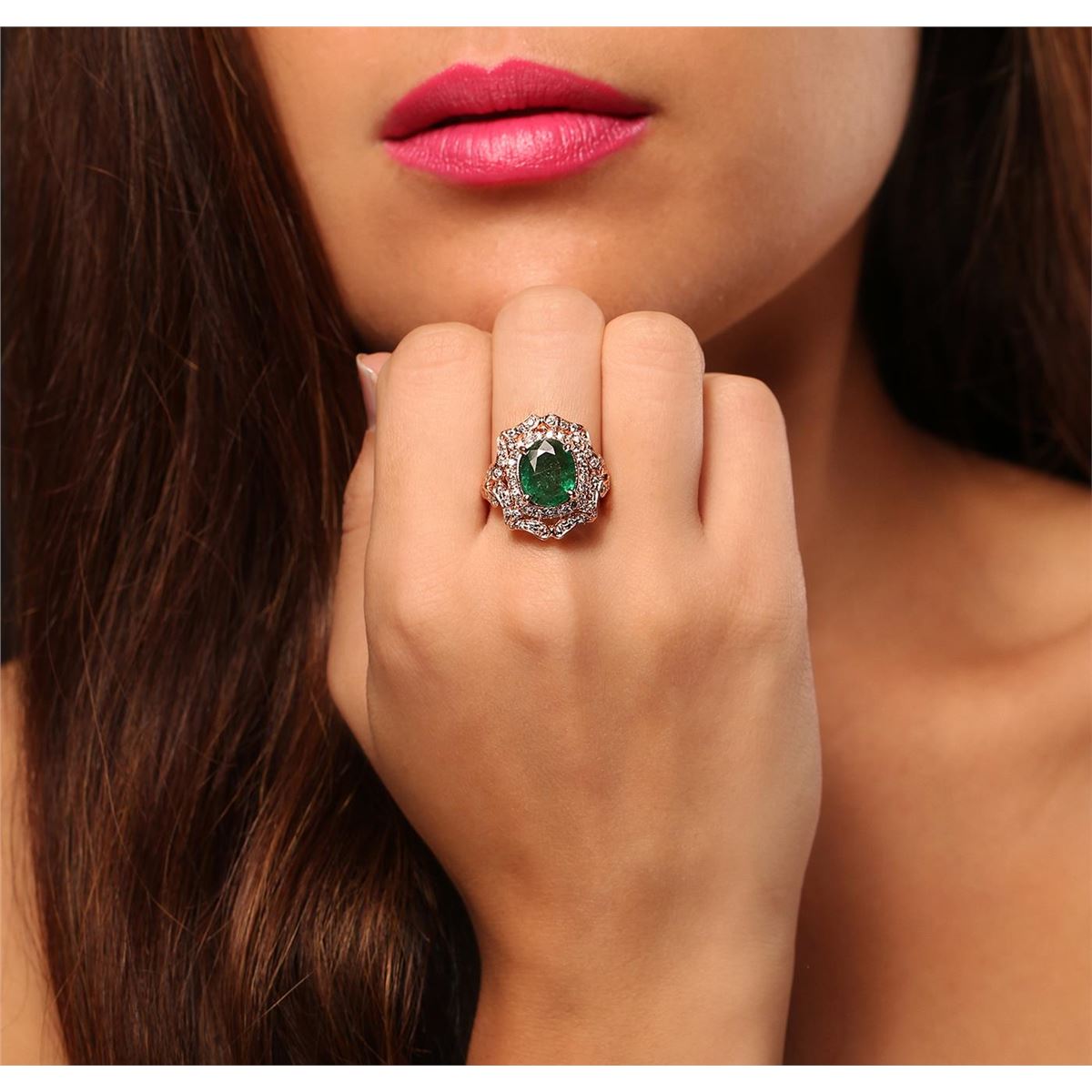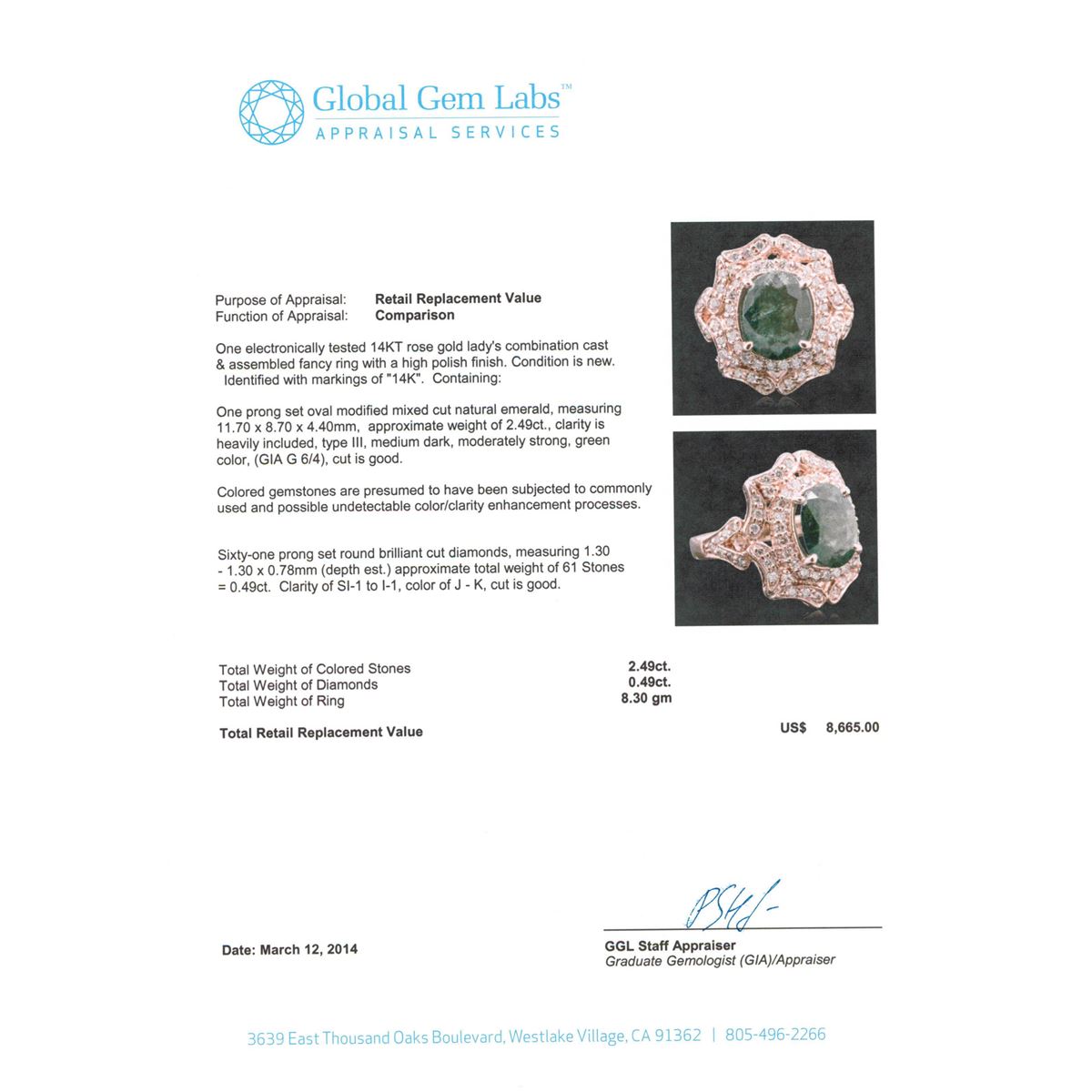 One electronically tested 14KT rose gold Ladies combination cast & assembled fancy ring with a high polish finish. Condition is new. Identified with markings of "14K". Containing: One prong set oval modified mixed cut natural emerald, measuring 11.70 x 8.70 x 4.40mm, approximate weight of 2.49ct., clarity is heavily included, type III, medium dark, moderately strong, green color, (GIA G 6/4), cut is good. Colored gemstones are presumed to have been subjected to commonly used and possible undetectable color/clarity enhancement processes. Sixty-One prong set round brilliant cut diamonds, measuring 1.30 - 1.30 x 0.78mm (depth est.) approximate total weight of 61 Stones = 0.49ct. Clarity of SI-1 to I-1, Color of J - K, Cut is Good. Total Weight of Colored Stones 2.49ct. Total Weight of Diamonds 0.49ct. Total Weight of Ring 8.30 grams. GGL Appraised at $8,665.00.