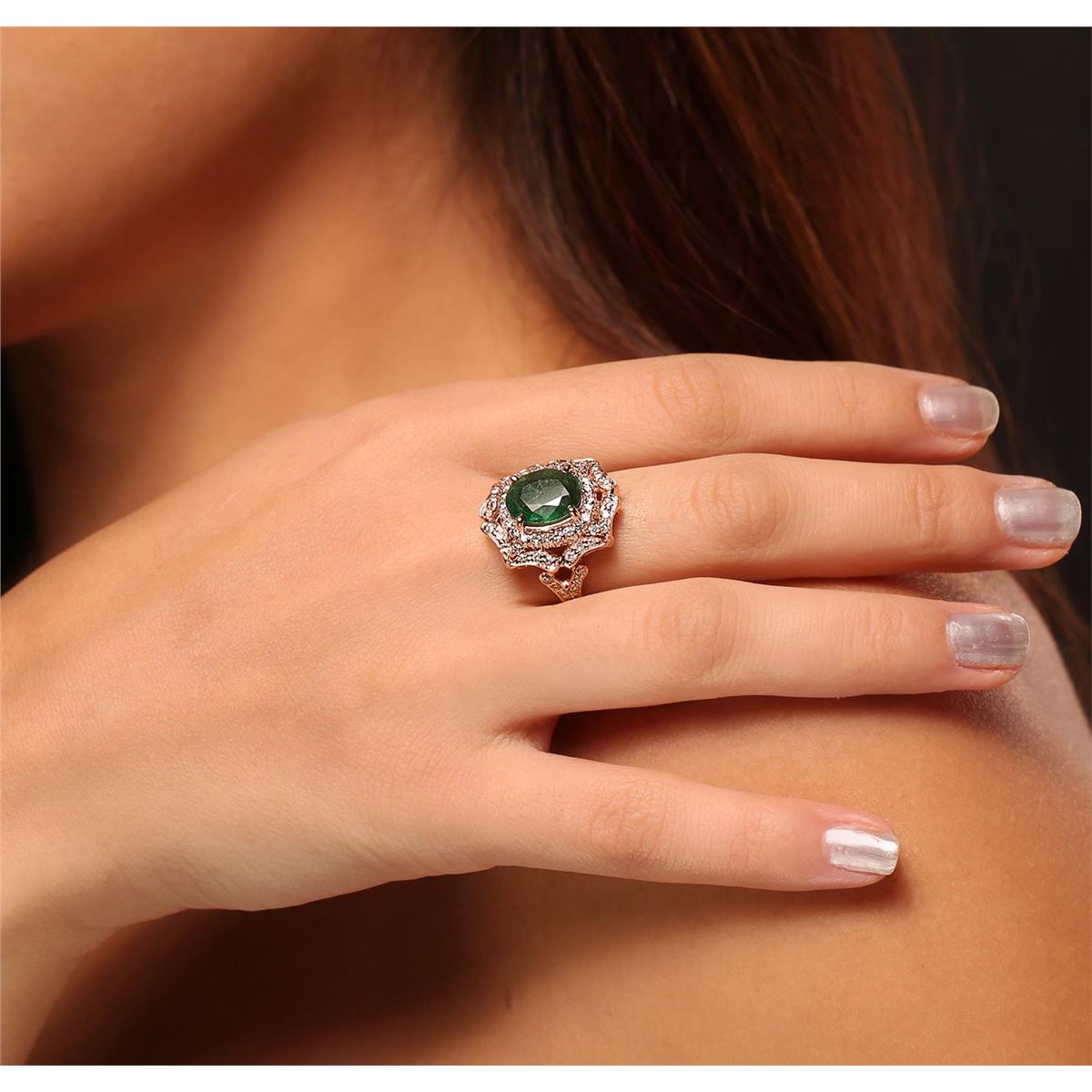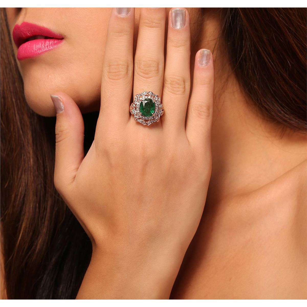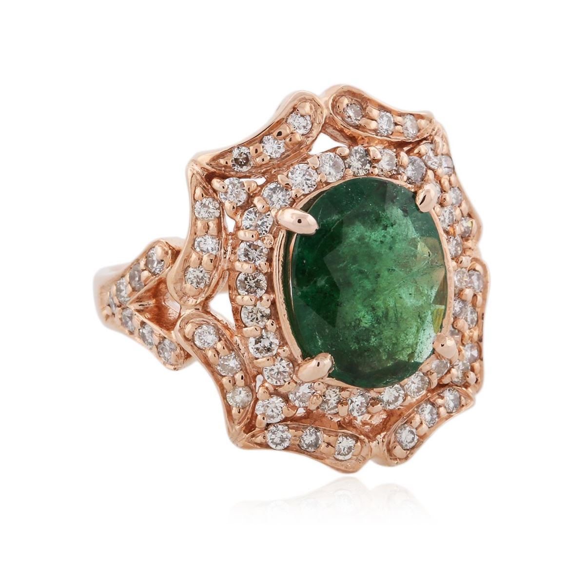 One electronically tested 14KT rose gold Ladies combination cast & assembled fancy ring with a high polish finish. Condition is new. Identified with markings of "14K". Containing: One prong set oval modified mixed cut natural emerald, measuring 11.70 x 8.70 x 4.40mm, approximate weight of 2.49ct., clarity is heavily included, type III, medium dark, moderately strong, green color, (GIA G 6/4), cut is good. Colored gemstones are presumed to have been subjected to commonly used and possible undetectable color/clarity enhancement processes. Sixty-One prong set round brilliant cut diamonds, measuring 1.30 - 1.30 x 0.78mm (depth est.) approximate total weight of 61 Stones = 0.49ct. Clarity of SI-1 to I-1, Color of J - K, Cut is Good. Total Weight of Colored Stones 2.49ct. Total Weight of Diamonds 0.49ct. Total Weight of Ring 8.30 grams. GGL Appraised at $8,665.00.