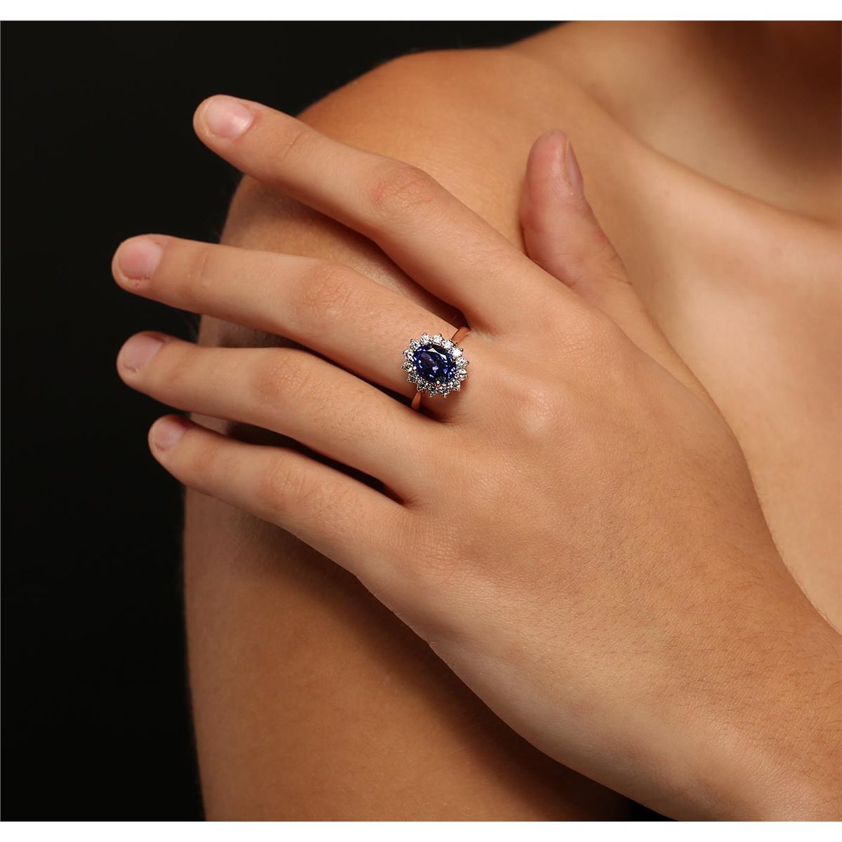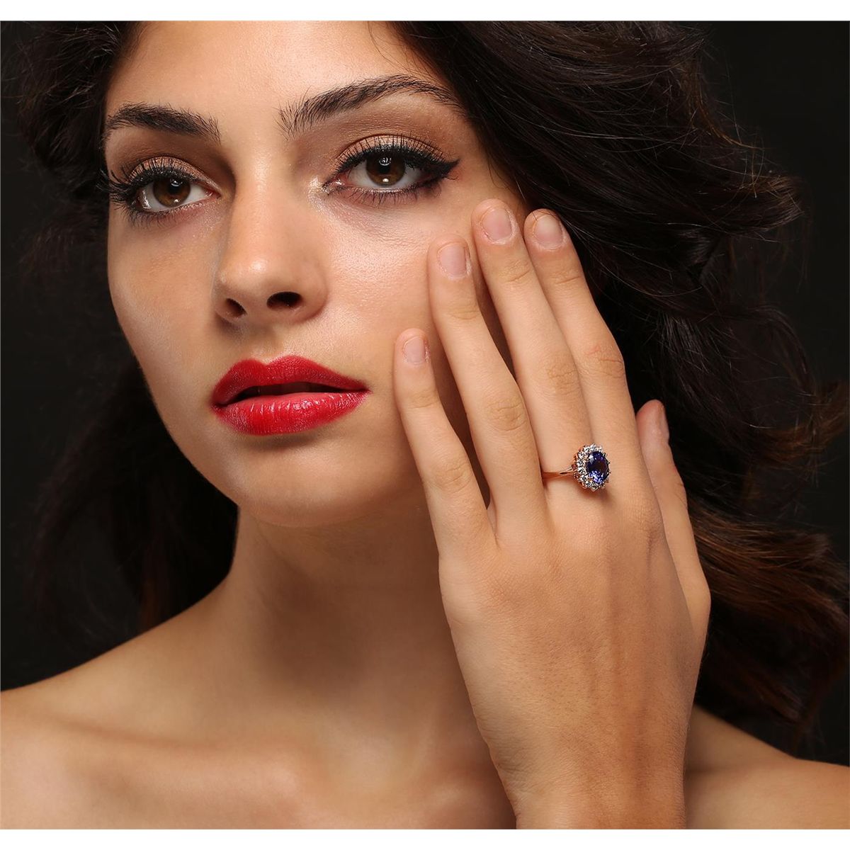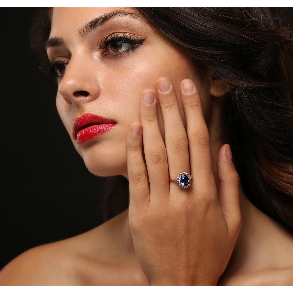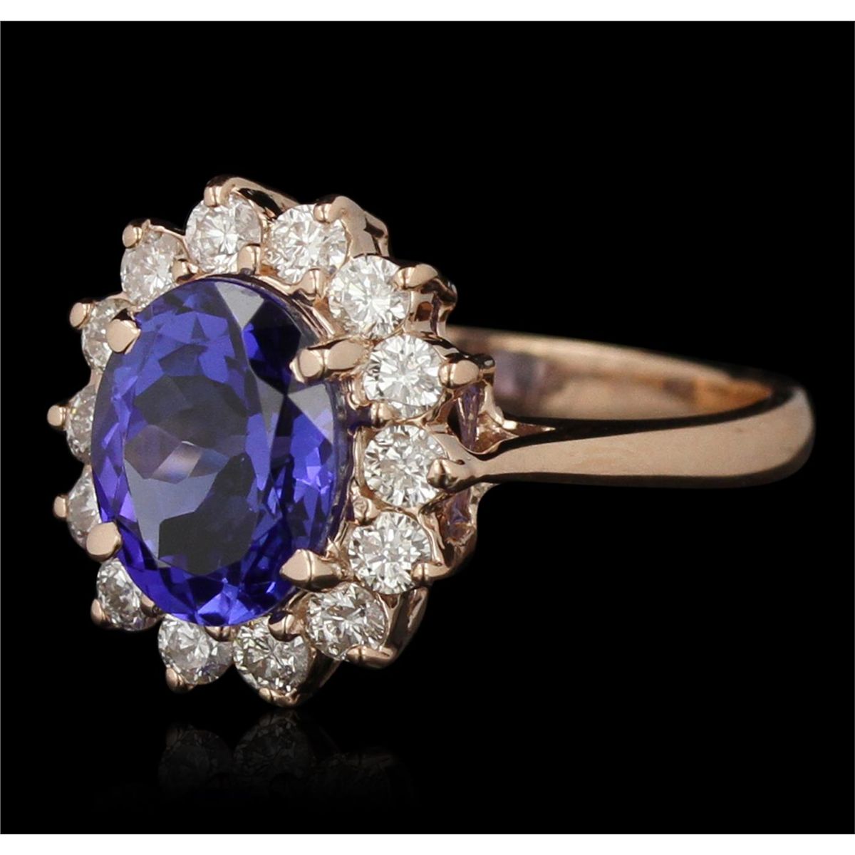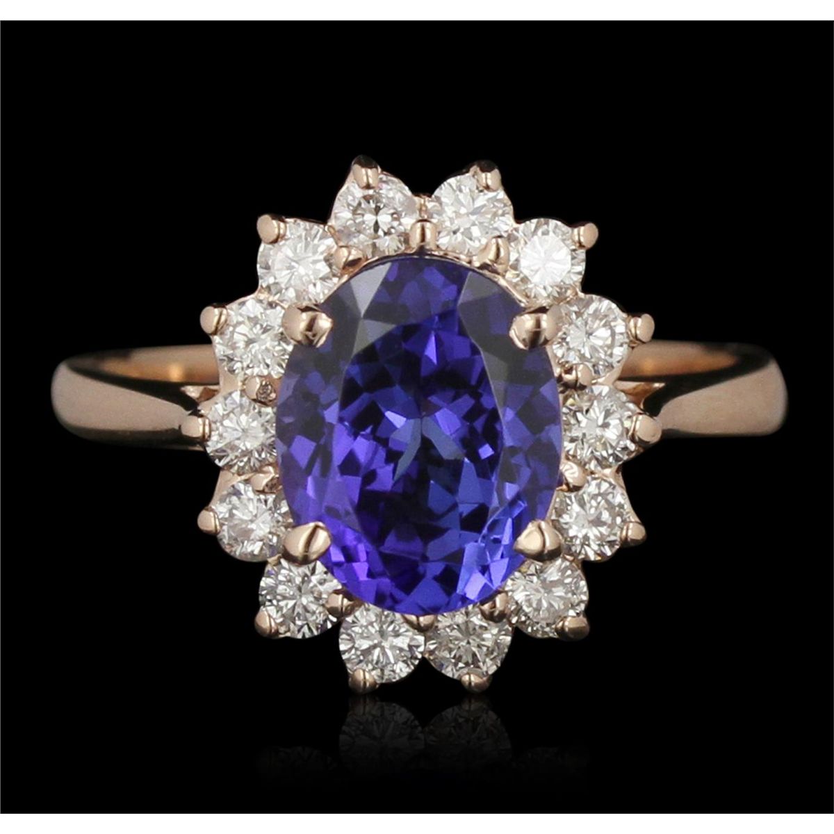 One electronically tested 14KT rose gold Ladies combination cast & assembled cocktail ring with a bright polish finish. Identified with markings of "14K". Condition is excellent. Containing: One prong set oval modified brilliant cut natural tanzanite, measuring 9.40 x 7.50 x 5.00mm, approximate weight of 2.49ct., clarity is eye clean, type I, medium, moderately strong, violetish blue color, (GIA vB 5/4), cut is very good. Colored gemstones are presumed to have been subjected to commonly used and possible undetectable color/clarity enhancement processes. Fourteen prong set round brilliant cut diamonds, measuring 2.00 - 2.00 x 1.20mm (depth est.) approximate total weight of 14 Stones = 0.61ct. Clarity of SI-2, Color of I - J, Cut is Very Good. Total Weight of Colored Stones 2.49ct. Total Weight of Diamonds 0.61ct. Total Weight of Ring 4.20gm. GGL Appraised at $5,015.00.