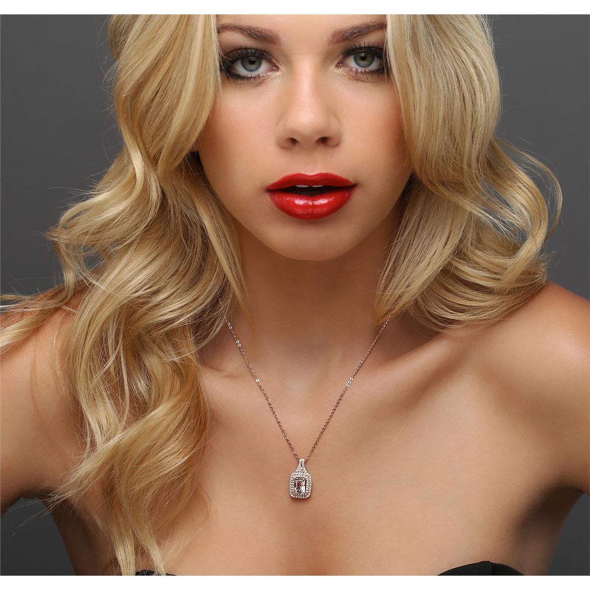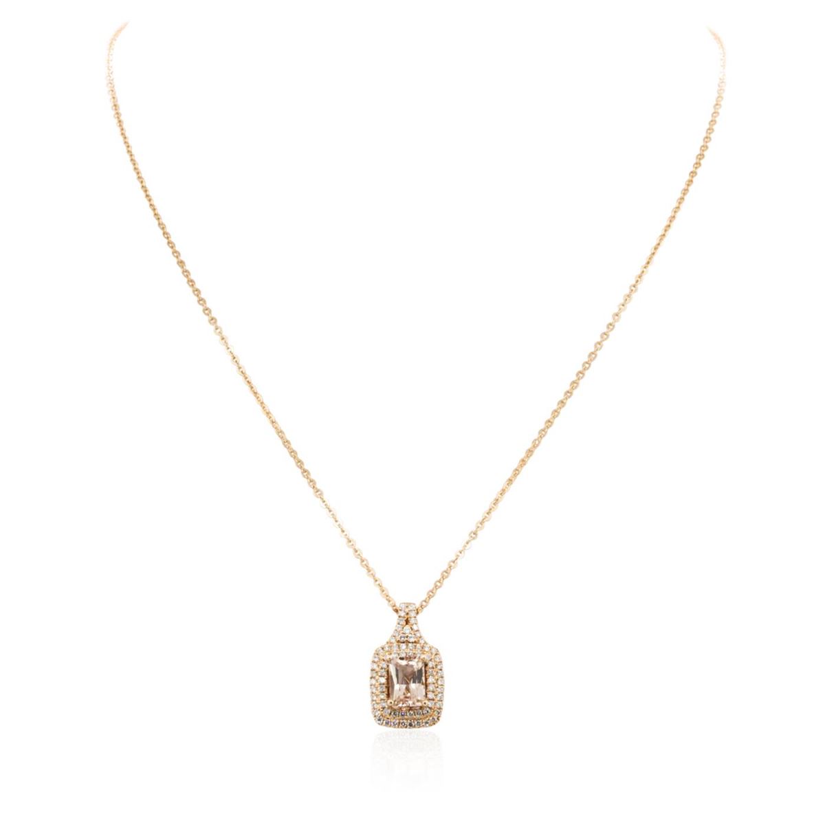 One electronically tested 14KT rose gold ladies cast & assembled morganite and diamond pendant with chain. Condition is new, good workmanship. The pendant features a morganite set within two tiered diamond bezels, completed by a diamond set bail. The pendant is supported by an eighteen inch length 14KT rose gold designer style chain, terminating in a lobster claw clasp. Bright polish finish. Identified with markings of "14K". Containing: One prong set rectangular mixed cut natural morganite, measuring 9.05 x 6.30 x 5.10mm, 8%. bulge factor, approximate weight of 2.56ct., clarity is slightly included, type I, light, very slightly brownish, orangy red color, (GIA oR 3/3), cut is good. Transmitting light with a minimum of distortion, transparent. Naturally occurring internal & external characteristics are present. Refractive index testing results of 1.57 to 1.58. This is a conclusive result for beryl (morganite). Graded in the setting. Seventy-One prong set round brilliant cut diamonds, measuring 1.40 - 1.30 x 0.81mm (depth est.) approximate. Total Weight of 71 Stones = 0.74ct. Graded in the setting. Clarity: SI-1 to I-1. Color: G - I. Total Weight of Colored Stones 2.56ct. Total Weight of Diamonds 0.74ct. Total Weight of Pendant With Chain 6.47 grams. AIG Appraised at $5,390.00.