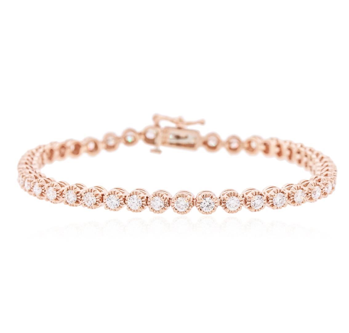 One electronically tested 14KT rose gold ladies cast diamond tennis bracelet with a hidden box clasp with safety closer with a bright polish finish. Measurements: 7 " in length Identified with markings of "14K". Condition is new. Containing: Forty-Five prong set round brilliant cut diamonds, measuring 2.50 - 2.50 x 1.50mm (depth est.) approximate total weight of 45 Stones = 2.57ct. Clarity: VS-2 to SI-1. Color: G - H, Cut is Good. All diamonds are graded in the mounting, unless otherwise stated. Total Weight of Diamonds 2.57ct. Total Weight of Tennis Bracelet 11.80 grams. GGL Appraised at $8,660.00.
