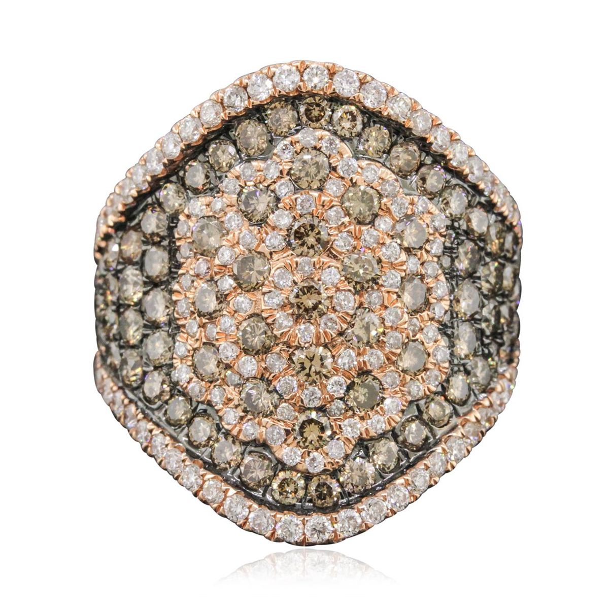 One electronically tested 14KT rose gold ladies cast diamond ring with a tapered shank with a bright polish finish. Identified with markings of "14K". Condition is new. Containing: Seventy-Seven prong set round brilliant cut diamonds, measuring 1.80 - 1.80 x 1.08mm (depth est.) approximate total weight of 77 Stones = 1.64ct. Clarity: SI-1 to SI-2, Cut is Good. Fifty-Eight prong set round brilliant cut diamonds, measuring 1.30 - 1.30 x 0.78mm (depth est.) approximate total weight of 58 Stones = 0.46ct. Clarity: SI-1 to SI-2. Color: H - I, Cut is Good. Twelve prong set round brilliant cut diamonds, measuring 1.60 - 1.60 x 0.96mm (depth est.) approximate total weight of 12 Stones = 0.18ct. Clarity: SI-1, Cut is Good. Ninety-One prong set round brilliant cut diamonds, measuring 1.00 - 1.00 x 0.60mm (depth est.) approximate total weight of 91 Stones = 0.33ct. Clarity: I-1 to I-2. Color: I - J, Cut is Good. All diamonds are graded in the mounting, unless otherwise stated. Total Weight of Diamonds 2.61ct. Total Weight of Ring 9.50 grams. GGL Appraised at $10,435.00.