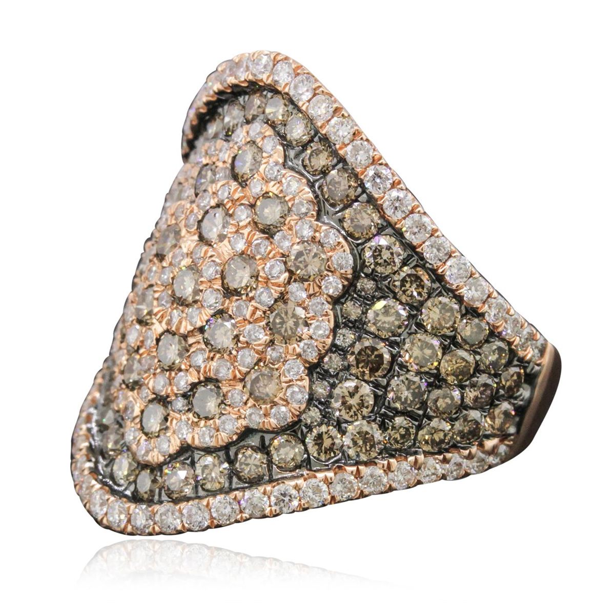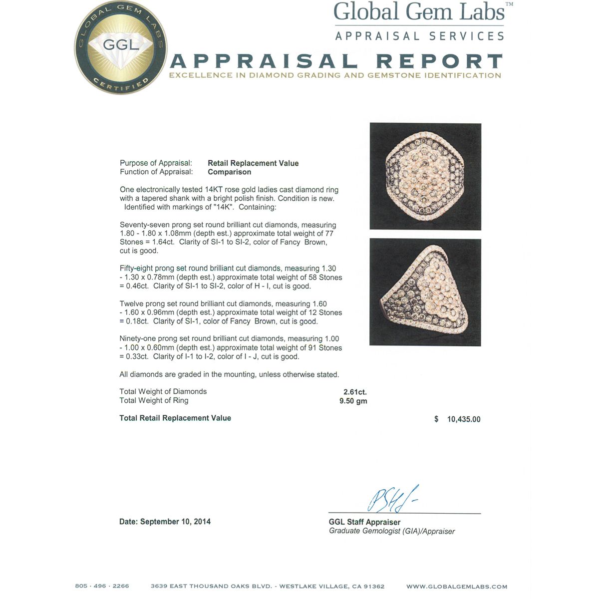 One electronically tested 14KT rose gold ladies cast diamond ring with a tapered shank with a bright polish finish. Identified with markings of "14K". Condition is new. Containing: Seventy-Seven prong set round brilliant cut diamonds, measuring 1.80 - 1.80 x 1.08mm (depth est.) approximate total weight of 77 Stones = 1.64ct. Clarity: SI-1 to SI-2, Cut is Good. Fifty-Eight prong set round brilliant cut diamonds, measuring 1.30 - 1.30 x 0.78mm (depth est.) approximate total weight of 58 Stones = 0.46ct. Clarity: SI-1 to SI-2. Color: H - I, Cut is Good. Twelve prong set round brilliant cut diamonds, measuring 1.60 - 1.60 x 0.96mm (depth est.) approximate total weight of 12 Stones = 0.18ct. Clarity: SI-1, Cut is Good. Ninety-One prong set round brilliant cut diamonds, measuring 1.00 - 1.00 x 0.60mm (depth est.) approximate total weight of 91 Stones = 0.33ct. Clarity: I-1 to I-2. Color: I - J, Cut is Good. All diamonds are graded in the mounting, unless otherwise stated. Total Weight of Diamonds 2.61ct. Total Weight of Ring 9.50 grams. GGL Appraised at $10,435.00.