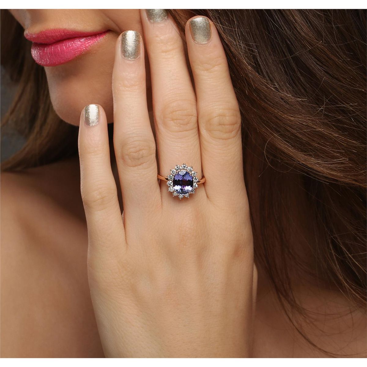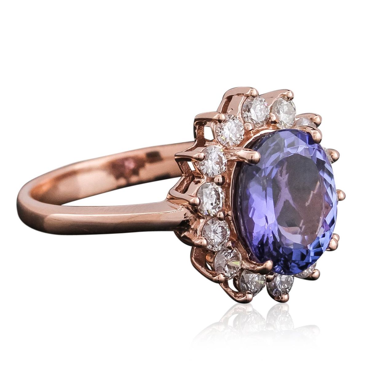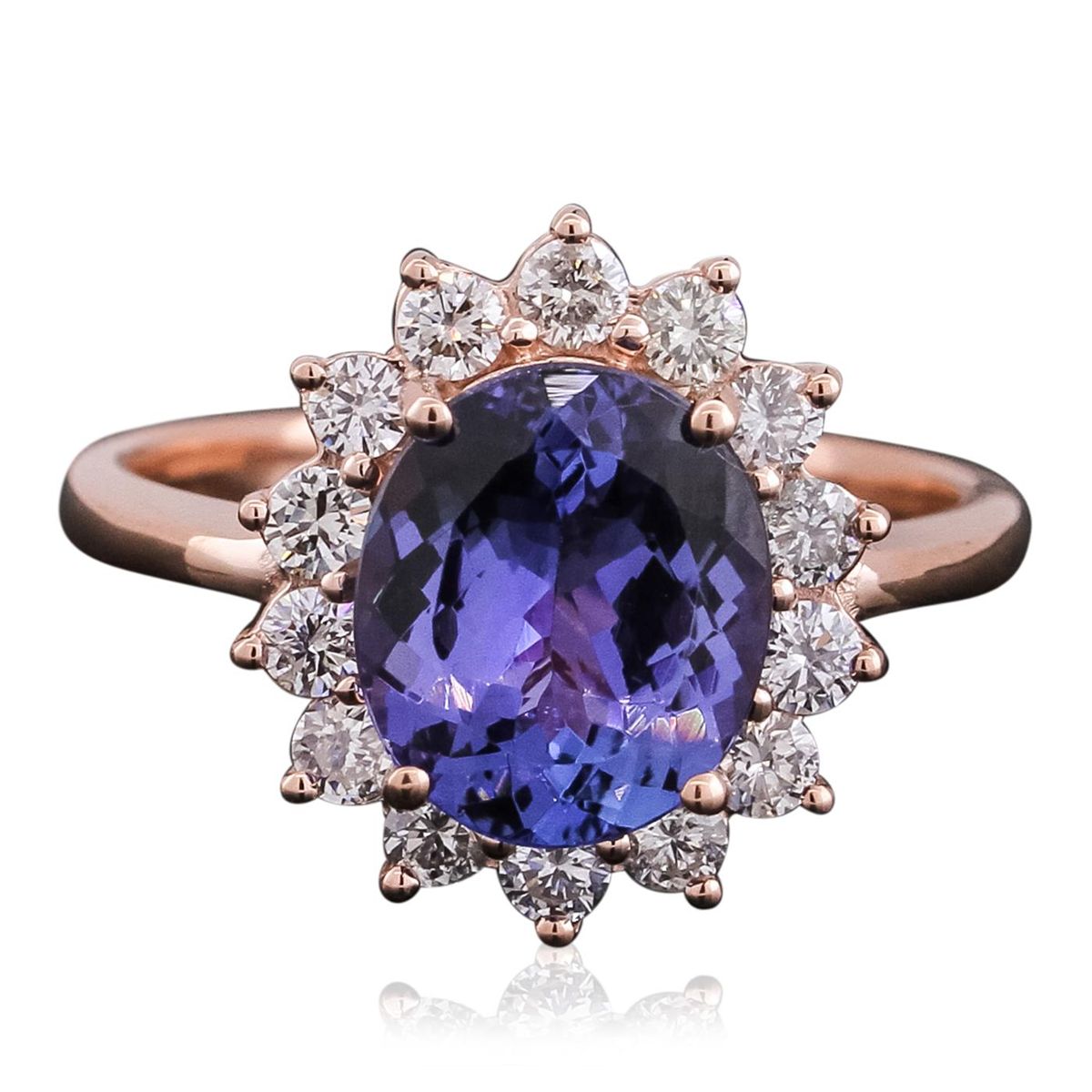 One electronically tested 14KT rose gold ladies combination cast & assembled tanzanite and diamond ring with a flat shank with a bright polish finish. Identified with markings of "14K". Condition is new. Containing: One prong set oval modified brilliant cut natural tanzanite, measuring 9.85 x 8.42 x 4.71mm, approximate weight of 2.63ct., clarity is eye clean, type I, medium, moderately strong, violet color, (GIA V 5/4), cut is very good. Fourteen prong set round brilliant cut diamonds, measuring 2.20 - 2.20 x 1.32mm (depth est.) approximate total weight of 14 Stones = 0.55ct. Clarity: SI-2 to I-1. Color: J - K, Cut is Good. Colored gemstones are presumed to have been subjected to commonly used enhancement processes. All diamonds and colored gemstones are graded in the mounting, unless otherwise stated total weight of Colored Stones 2.63ct. Total Weight of Diamonds 0.55ct. Total Weight of Ring 4.30 grams. GGL Appraised at $5,910.00.