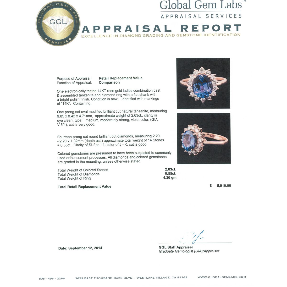 One electronically tested 14KT rose gold ladies combination cast & assembled tanzanite and diamond ring with a flat shank with a bright polish finish. Identified with markings of "14K". Condition is new. Containing: One prong set oval modified brilliant cut natural tanzanite, measuring 9.85 x 8.42 x 4.71mm, approximate weight of 2.63ct., clarity is eye clean, type I, medium, moderately strong, violet color, (GIA V 5/4), cut is very good. Fourteen prong set round brilliant cut diamonds, measuring 2.20 - 2.20 x 1.32mm (depth est.) approximate total weight of 14 Stones = 0.55ct. Clarity: SI-2 to I-1. Color: J - K, Cut is Good. Colored gemstones are presumed to have been subjected to commonly used enhancement processes. All diamonds and colored gemstones are graded in the mounting, unless otherwise stated total weight of Colored Stones 2.63ct. Total Weight of Diamonds 0.55ct. Total Weight of Ring 4.30 grams. GGL Appraised at $5,910.00.