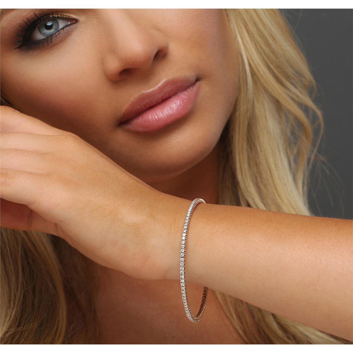 One electronically tested 14KT rose gold ladies cast diamond bangle with a bright polish finish. Seven and one-half inch wearable length bangle features a two and one-half millimeter wide continuous diamond ribbon. Condition is new, good workmanship. Containing: Ninety-Five prong set round brilliant cut diamonds, measuring 2.00 - 1.90 x 1.17mm (depth est.) approximate total weight of 95 Stones = 2.70ct. Graded in the setting. Clarity: VS-2 to SI-2. Color: H - J. Total Weight of Diamonds 2.70ct. Total Weight of Bangle 9.76 grams. AIG Appraised at $10,695.00.