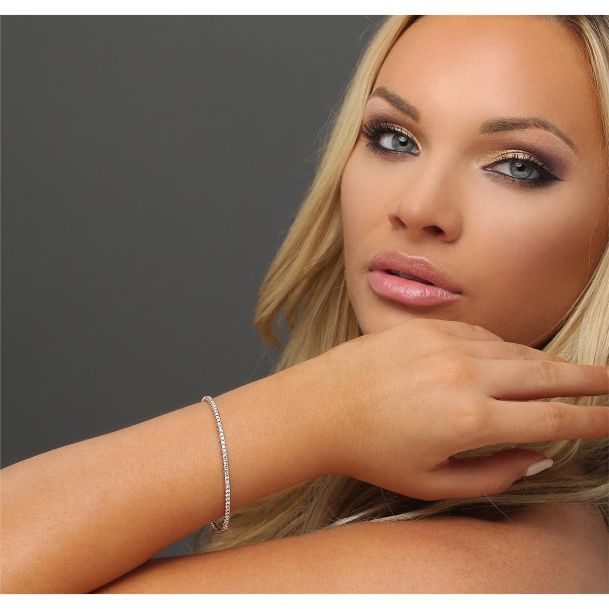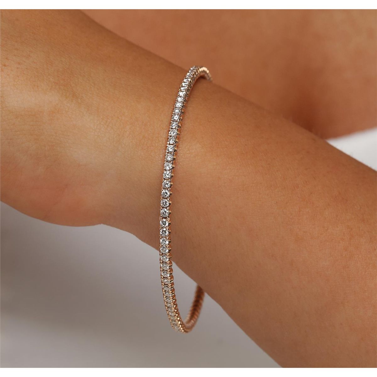 One electronically tested 14KT rose gold ladies cast diamond bangle with a bright polish finish. Seven and one-half inch wearable length bangle features a two and one-half millimeter wide continuous diamond ribbon. Condition is new, good workmanship. Containing: Ninety-Five prong set round brilliant cut diamonds, measuring 2.00 - 1.90 x 1.17mm (depth est.) approximate total weight of 95 Stones = 2.70ct. Graded in the setting. Clarity: VS-2 to SI-2. Color: H - J. Total Weight of Diamonds 2.70ct. Total Weight of Bangle 9.76 grams. AIG Appraised at $10,695.00.