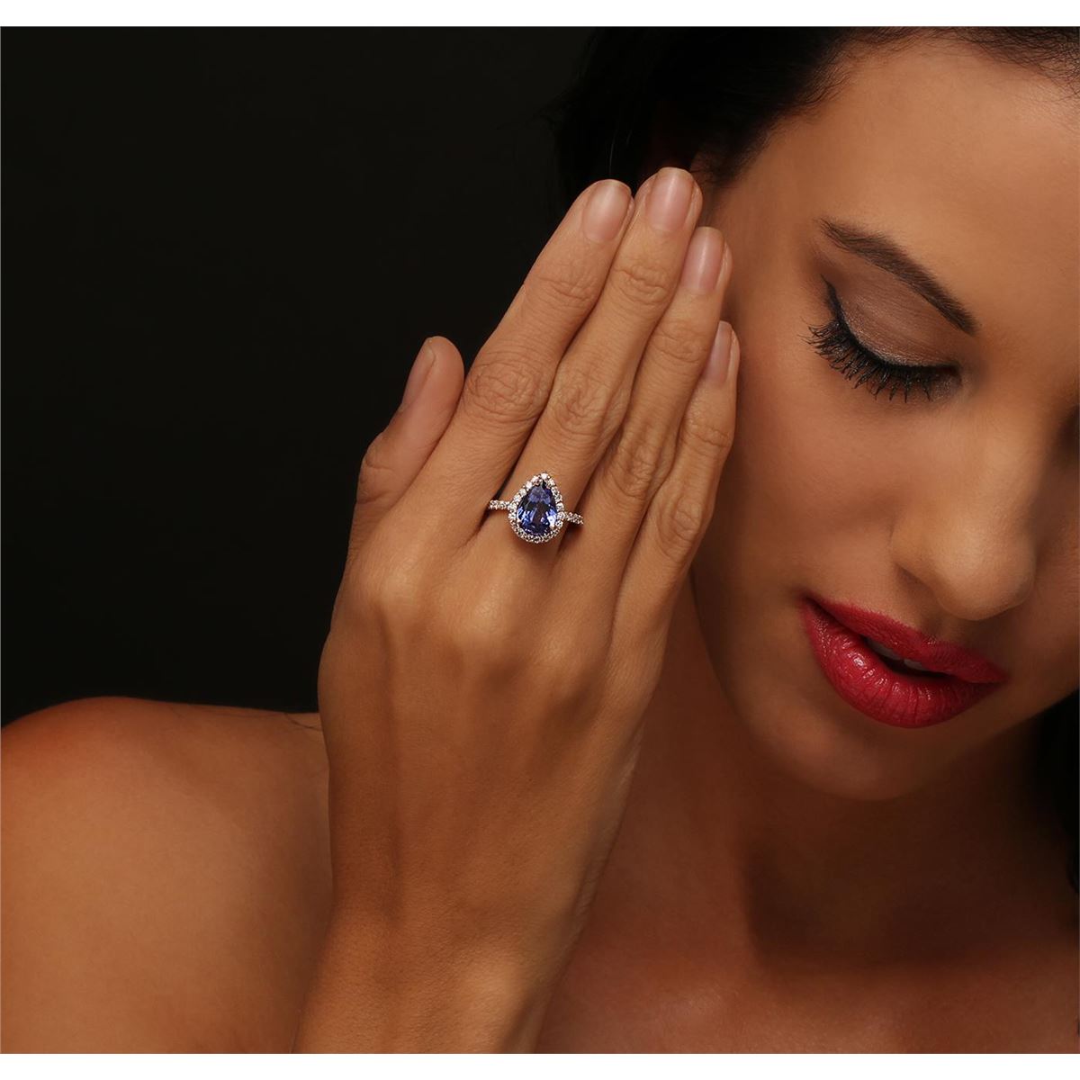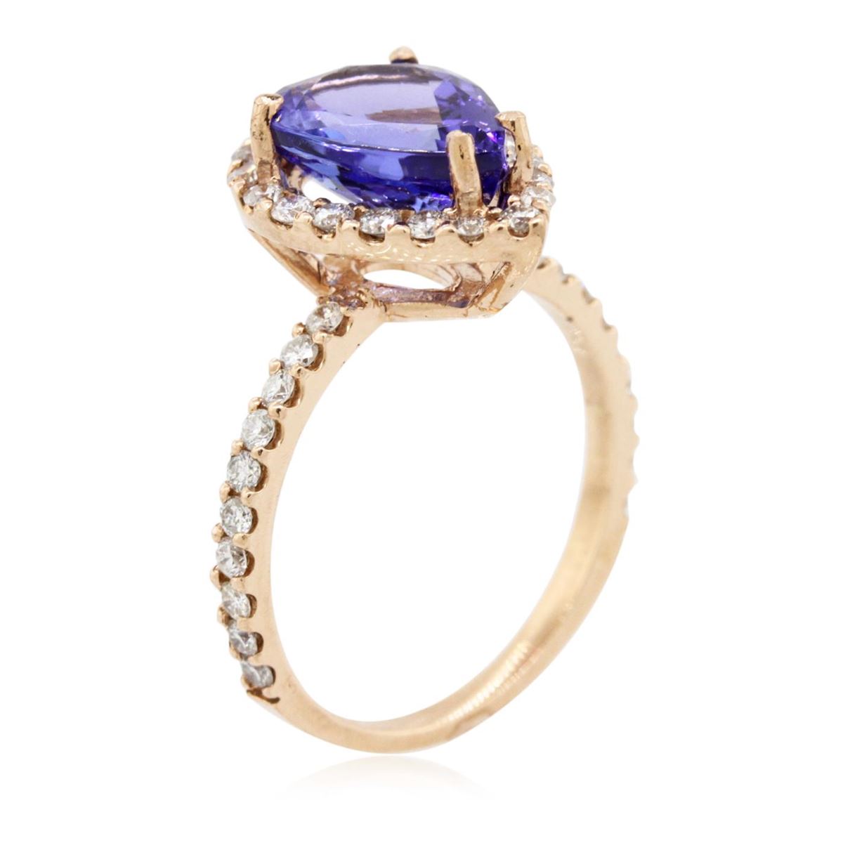 One electronically tested 14KT rose gold Ladies combination cast & assembled ring with a bright polish finish. Condition is new. Identified with markings of "14K". Containing: One prong set pear modified brilliant cut natural tanzanite, measuring 10.09 x 7.95 x 5.16mm, approximate. Total Weight of 2.77ct., clarity is eye clean, type I, medium, moderately strong, bluish violet color, (GIA bV 5/4), cut is good. Forty prong set round brilliant cut diamonds, measuring 1.50 - 1.50 x 0.90mm (depth est.) approximate. Total Weight of 40 Stones = 0.49ct. Clarity: I-1 to I-2. Color: I - J, Cut is Good. Colored gemstones are presumed to have been subjected to commonly used enhancement processes. All diamonds and colored gemstones are graded in the mounting, unless otherwise stated. Total Weight of Colored Stones 2.77ct. Total Weight of Diamonds 0.49ct. Total Weight of Ring 3.70 grams. GGL Appraised at $5,910.00.
