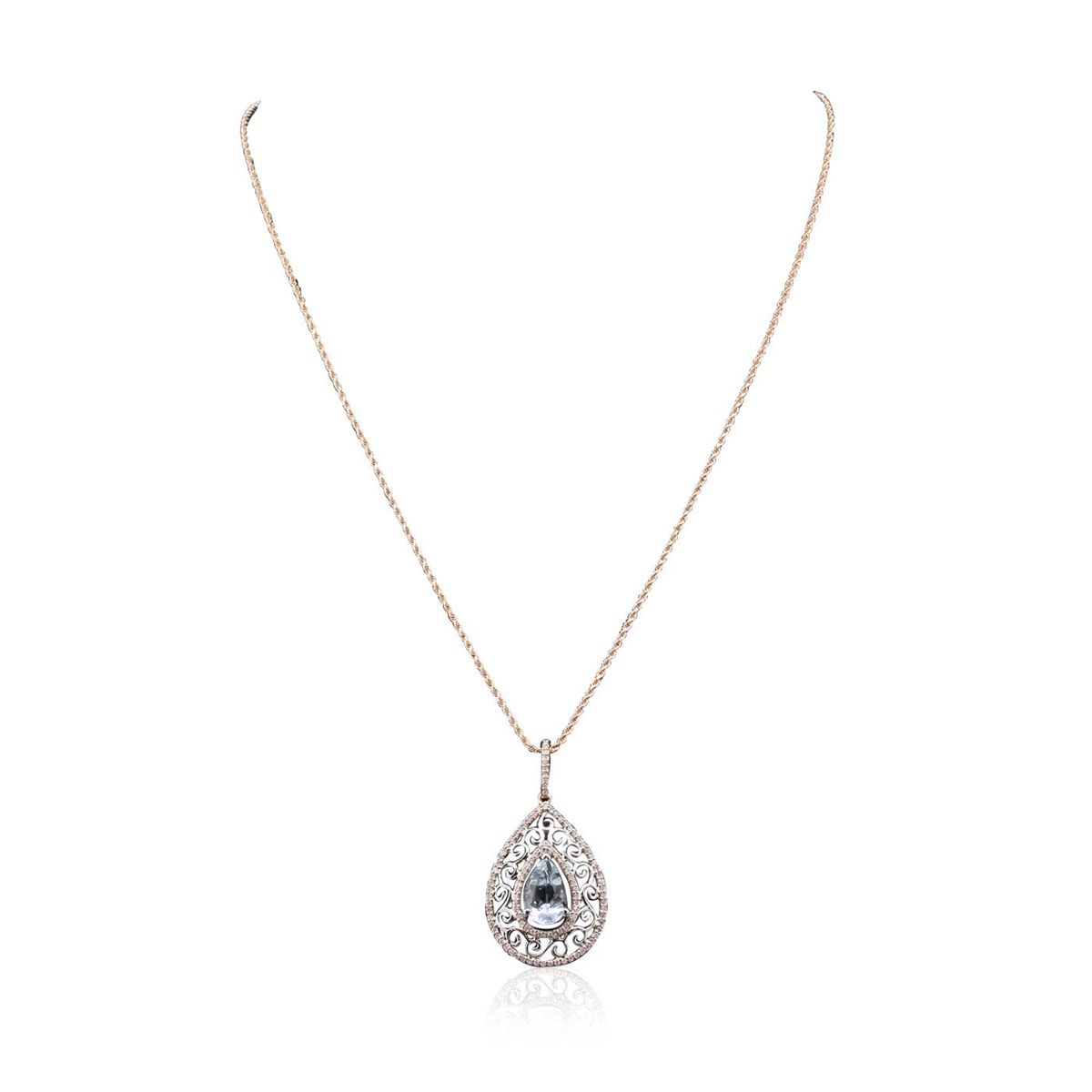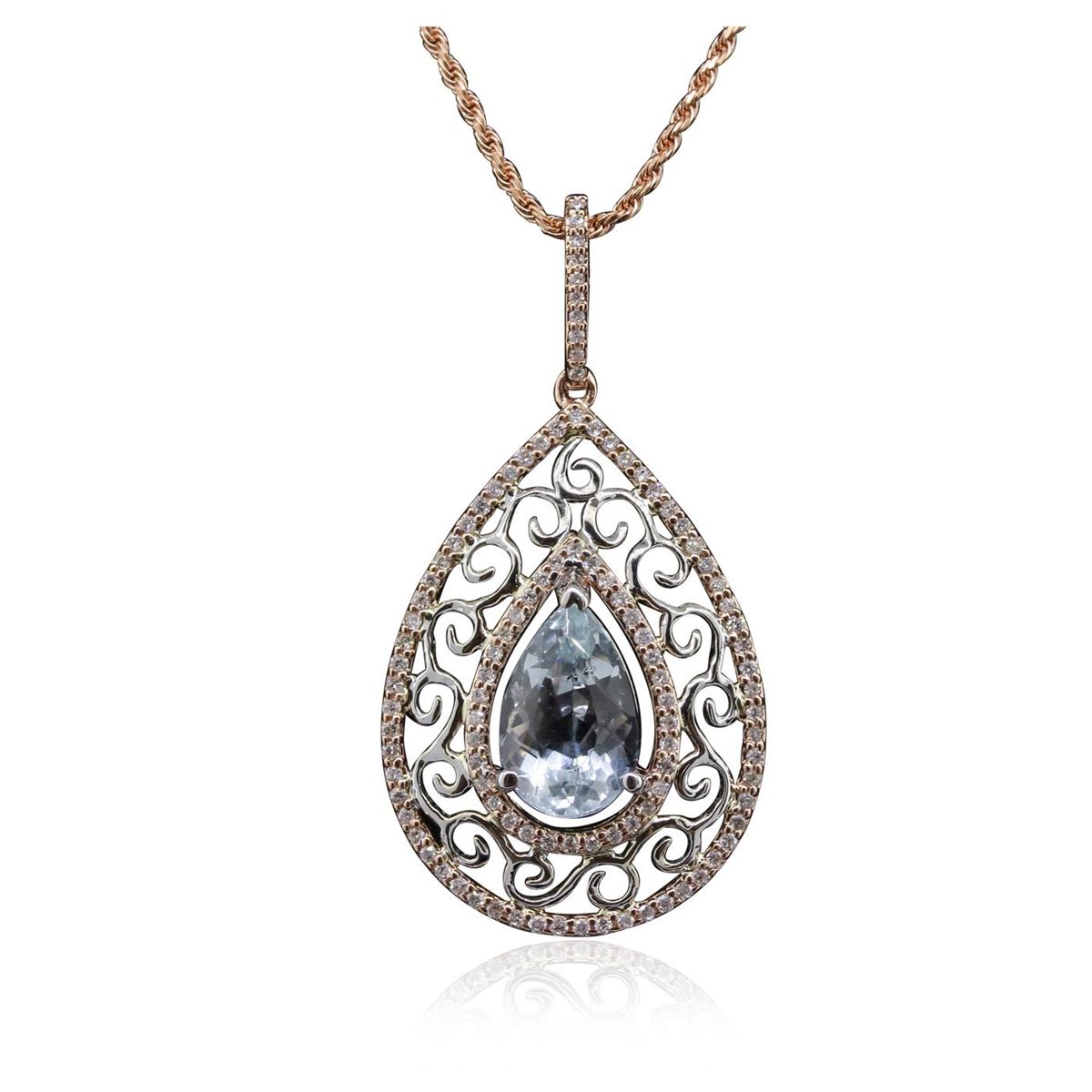 One electronically tested 14KT rose gold ladies cast & assembled aquamarine and diamond pendant with chain. Condition is new, good workmanship. The pendant features an aquamarine set within a diamond bezel, completed by a diamond bail. The pendant is supported by an eighteen inch length 14KT rose gold designer style chain, terminating in a lobster claw clasp. Bright polish finish, with rhodium accents. Trademark is PMI. Identified with markings of "14K". Containing: One prong set oval mixed cut natural aquamarine, measuring 11.30 x 7.30 x 5.55mm, 6%. bulge factor, approximate weight of 2.77ct., clarity is slightly included, type I, medium, very slightly grayish, very slightly greenish blue color, (GIA vslgB 5/3), cut is good. Transmitting light with a minimum of distortion, transparent. Naturally occurring internal & external characteristics are present. Graded in the setting. One Hundred Five prong set round brilliant cut diamonds, measuring 0.90 - 0.90 x 0.54mm (depth est.) approximate. Total Weight of 105 Stones = 0.38ct. Graded in the setting. Clarity: I-1 to I-2. Color: G - I. Total Weight of Colored Stones 2.77ct. Total Weight of Diamonds 0.38ct. Total Weight of Pendant With Chain 7.50 grams. AIG Appraised at $4,365.00.