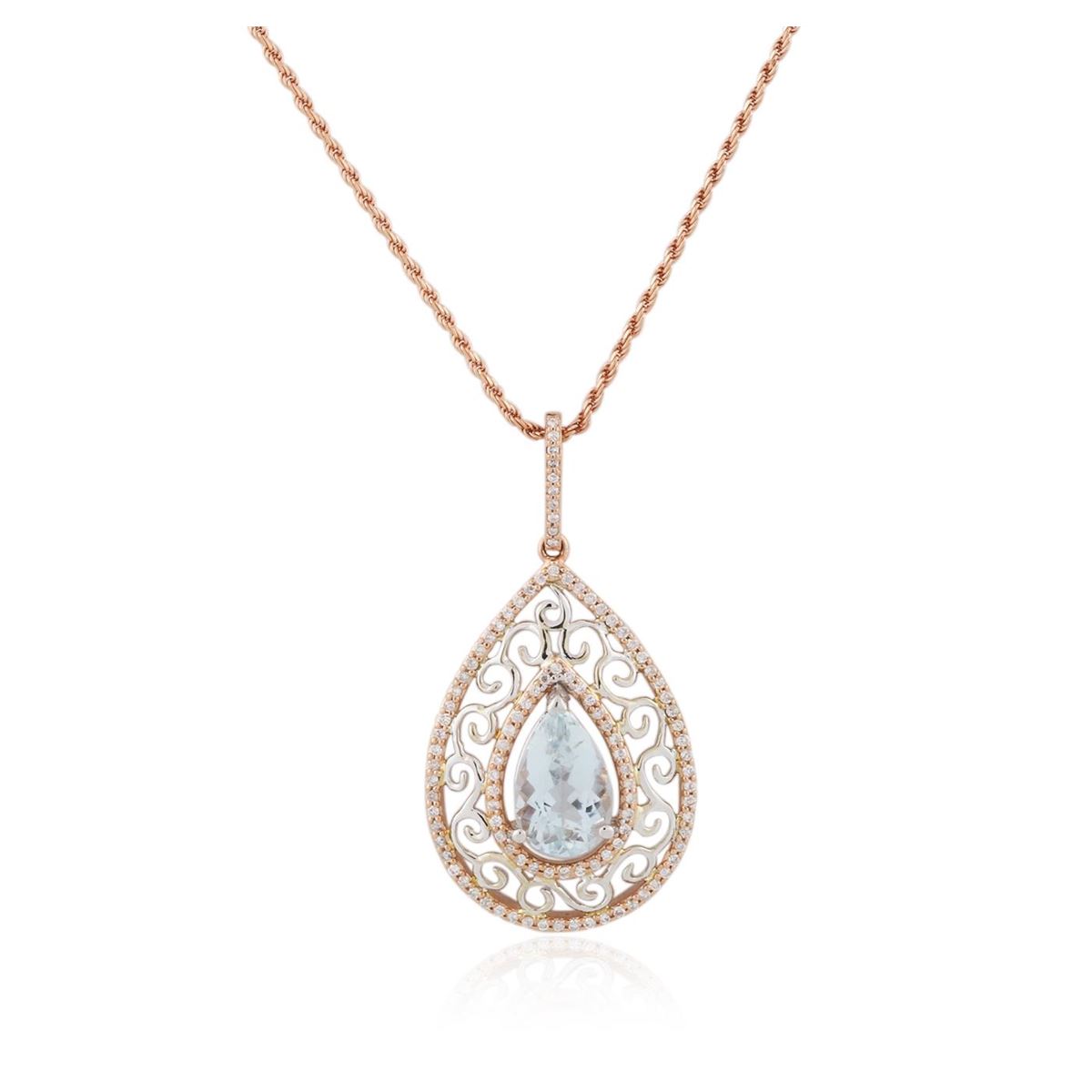 One electronically tested 14KT rose gold ladies cast & assembled aquamarine and diamond pendant with chain. Condition is new, good workmanship. The pendant features an aquamarine set within a diamond bezel, completed by a diamond bail. The pendant is supported by an eighteen inch length 14KT rose gold designer style chain, terminating in a lobster claw clasp. Bright polish finish, with rhodium accents. Trademark is PMI. Identified with markings of "14K". Containing: One prong set oval mixed cut natural aquamarine, measuring 11.30 x 7.30 x 5.55mm, 6%. bulge factor, approximate weight of 2.77ct., clarity is slightly included, type I, medium, very slightly grayish, very slightly greenish blue color, (GIA vslgB 5/3), cut is good. Transmitting light with a minimum of distortion, transparent. Naturally occurring internal & external characteristics are present. Graded in the setting. One Hundred Five prong set round brilliant cut diamonds, measuring 0.90 - 0.90 x 0.54mm (depth est.) approximate. Total Weight of 105 Stones = 0.38ct. Graded in the setting. Clarity: I-1 to I-2. Color: G - I. Total Weight of Colored Stones 2.77ct. Total Weight of Diamonds 0.38ct. Total Weight of Pendant With Chain 7.50 grams. AIG Appraised at $4,365.00.