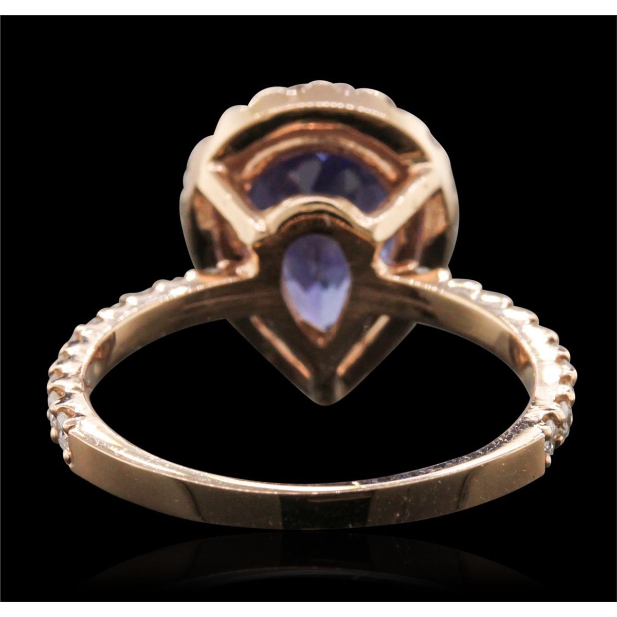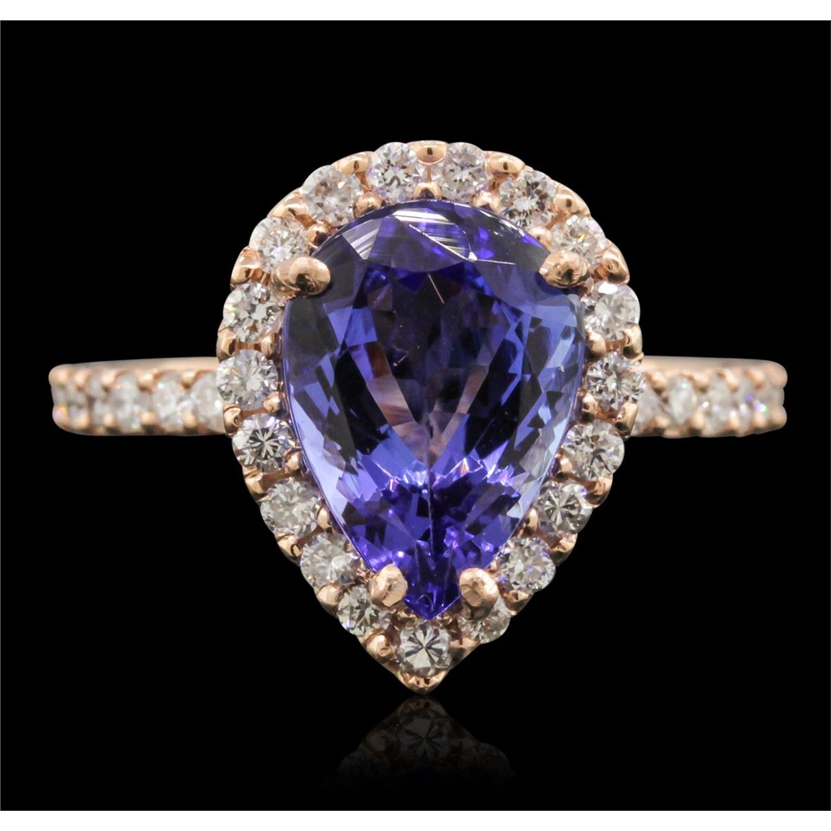 One electronically tested 14KT rose gold Ladies combination cast & assembled ring with a bright polish finish. Condition is new. Identified with markings of "14K". Containing: One prong set pear modified brilliant cut natural tanzanite, measuring 10.09 x 7.95 x 5.16mm, approximate. Total Weight of 2.77ct., clarity is eye clean, type I, medium, moderately strong, bluish violet color, (GIA bV 5/4), cut is good. Forty prong set round brilliant cut diamonds, measuring 1.50 - 1.50 x 0.90mm (depth est.) approximate. Total Weight of 40 Stones = 0.49ct. Clarity: I-1 to I-2. Color: I - J, Cut is Good. Colored gemstones are presumed to have been subjected to commonly used enhancement processes. All diamonds and colored gemstones are graded in the mounting, unless otherwise stated. Total Weight of Colored Stones 2.77ct. Total Weight of Diamonds 0.49ct. Total Weight of Ring 3.70 grams. GGL Appraised at $5,910.00.