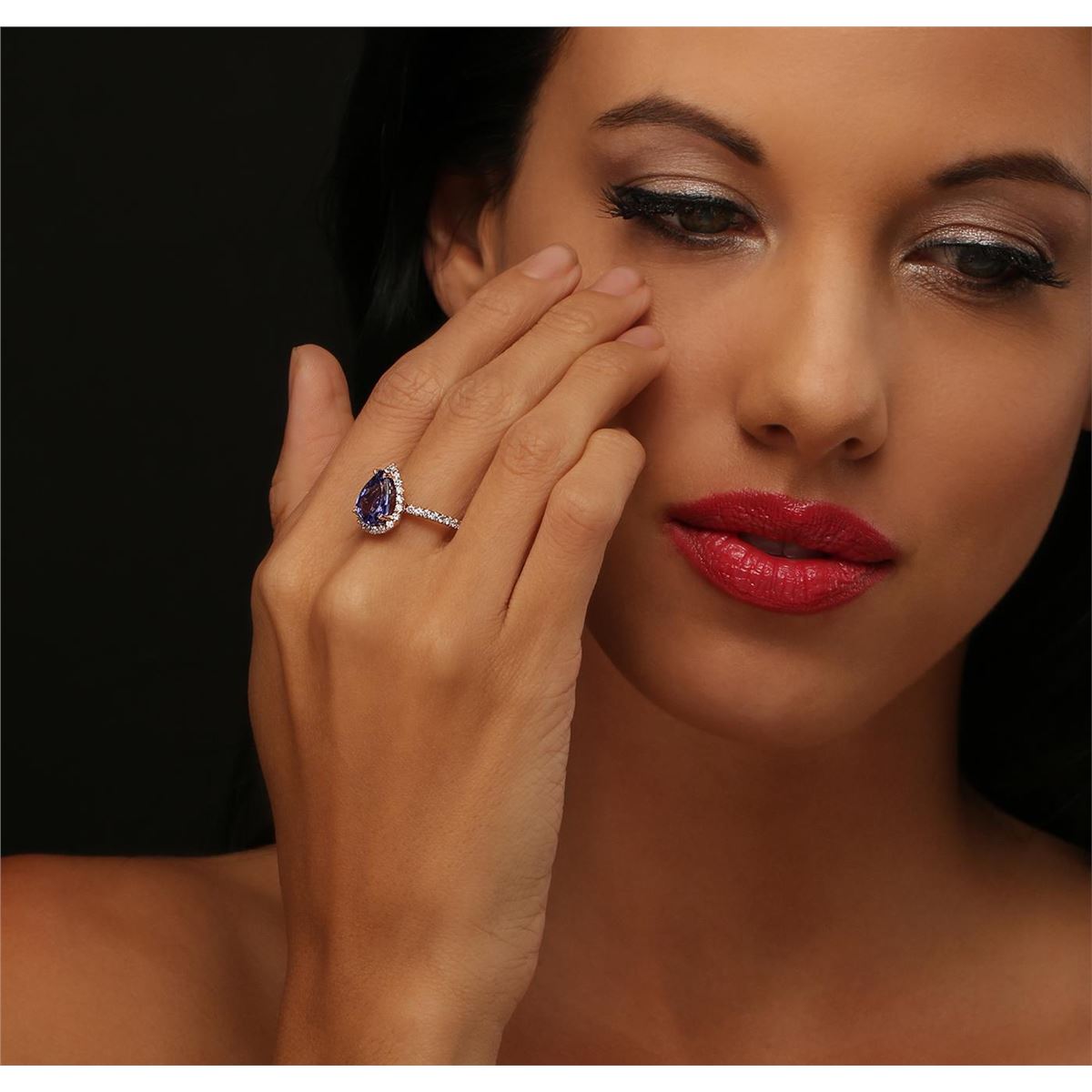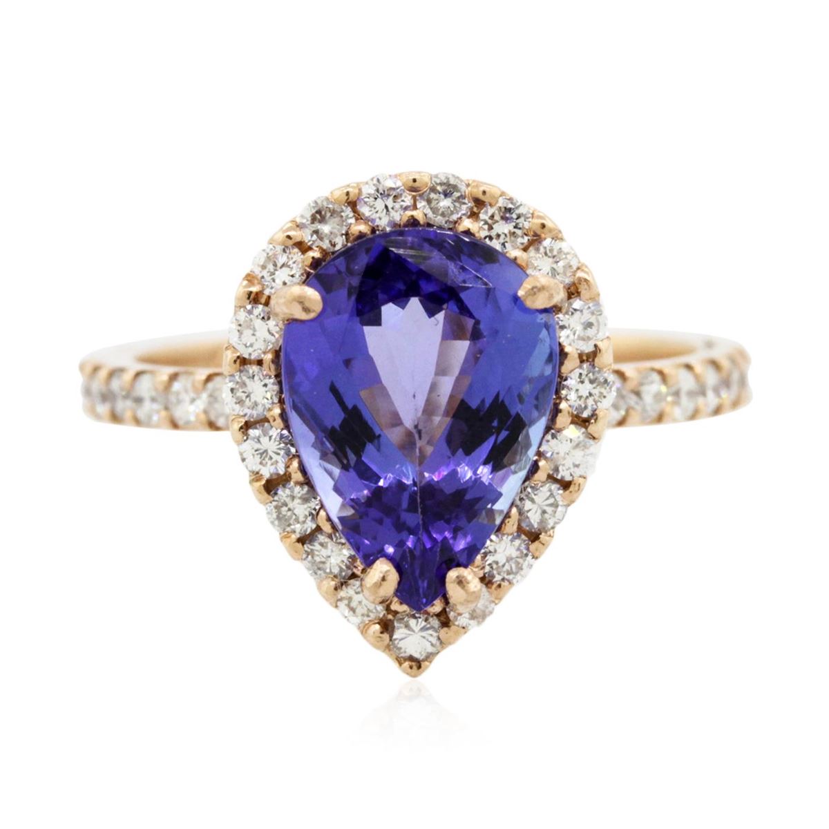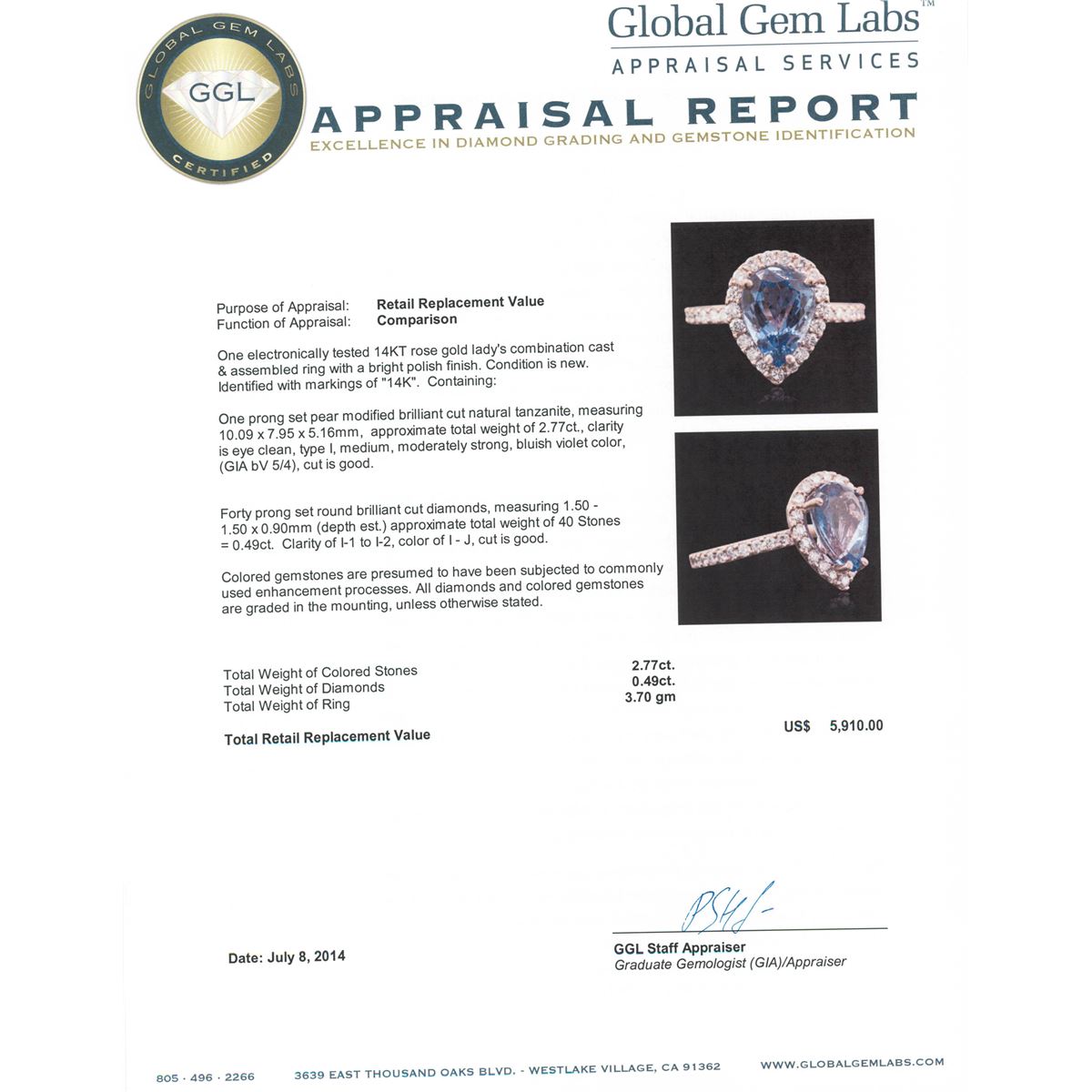 One electronically tested 14KT rose gold Ladies combination cast & assembled ring with a bright polish finish. Condition is new. Identified with markings of "14K". Containing: One prong set pear modified brilliant cut natural tanzanite, measuring 10.09 x 7.95 x 5.16mm, approximate. Total Weight of 2.77ct., clarity is eye clean, type I, medium, moderately strong, bluish violet color, (GIA bV 5/4), cut is good. Forty prong set round brilliant cut diamonds, measuring 1.50 - 1.50 x 0.90mm (depth est.) approximate. Total Weight of 40 Stones = 0.49ct. Clarity: I-1 to I-2. Color: I - J, Cut is Good. Colored gemstones are presumed to have been subjected to commonly used enhancement processes. All diamonds and colored gemstones are graded in the mounting, unless otherwise stated. Total Weight of Colored Stones 2.77ct. Total Weight of Diamonds 0.49ct. Total Weight of Ring 3.70 grams. GGL Appraised at $5,910.00.