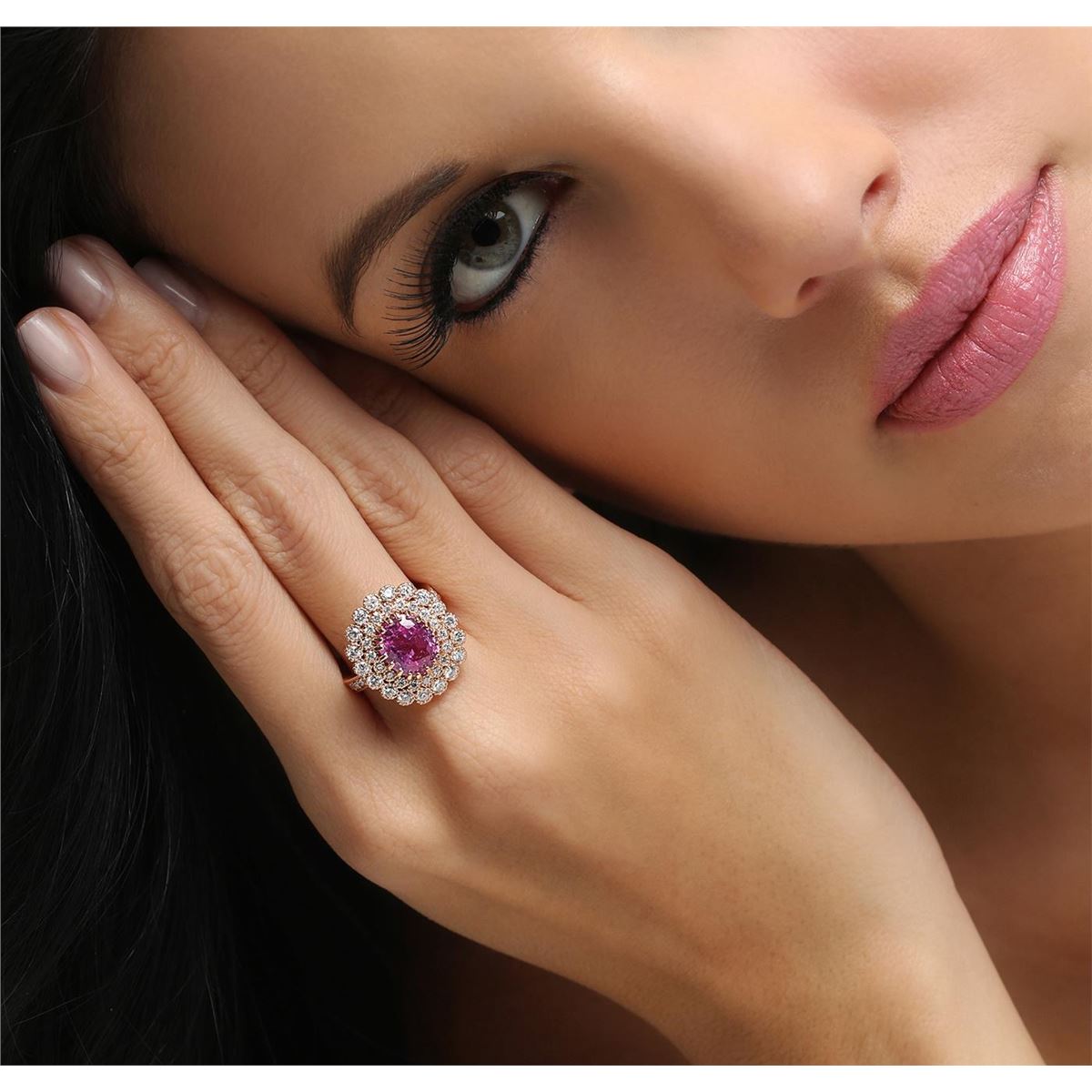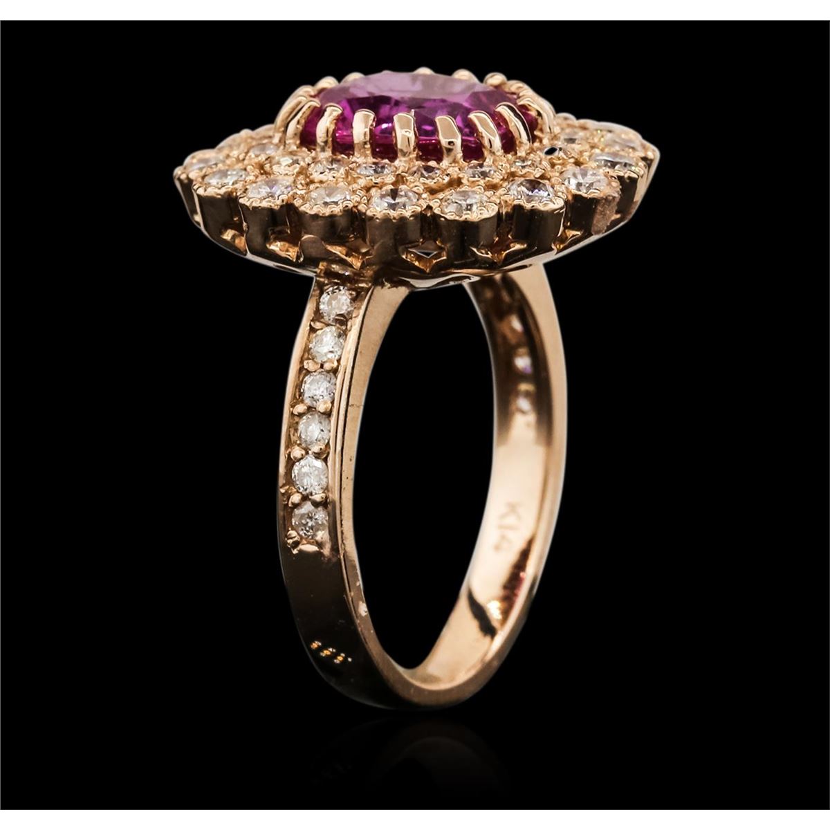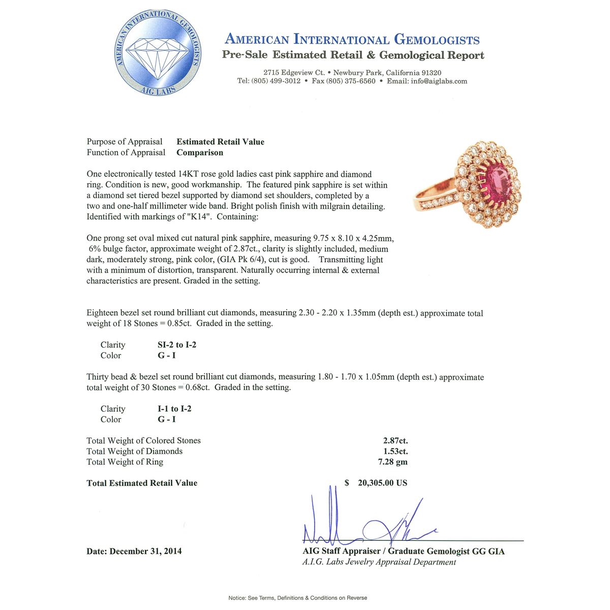 One electronically tested 14KT rose gold ladies cast pink sapphire and diamond ring. The featured pink sapphire is set within a diamond set tiered bezel supported by diamond set shoulders, completed by a two and one-half millimeter wide band. Bright polish finish with milgrain detailing. Identified with markings of "K14". Condition is new, good workmanship. Containing: One prong set oval mixed cut natural pink sapphire, measuring 9.75 x 8.10 x 4.25mm, 6% bulge factor, approximate weight of 2.87ct., clarity is slightly included, medium dark, moderately strong, pink color, (GIA Pk 6/4), cut is good. Transmitting light with a minimum of distortion, transparent. Naturally occurring internal & external characteristics are present. Graded in the setting. Eighteen bezel set round brilliant cut diamonds, measuring 2.30 - 2.20 x 1.35mm (depth est.) approximate total weight of 18 Stones = 0.85ct. Graded in the setting. Clarity: SI-2 to I-2. Color: G - I Thirty bead & bezel set round brilliant cut diamonds, measuring 1.80 - 1.70 x 1.05mm (depth est.) approximate total weight of 30 Stones = 0.68ct. Graded in the setting. Clarity: I-1 to I-2. Color: G - I. Total Weight of Colored Stones 2.87ct. Total Weight of Diamonds 1.53ct. Total Weight of Ring 7.28 grams. AIG Appraised at $20,305.00.