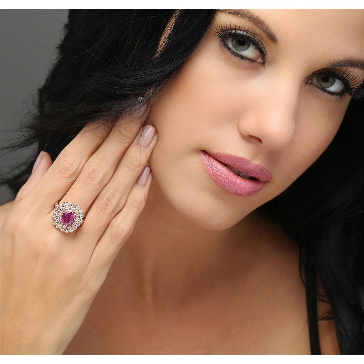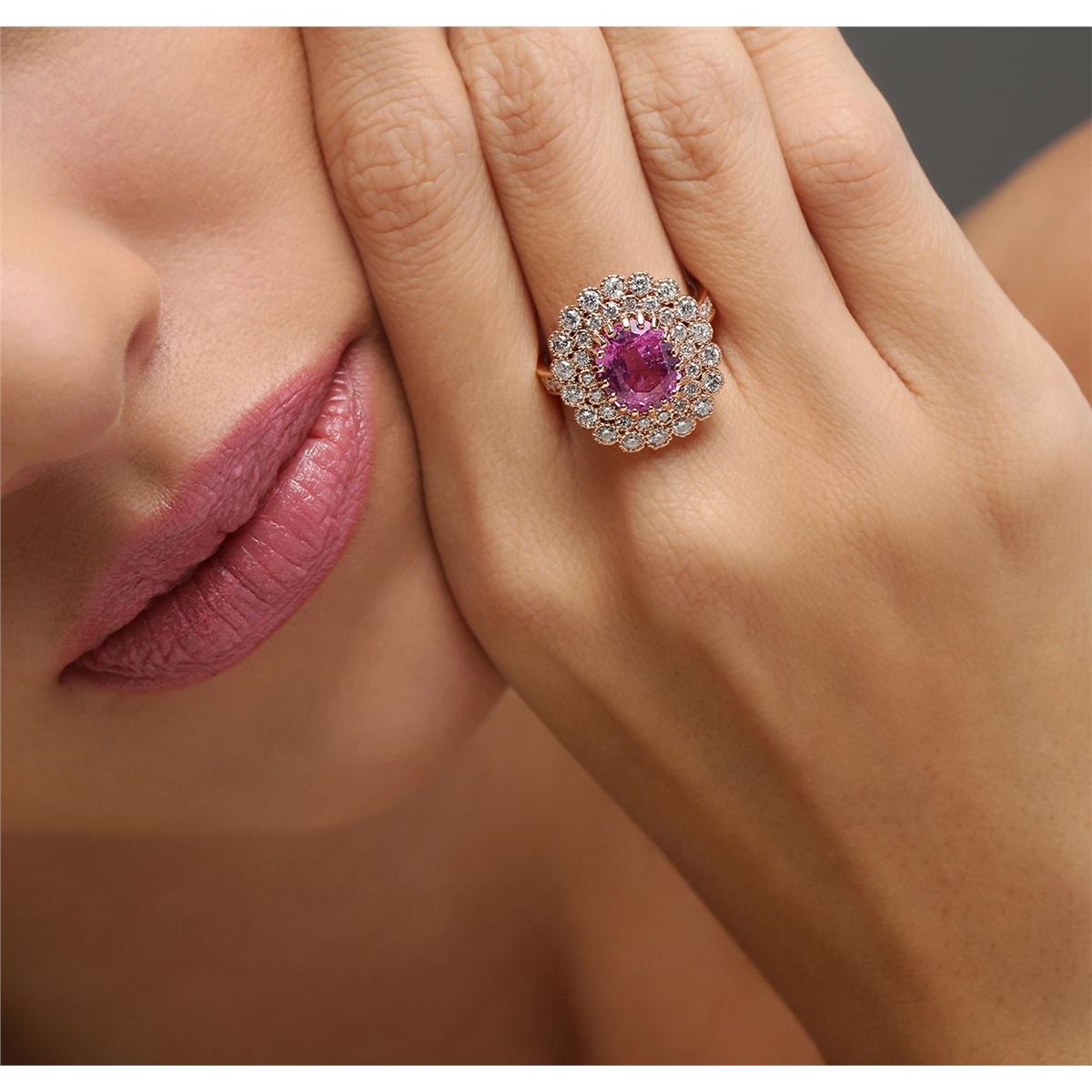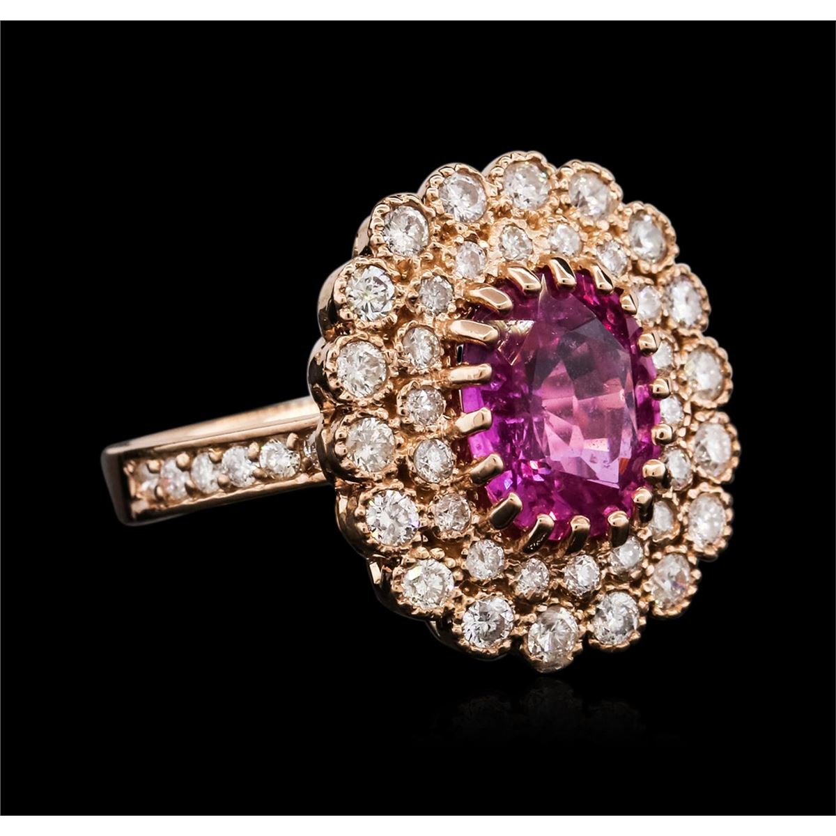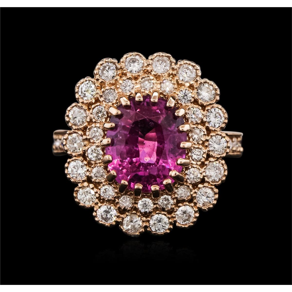 One electronically tested 14KT rose gold ladies cast pink sapphire and diamond ring. The featured pink sapphire is set within a diamond set tiered bezel supported by diamond set shoulders, completed by a two and one-half millimeter wide band. Bright polish finish with milgrain detailing. Identified with markings of "K14". Condition is new, good workmanship. Containing: One prong set oval mixed cut natural pink sapphire, measuring 9.75 x 8.10 x 4.25mm, 6% bulge factor, approximate weight of 2.87ct., clarity is slightly included, medium dark, moderately strong, pink color, (GIA Pk 6/4), cut is good. Transmitting light with a minimum of distortion, transparent. Naturally occurring internal & external characteristics are present. Graded in the setting. Eighteen bezel set round brilliant cut diamonds, measuring 2.30 - 2.20 x 1.35mm (depth est.) approximate total weight of 18 Stones = 0.85ct. Graded in the setting. Clarity: SI-2 to I-2. Color: G - I Thirty bead & bezel set round brilliant cut diamonds, measuring 1.80 - 1.70 x 1.05mm (depth est.) approximate total weight of 30 Stones = 0.68ct. Graded in the setting. Clarity: I-1 to I-2. Color: G - I. Total Weight of Colored Stones 2.87ct. Total Weight of Diamonds 1.53ct. Total Weight of Ring 7.28 grams. AIG Appraised at $20,305.00.