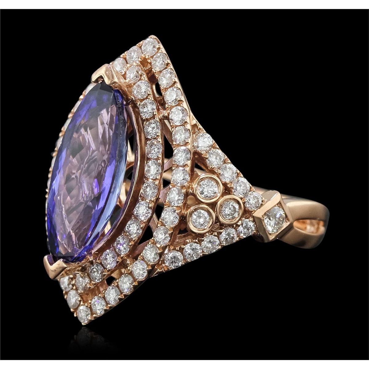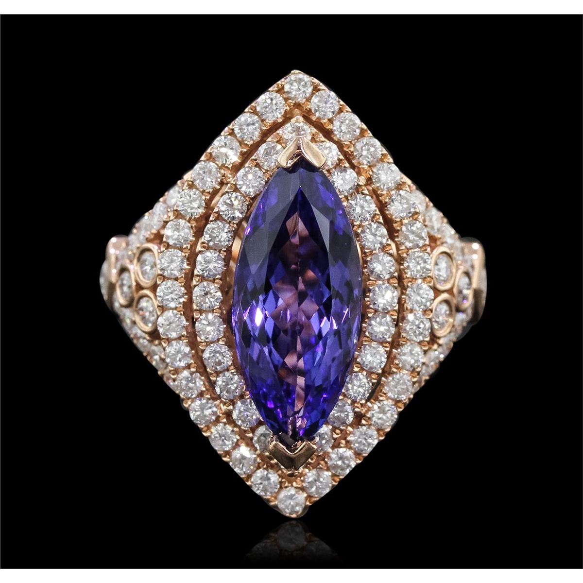 One electronically tested 14KT rose gold Ladies combination cast & assembled ring with a bright polish finish. Condition is new. Identified with markings of "14K". Containing: One prong set marquise modified brilliant cut natural tanzanite, measuring 17.00 x 6.50 x 4.08mm, approximate weight of 2.87ct., clarity is eye clean, type I, medium light, very slightly grayish, bluish violet color, (GIA bV 4/3), cut is good. Colored gemstones are presumed to have been subjected to commonly used color/clarity enhancement processes. Two prong set round brilliant cut diamonds, measuring 2.20 - 2.20 x 1.32mm (depth est.) approximate. Total Weight of 2 Stones = 0.08ct. Clarity: SI-1 to SI-2. Color: H - I, Cut is Good. Eighty prong set round brilliant cut diamonds, measuring 1.50 - 1.50 x 0.90mm (depth est.) approximate. Total Weight of 80 Stones = 0.98ct. Clarity: SI-2. Color: H - I, Cut is Good. Total Weight of Colored Stones 2.87ct. Total Weight of Diamonds 1.06ct. Total Weight of Ring 7.70 grams. GGL Appraised at $10,165.00.