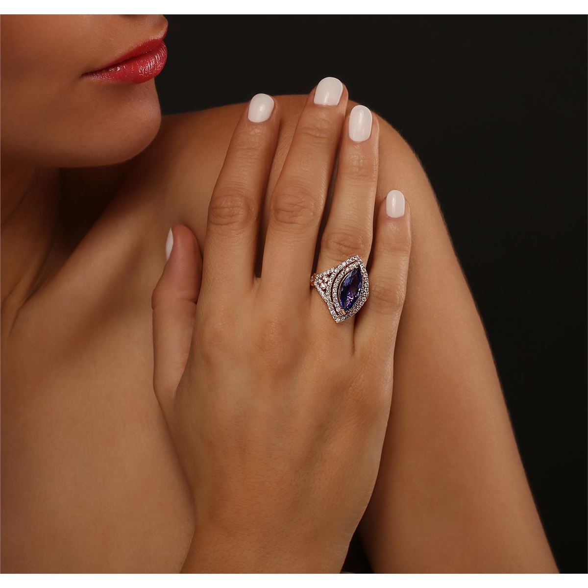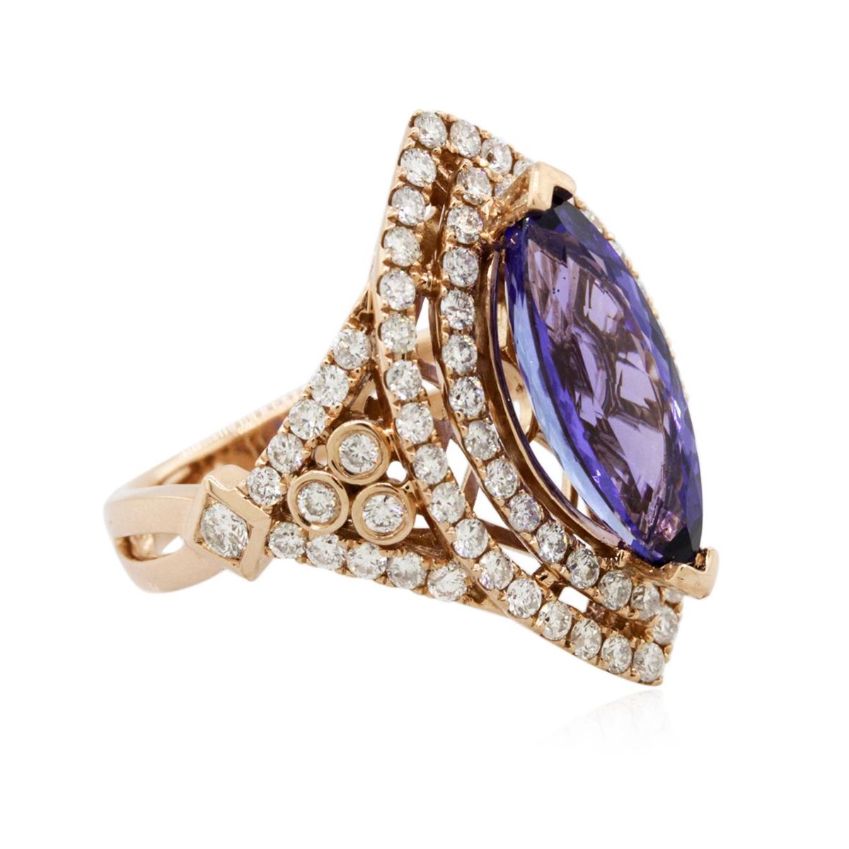 One electronically tested 14KT rose gold Ladies combination cast & assembled ring with a bright polish finish. Condition is new. Identified with markings of "14K". Containing: One prong set marquise modified brilliant cut natural tanzanite, measuring 17.00 x 6.50 x 4.08mm, approximate weight of 2.87ct., clarity is eye clean, type I, medium light, very slightly grayish, bluish violet color, (GIA bV 4/3), cut is good. Colored gemstones are presumed to have been subjected to commonly used color/clarity enhancement processes. Two prong set round brilliant cut diamonds, measuring 2.20 - 2.20 x 1.32mm (depth est.) approximate. Total Weight of 2 Stones = 0.08ct. Clarity: SI-1 to SI-2. Color: H - I, Cut is Good. Eighty prong set round brilliant cut diamonds, measuring 1.50 - 1.50 x 0.90mm (depth est.) approximate. Total Weight of 80 Stones = 0.98ct. Clarity: SI-2. Color: H - I, Cut is Good. Total Weight of Colored Stones 2.87ct. Total Weight of Diamonds 1.06ct. Total Weight of Ring 7.70 grams. GGL Appraised at $10,165.00.