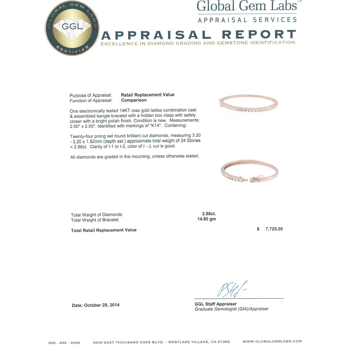 One electronically tested 14KT rose gold ladies combination cast & assembled bangle bracelet with a hidden box clasp with safety closer with a bright polish finish. Measurements: 2.50 x 2.00. Identified with markings of K14. Condition is new. Containing: Twenty-Four prong set round brilliant cut diamonds, measuring 3.20 - 3.20 x 1.92mm (depth est.) approximate total weight of 24 Stones = 2.88ct. Clarity: I-1 to I-2. Color: I - J, Cut is Good. All diamonds are graded in the mounting, unless otherwise stated. Total Weight of Diamonds 2.88ct. Total Weight of Bracelet 14.80 grams. GGL Appraised at $7,725.00.