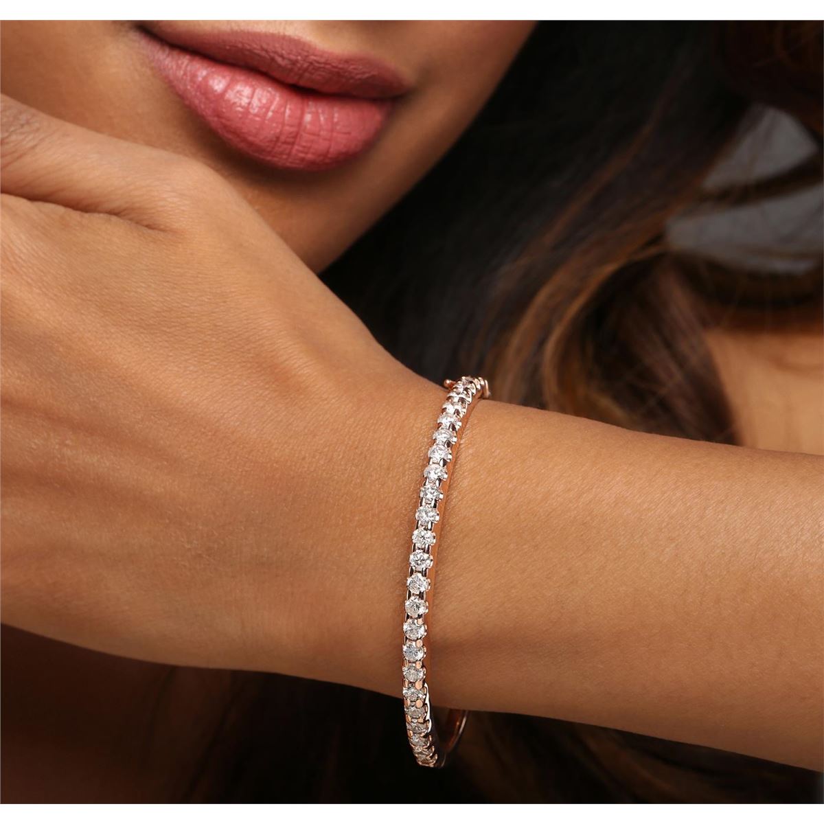 One electronically tested 14KT rose gold ladies combination cast & assembled bangle bracelet with a hidden box clasp with safety closer with a bright polish finish. Measurements: 2.50 x 2.00. Identified with markings of K14. Condition is new. Containing: Twenty-Four prong set round brilliant cut diamonds, measuring 3.20 - 3.20 x 1.92mm (depth est.) approximate total weight of 24 Stones = 2.88ct. Clarity: I-1 to I-2. Color: I - J, Cut is Good. All diamonds are graded in the mounting, unless otherwise stated. Total Weight of Diamonds 2.88ct. Total Weight of Bracelet 14.80 grams. GGL Appraised at $7,725.00.