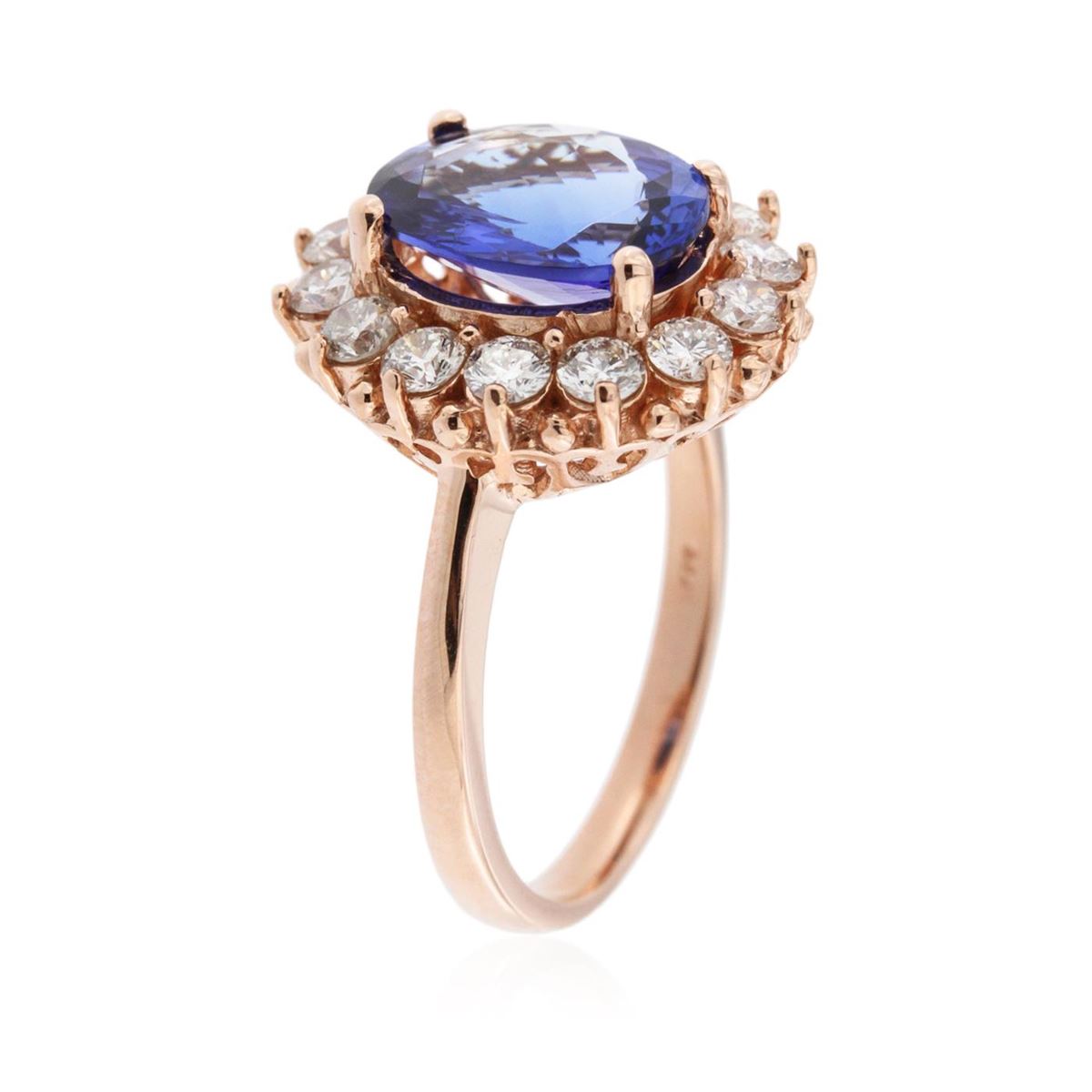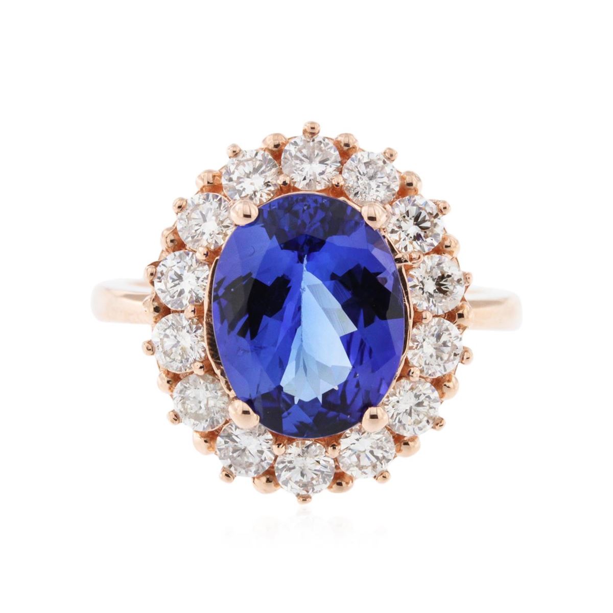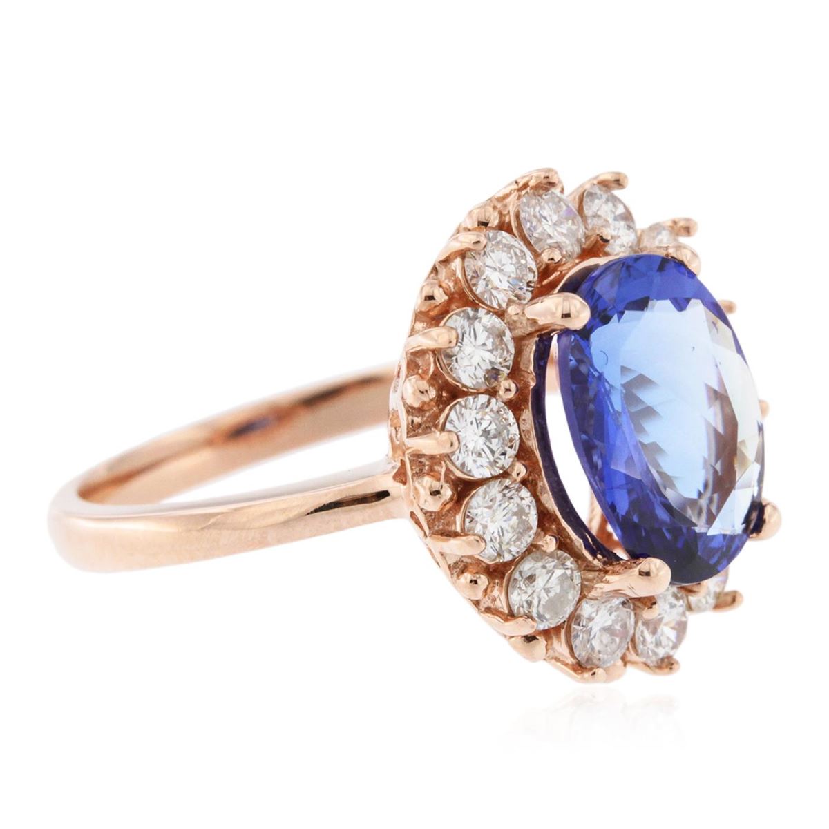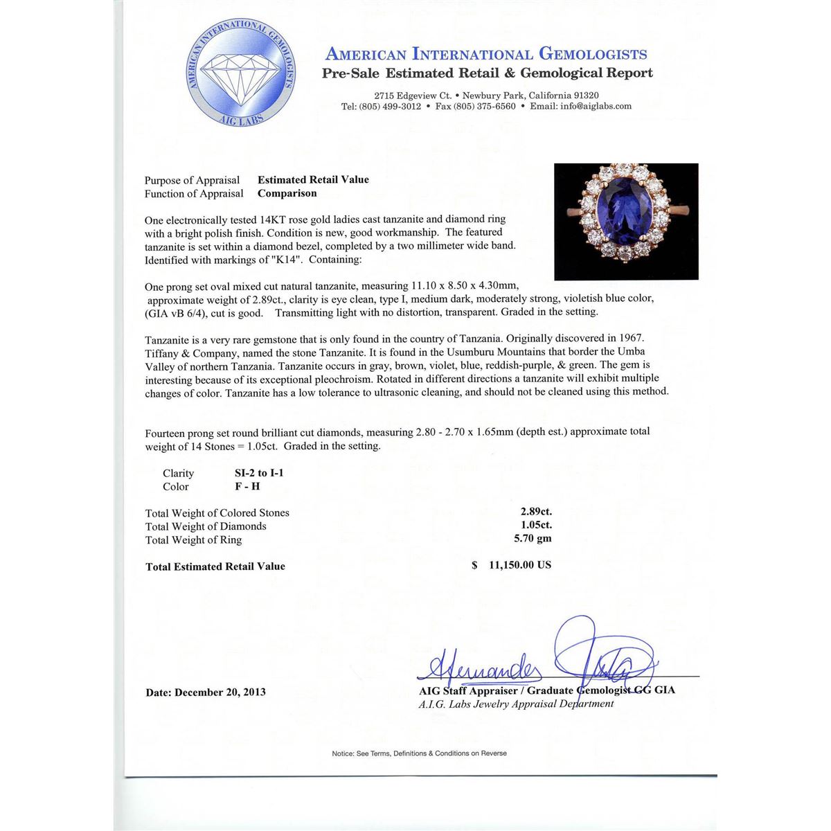 14KT rose gold 2.89ct Tanzanite and Diamond Ring A6669. One electronically tested 14KT rose gold ladies cast tanzanite and diamond ring with a bright polish finish. The featured tanzanite is set within a diamond bezel, completed by a two millimeter wide band. Identified with markings of "K14". Condition is new, good workmanship. Containing: One prong set oval mixed cut natural tanzanite, measuring 11.10 x 8.50 x 4.30mm, approximate weight of 2.89ct., clarity is eye clean, type I, medium dark, moderately strong, violetish blue color, (GIA vB 6/4), cut is good. Transmitting light with no distortion, transparent. Graded in the setting.Tanzanite is a very rare gemstone that is only found in the country of Tanzania. Originally discovered in 1967. Tiffany & Company, named the stone Tanzanite. It is found in the Usumburu Mountains that border the Umba Valley of northern Tanzania. Tanzanite occurs in gray, brown, violet, blue, reddish-purple, & green. The gem is interesting because of its exceptional pleochroism. Rotated in different directions a tanzanite will exhibit multiple changes of color. Tanzanite has a low tolerance to ultrasonic cleaning, and should not be cleaned using this method.Fourteen prong set round brilliant cut diamonds, measuring 2.80 - 2.70 x 1.65mm (depth est.) approximate. Total Weight of 14 Stones = 1.05ct. Graded in the setting. Clarity: SI-2 to I-1. Color: F - H. Total Weight of Colored Stones 2.89ct. Total Weight of Diamonds 1.05ct. AIG Appraised at $11,150.00.
