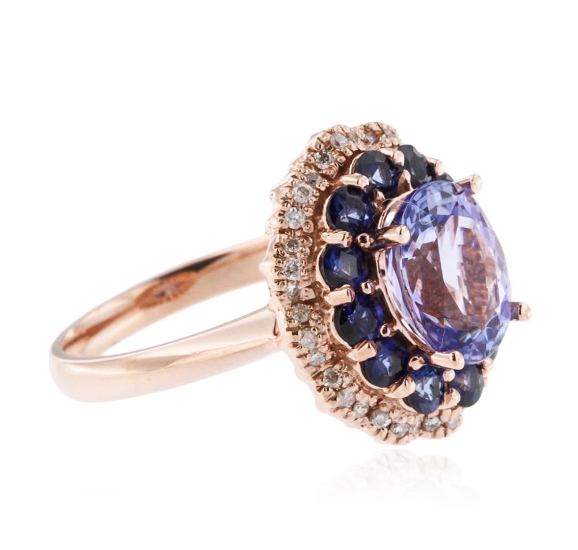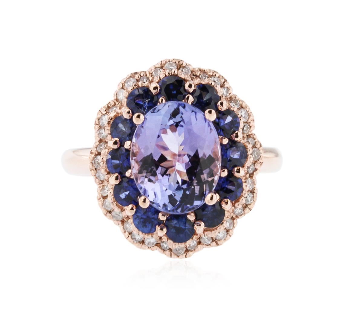 One electronically tested 14KT rose gold ladies cast tanzanite, sapphire and diamond ring with a bright polish finish. Identified with markings of "K14". Condition is new. Containing: One prong set oval modified brilliant cut natural tanzanite, measuring 9.90 x 8.00 x 5.20mm, approximate weight of 2.90ct., clarity is eye clean, type I, medium light, very slightly grayish, violet color, (GIA V 4/3), cut is good. Twelve prong set round modified brilliant cut natural blue sapphires, measuring 2.80 - 2.80 x 1.83 mm, approximate total weight of 1.32ct., clarity is slightly included, type II, medium, moderately strong, blue color, (GIA B 5/4), cut is good. Thirty-Nine prong set round brilliant cut diamonds, measuring 1.00 - 1.00 x 0.60mm (depth est.) approximate total weight of 39 Stones = 0.14ct. Clarity: I-2. Color: J - K, Cut is Good. Colored gemstones are presumed to have been subjected to commonly used enhancement processes. All diamonds and colored gemstones are graded in the mounting, unless otherwise stated. Total Weight of Colored Stones 4.22ct. Total Weight of Diamonds 0.14ct. Total Weight of Ring 6.90 grams. GGL Appraised at $3,730.00.