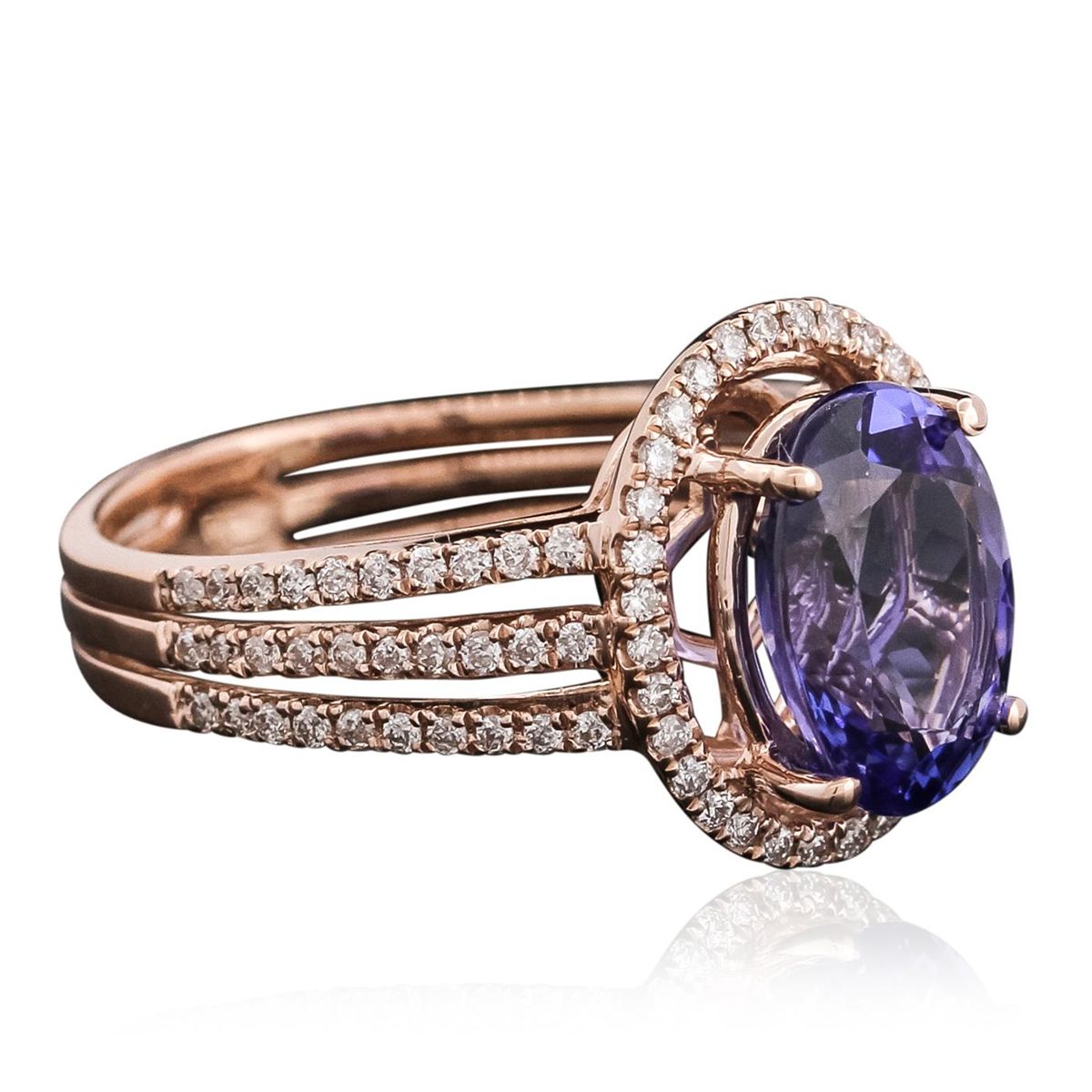 One electronically tested 14KT rose gold ladies combination cast & assembled tanzanite and diamond ring with a split shank with a bright polish finish. Identified with markings of "14K". Condition is new. Containing: One prong set oval modified brilliant cut natural tanzanite, measuring 10.48 x 7.91 x 5.16mm, approximate weight of 2.92ct., clarity is eye clean, type I, medium, moderately strong, violet color, (GIA V 5/4), cut is good. Ninety-Two prong set round brilliant cut diamonds, measuring 1.10 - 1.10 x 0.66mm (depth est.) approximate total weight of 92 Stones = 0.44ct. Clarity: I-1 to I-2. Color: I - J, Cut is Good. Colored gemstones are presumed to have been subjected to commonly used enhancement processes. All diamonds and colored gemstones are graded in the mounting, unless otherwise stated total weight of Colored Stones 2.92ct. Total Weight of Diamonds 0.44ct. Total Weight of Ring 4.80 grams. GGL Appraised at $6,785.00.