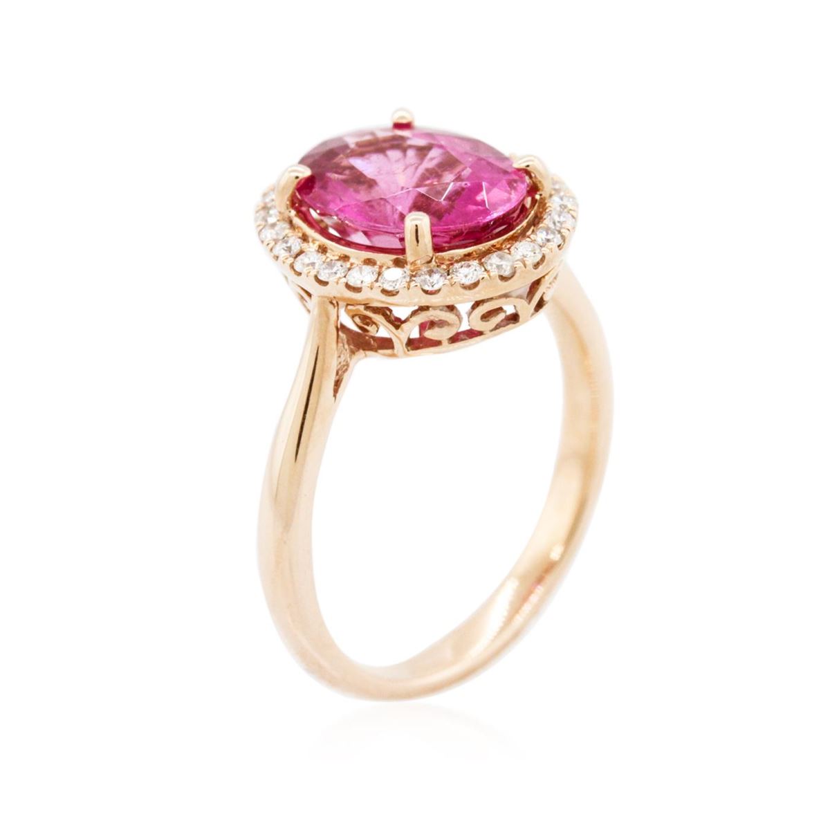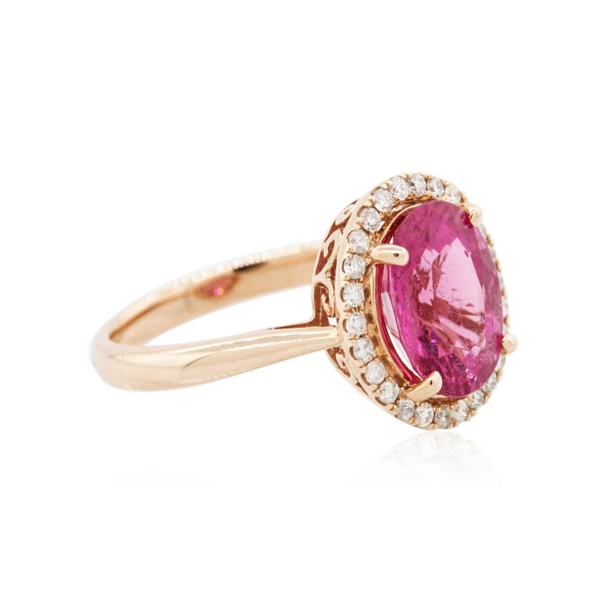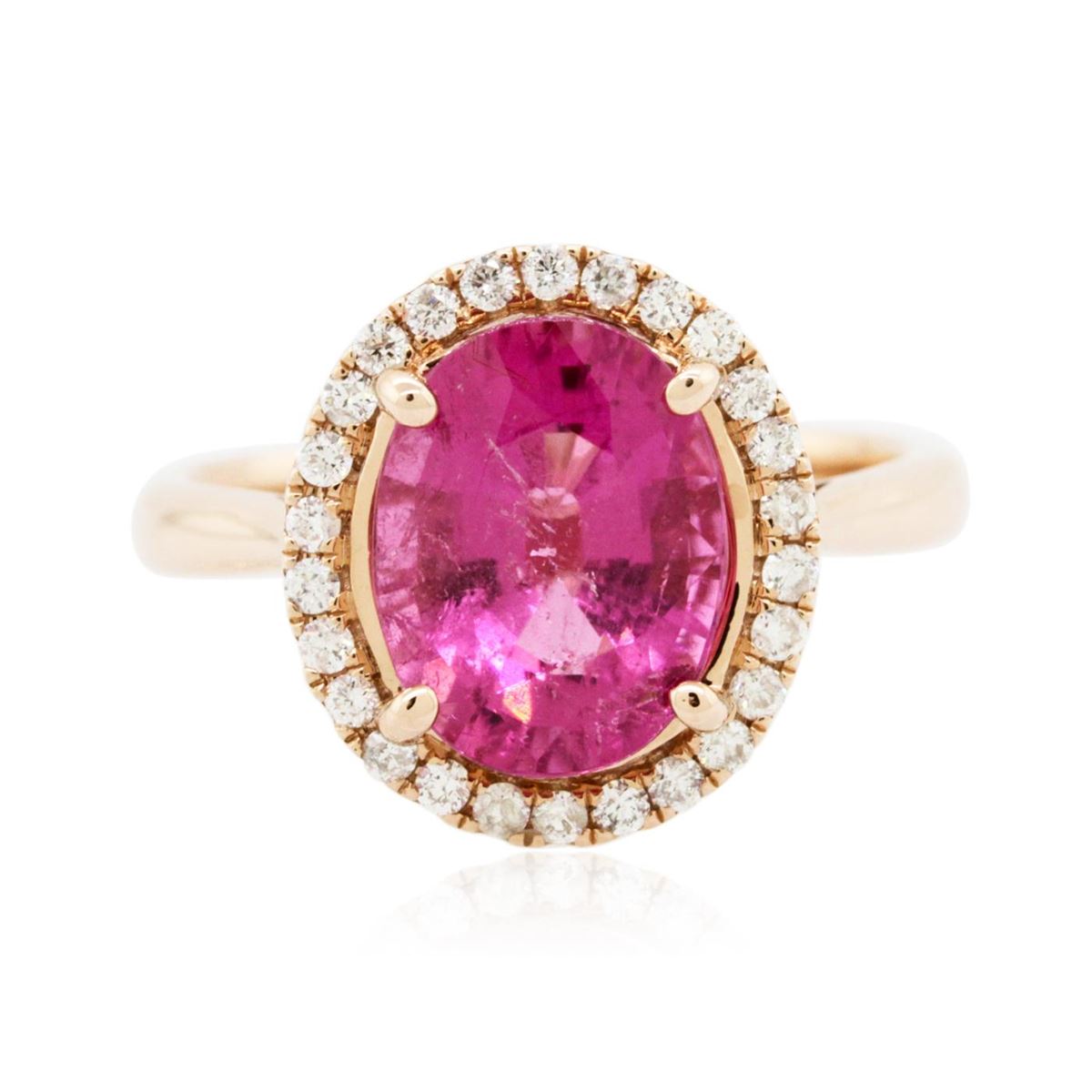 One electronically tested 14KT rose gold ladies cast tourmaline and diamond ring with a bright polish finish. Condition is new, good workmanship. The featured tourmaline is set within a diamond bezel supported by tapering shoulders, completed by a two and one-half millimeter wide band. Identified with markings of "14K".  Containing: One prong set oval mixed cut natural pink tourmaline, measuring 10.60 x 8.10 x 5.25mm, 5%. bulge factor, approximate weight of 2.95ct., type II Clarity is moderately included, medium dark, very slightly brownish, purplish pink color, (GIA pPi 6/3), cut is good. Naturally occurring internal & external characteristics are present. Graded in the setting. Twenty-Six prong set round brilliant cut diamonds, measuring 1.50 - 1.40 x 0.87mm (depth est.) approximate. Total Weight of 26 Stones = 0.39ct. Graded in the setting. Clarity: SI-1 to I-1. Color: G - I. Total Weight of Colored Stones 2.95ct. Total Weight of Diamonds 0.39ct. Total Weight of Ring 4.09grams. AIG Appraised at $2,830.00.